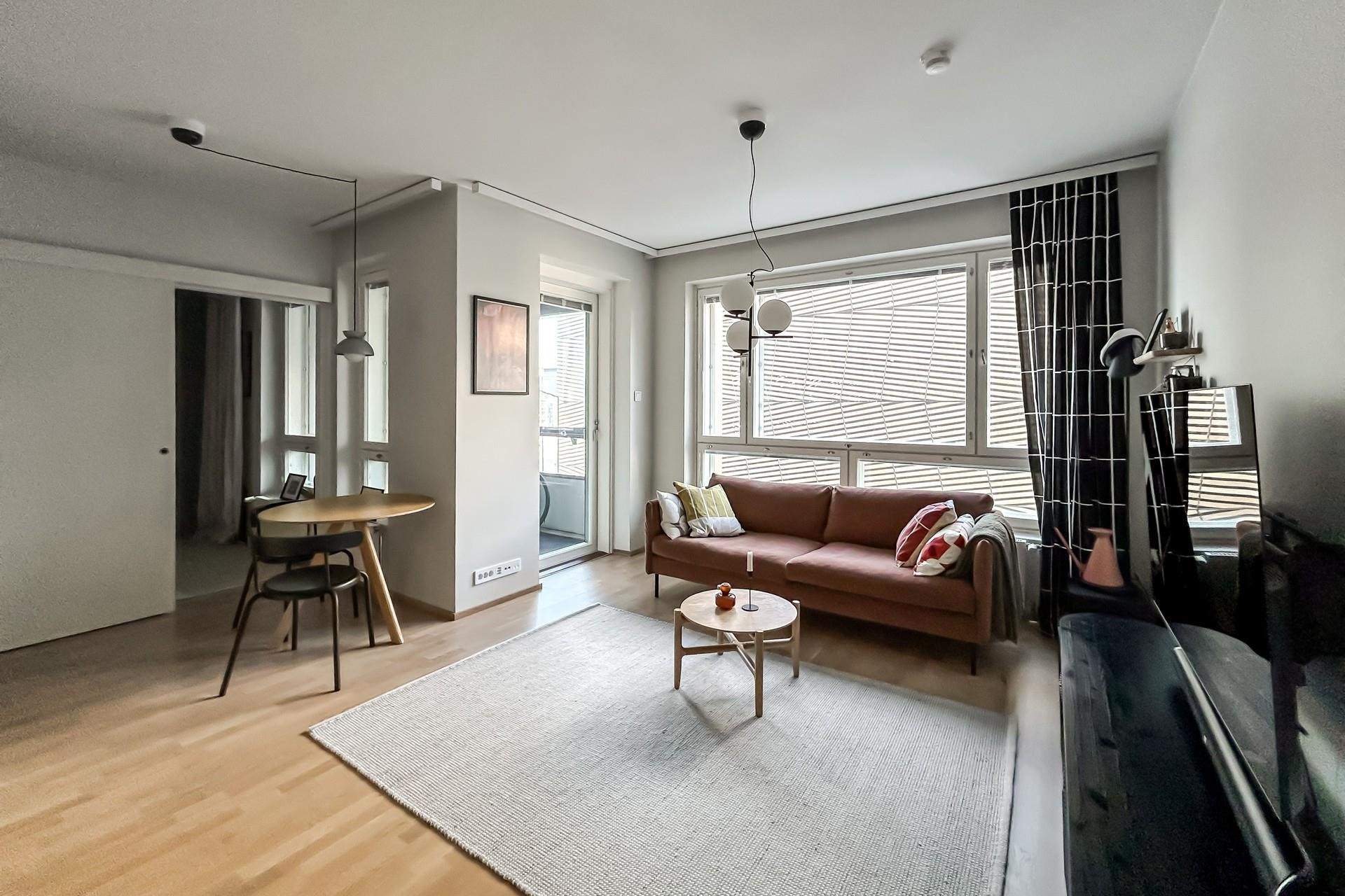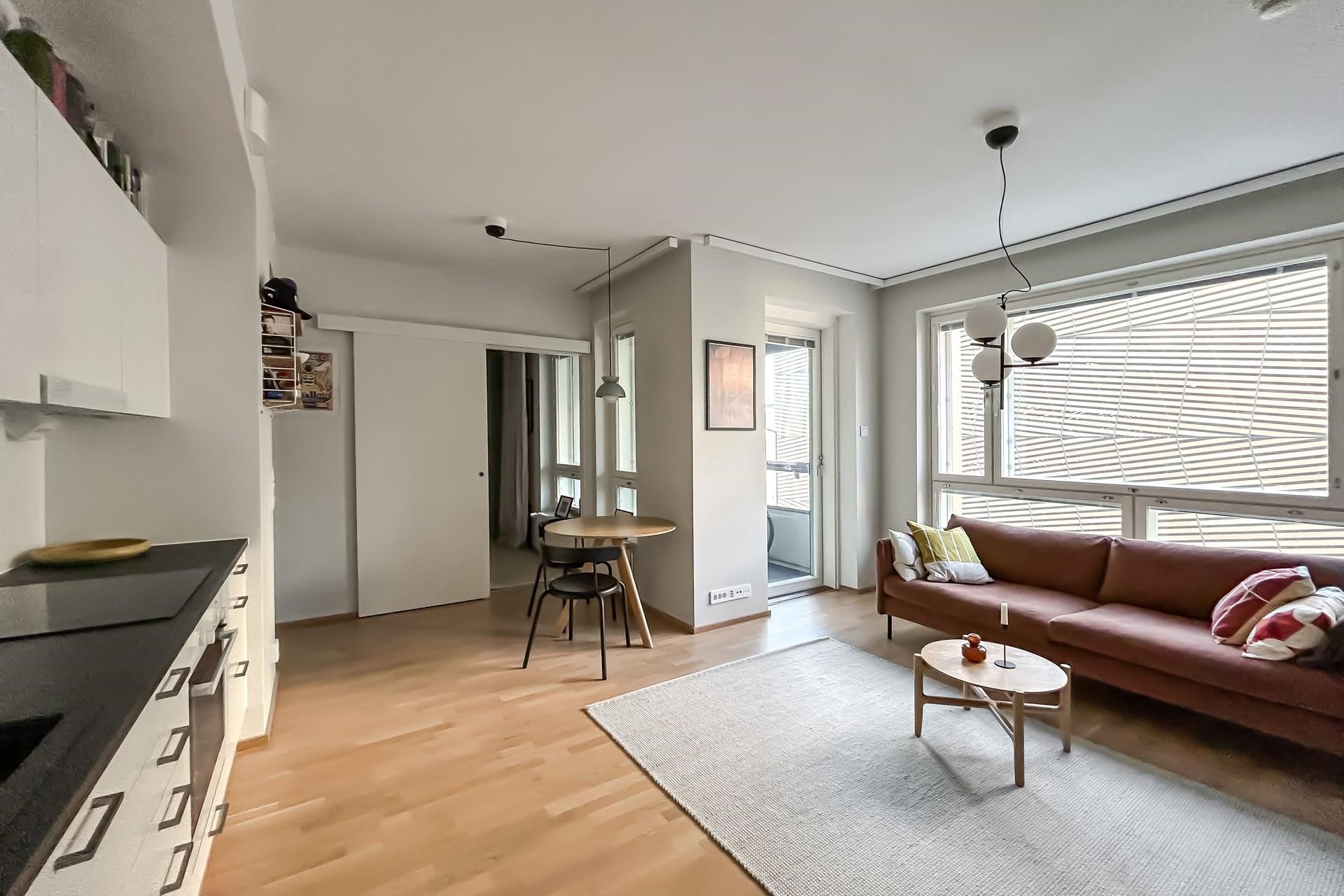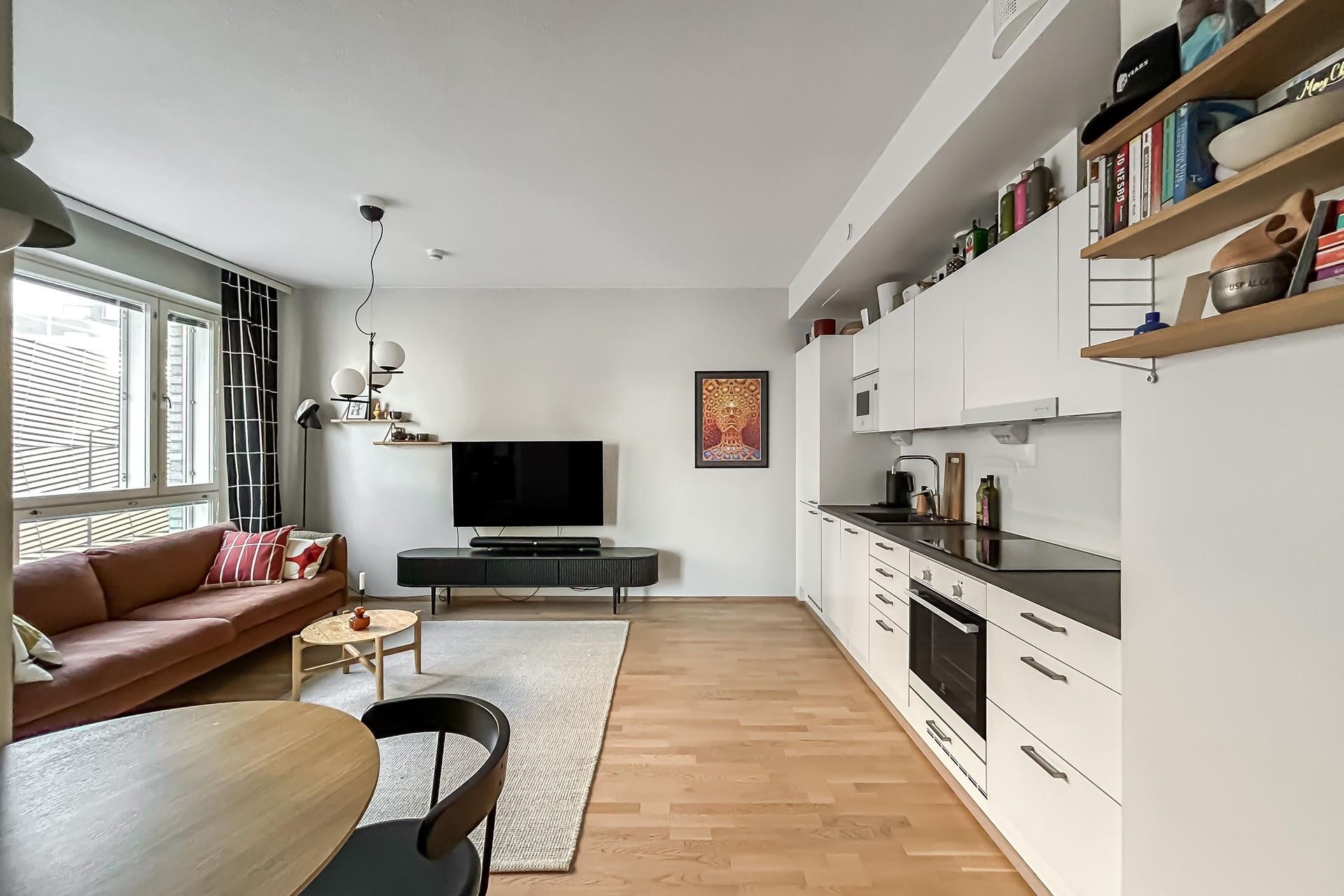 Toimivapohjainen koti sopii niin yksin asuvan kuin pariskunnankin tarpeisiin. Moderni avokeittiö laadukkailla integroiduilla kodinkoneilla sekä huoneiston tyylikkäät pintamateriaalit tekevät kokonaisuudesta huolitellun. Olohuoneesta pääset luoteen suuntaan olevalle lasitetulle parvekkeelle. Kylpyhuoneessa on paikka pyykinpesukoneelle.