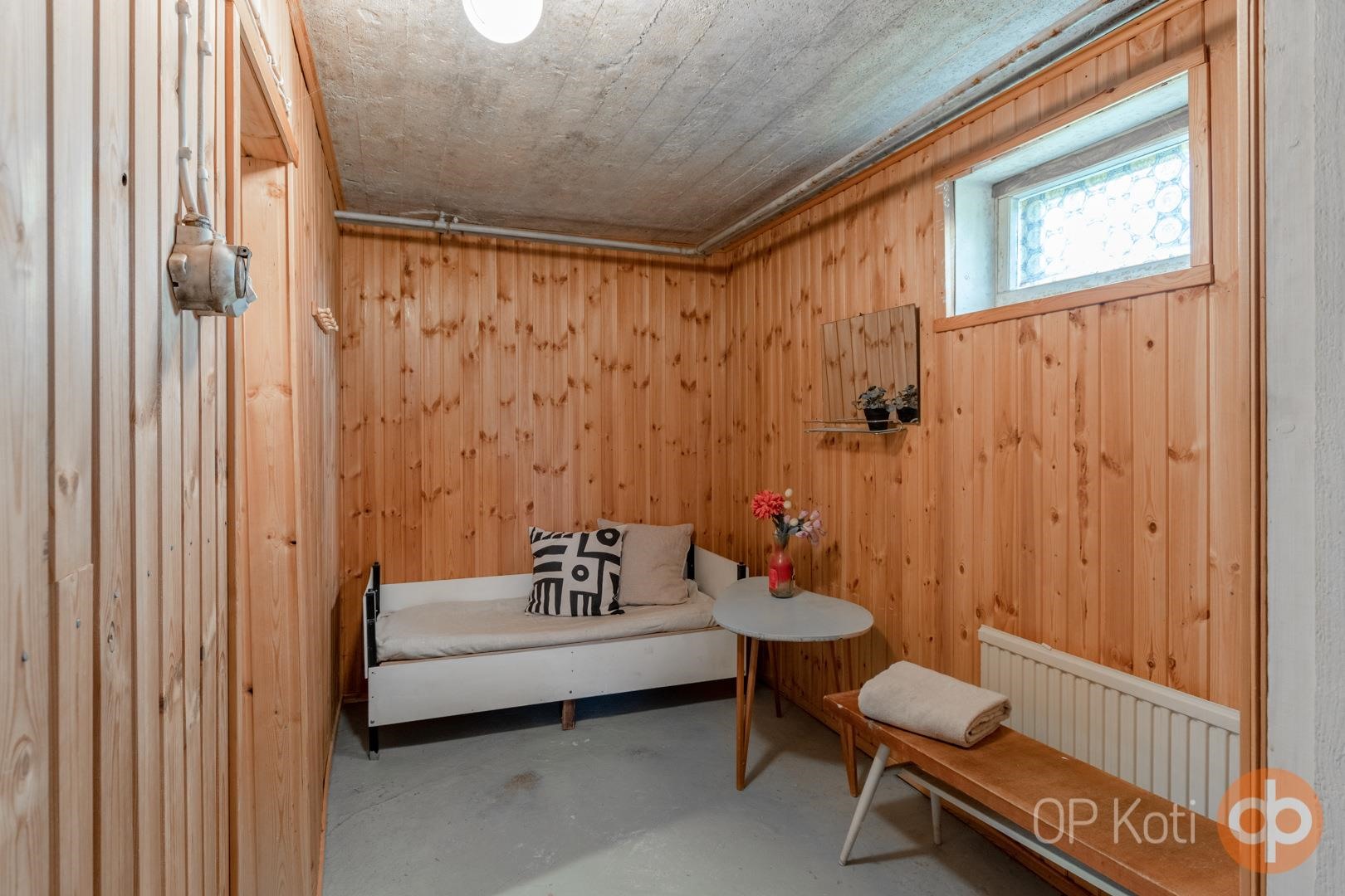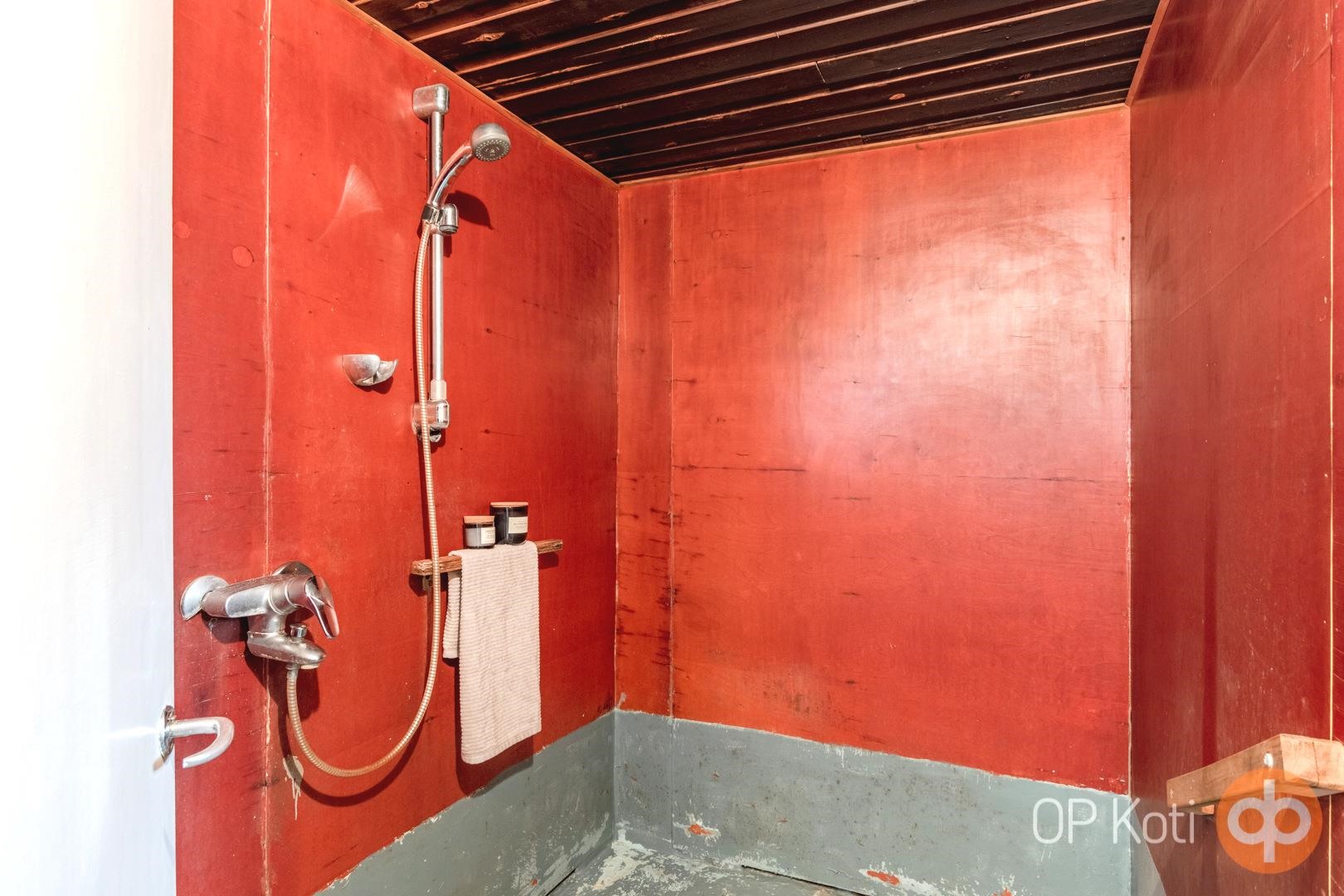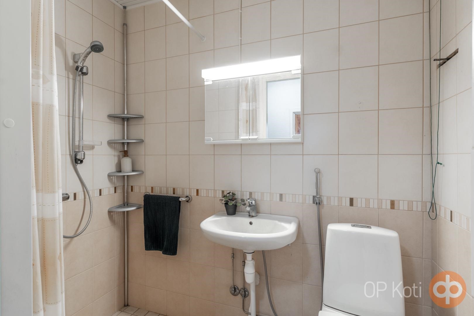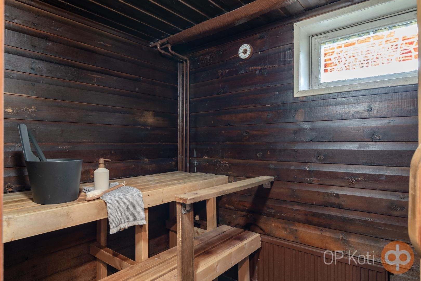- Sauna, sähkökiuas, kylpyhuone, suihku, peilikaappi, allaskaappi, pesukoneliitäntä, kiinteät valaisimet.