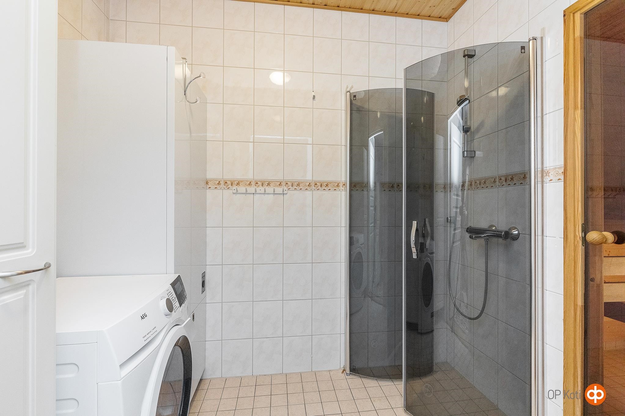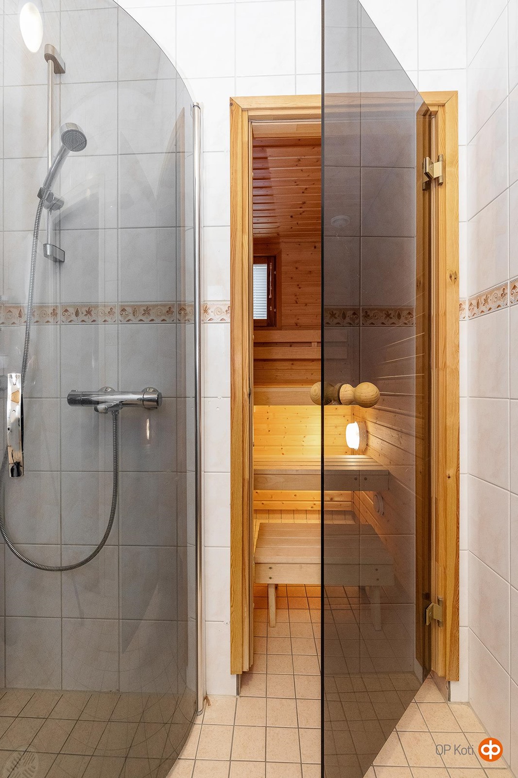 - Sauna, sähkökiuas, kylpyhuone, erillinen wc, suihku, suihkuseinä 2 kpl, taitettavat, peilikaappi erillinen wc, kaapit 1 kpl kylpyhuoneessa, allaskaappi erillinen wc, pesukoneliitäntä kylpyhuoneessa, lattialämmitys kylpyhuone ja erillinen wc, kiinteät valaisimet. Siistikuntoinen kylpyhuone, jossa hyvä paikka pesukoneelle ja kuivausrummulle. Toiminnallinen kokonaisuus ikkunallisella saunalla. Monen arvostama erillinen wc makuuhuoneen läheisyydessä.