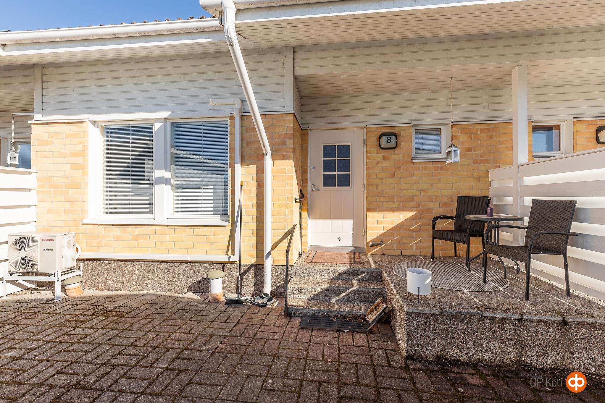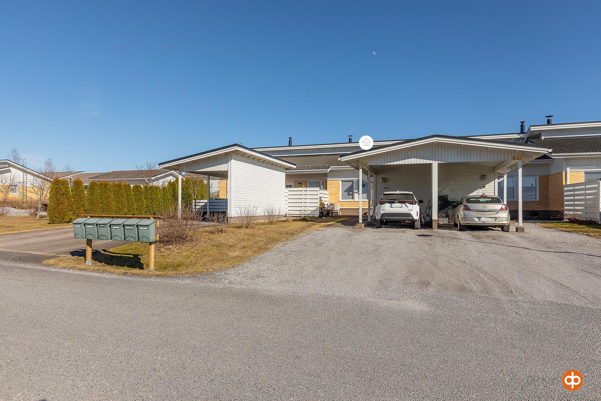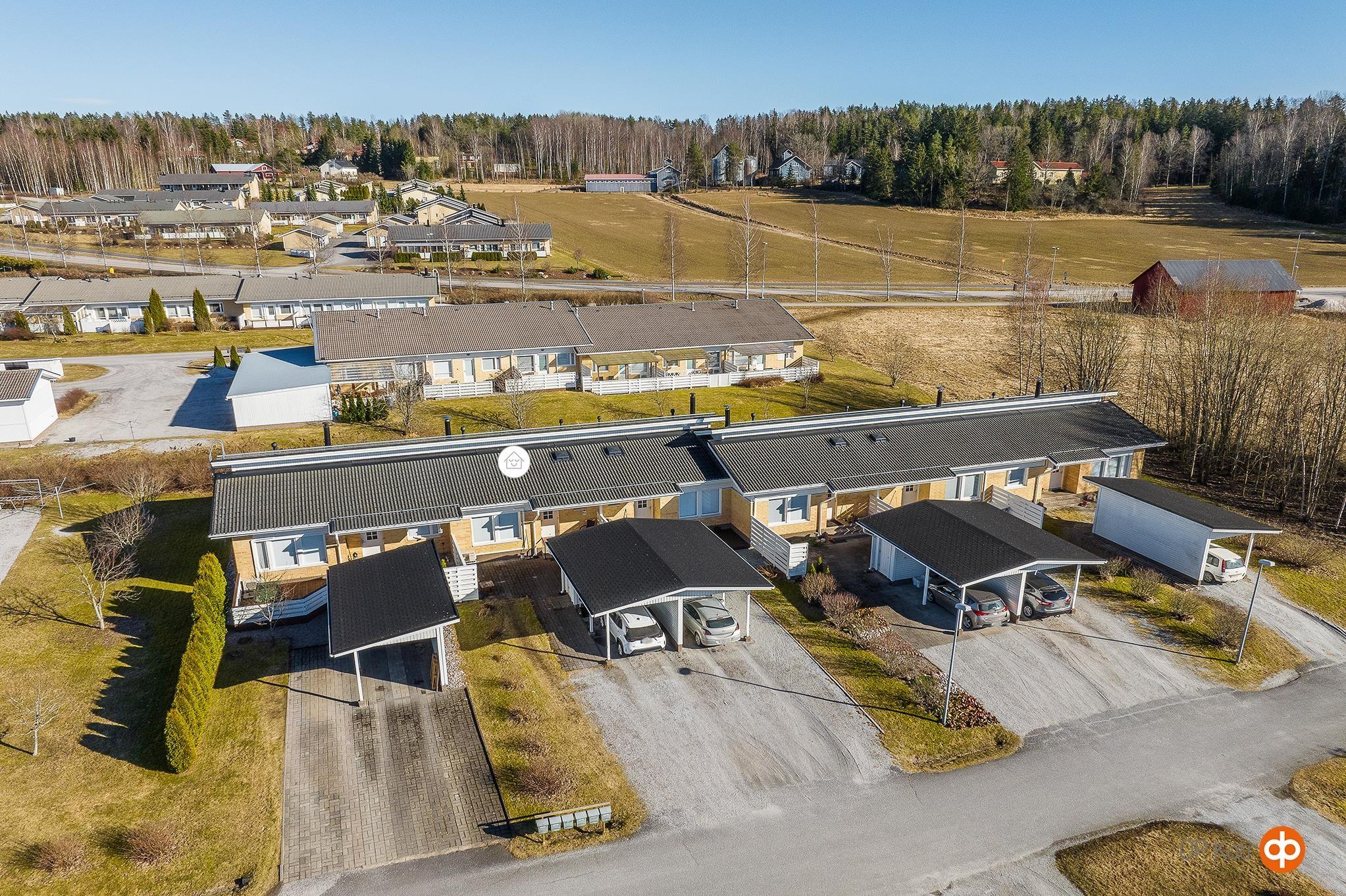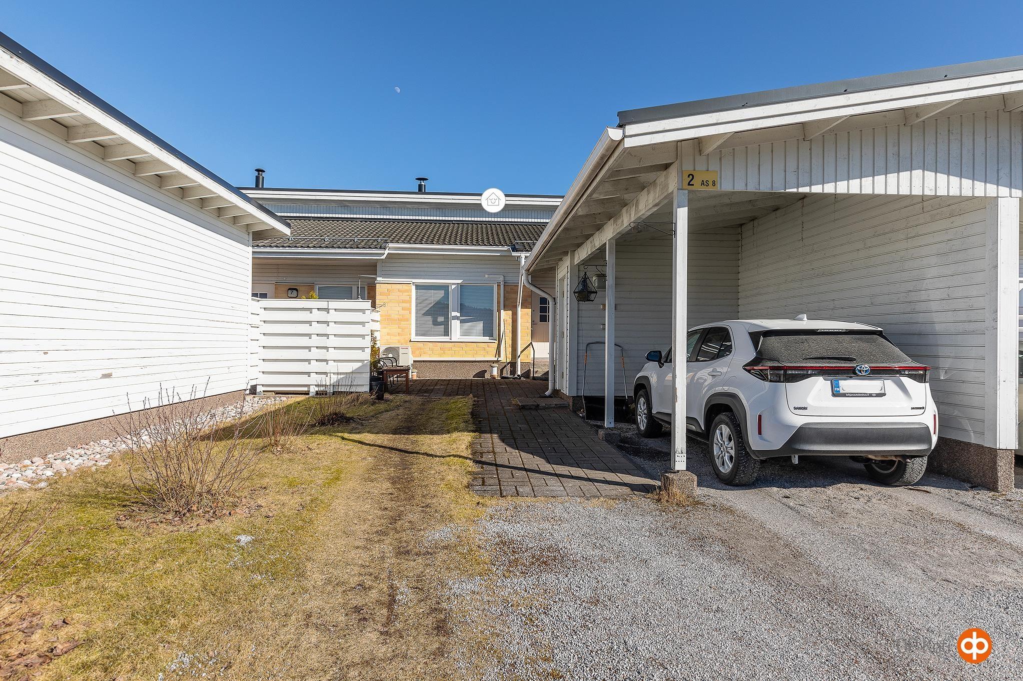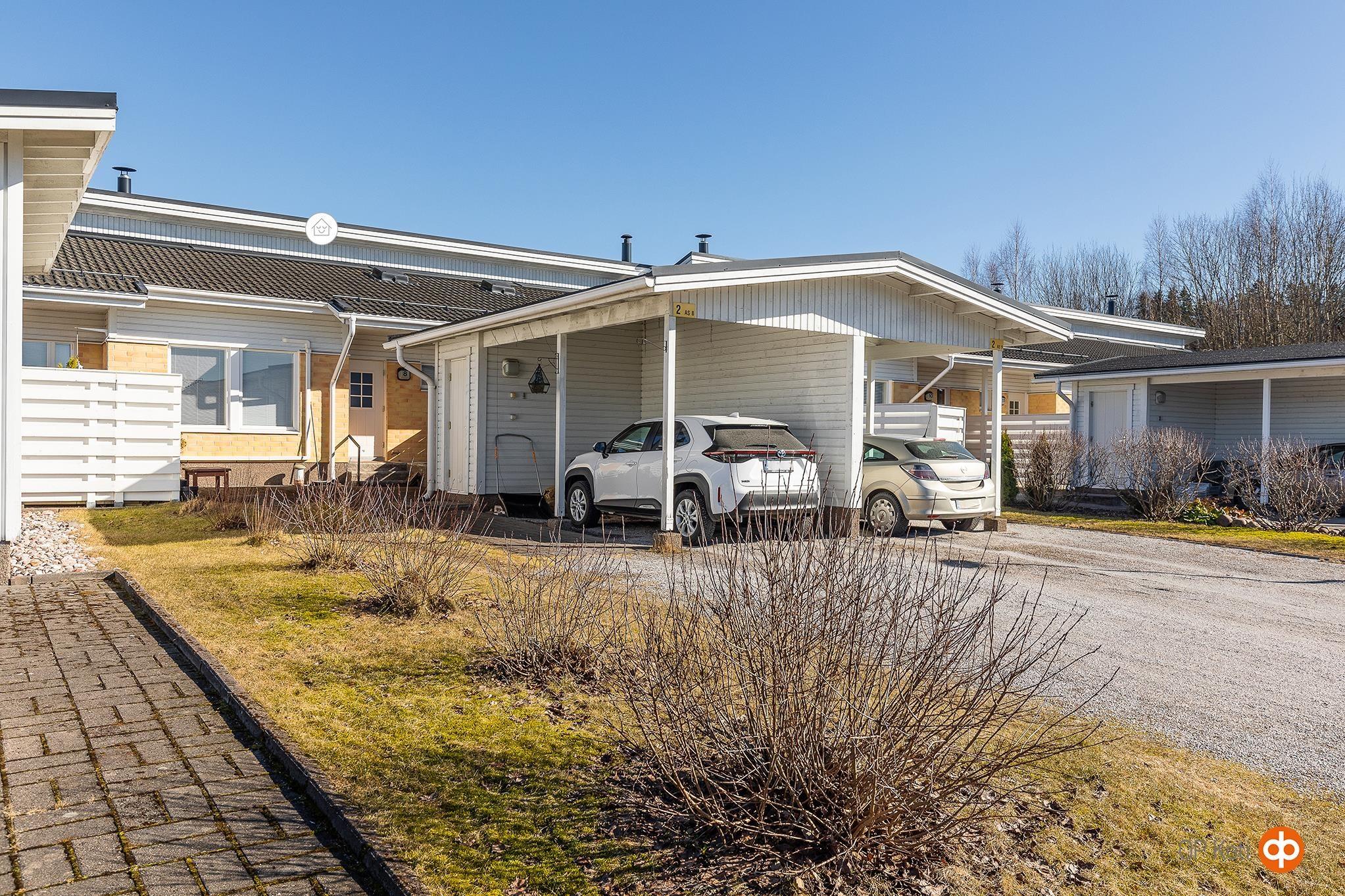 Rakennus päättyvän kujan varrella, ei häiritsevää ohikulku liikennettä. Rivitalon takapihat itään aamu-auringon suuntaan. Asunnolla suojaisa takapiha katetulla terassilla. Lämmin varasto sisäänkäynnin välittömässä läheisyydessä, autokatospaikka ja huoneiston edessä autopaikka perheen toiselle ajoneuvolle. Yhtiössä valokuitu.