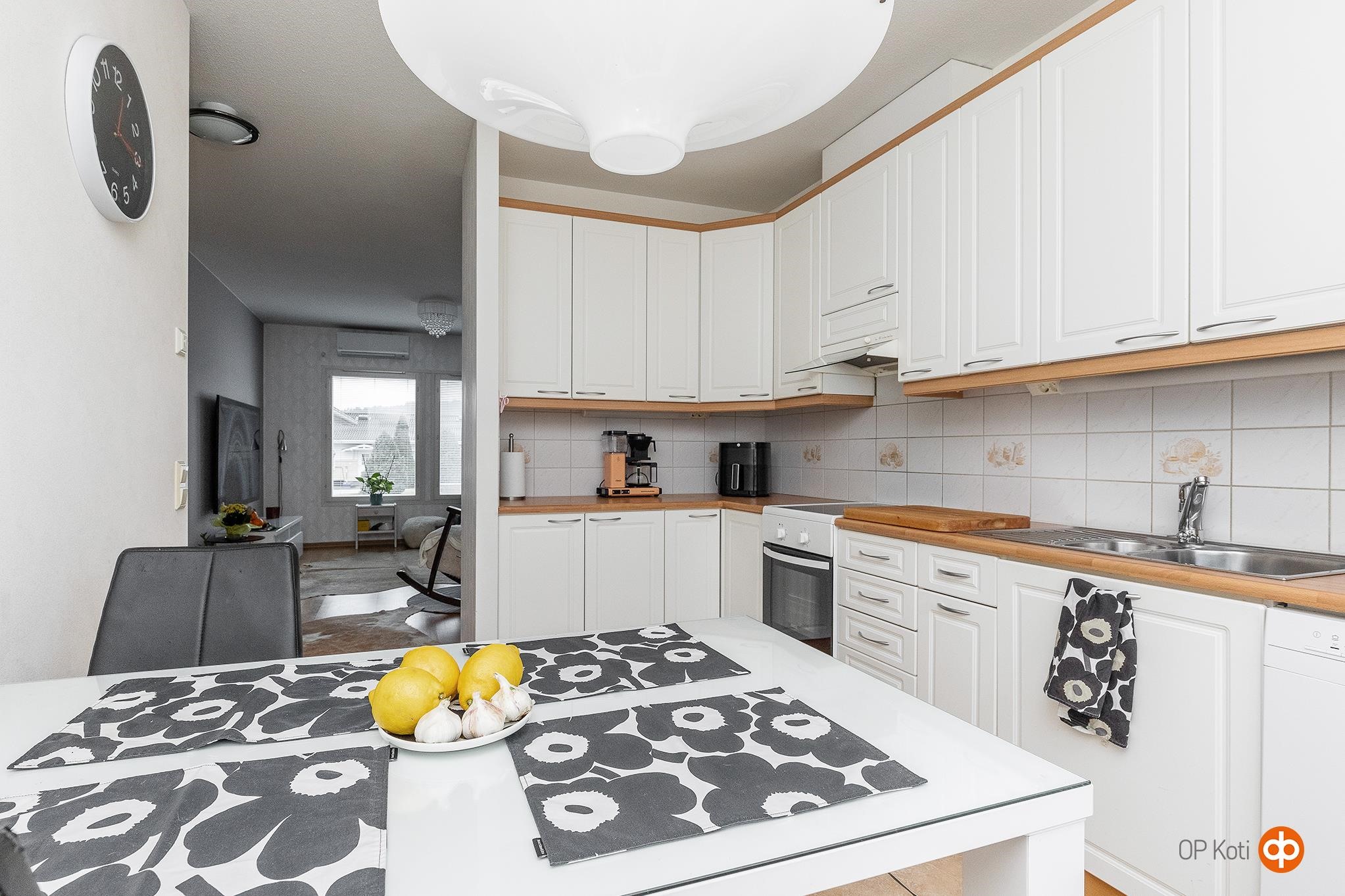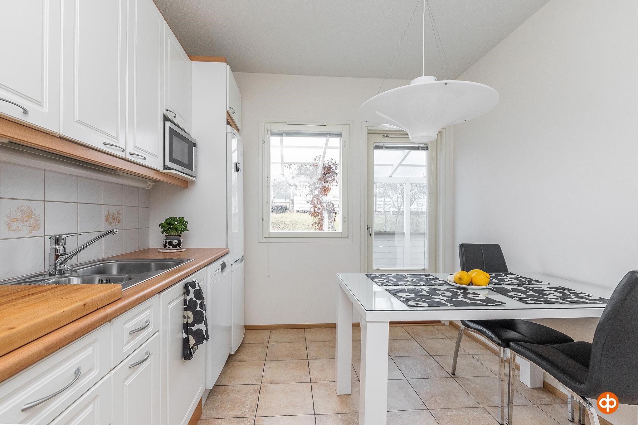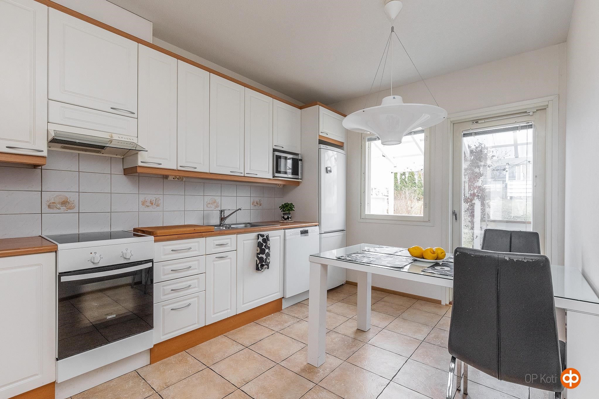 - Jääkaappipakastin, induktioliesi, liesituuletin talotuuletin, astianpesukone, kaapistot, kiinteät valaisimet. Siistikuntoinen tilava keittiö, jossa mukavasti kaapistoja ja laskutilaa. Lattiamateriaalina helppohoitoinen laattalattia. Hyvä paikka arkiruokapöydälle. Keittiöstä käynti takapihan reilunkokoisella valokatteen alla olevalle terassille, kesän grillaus hetkiin.