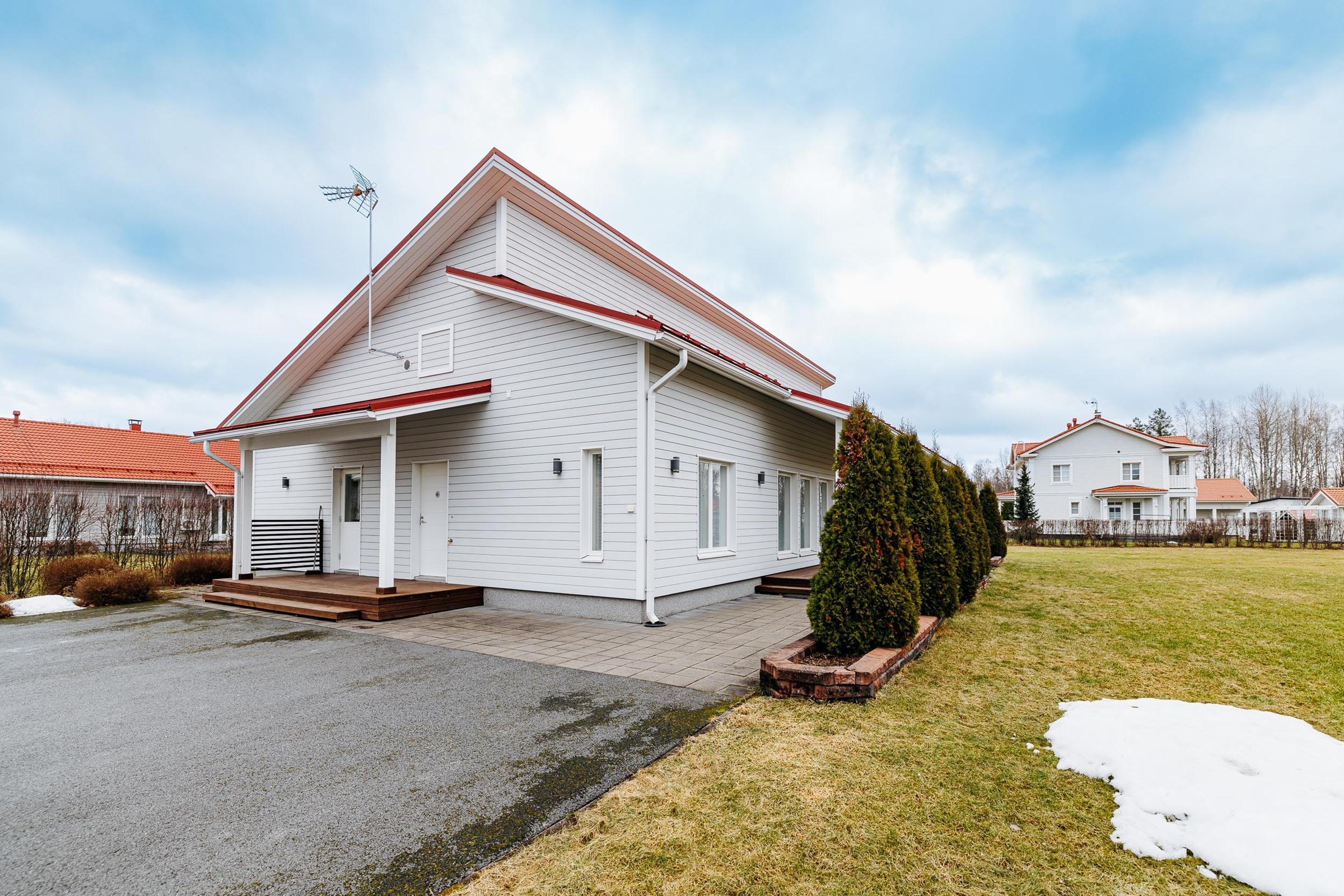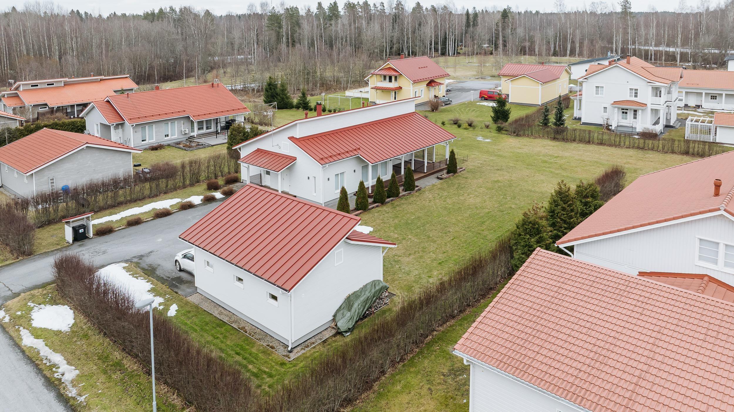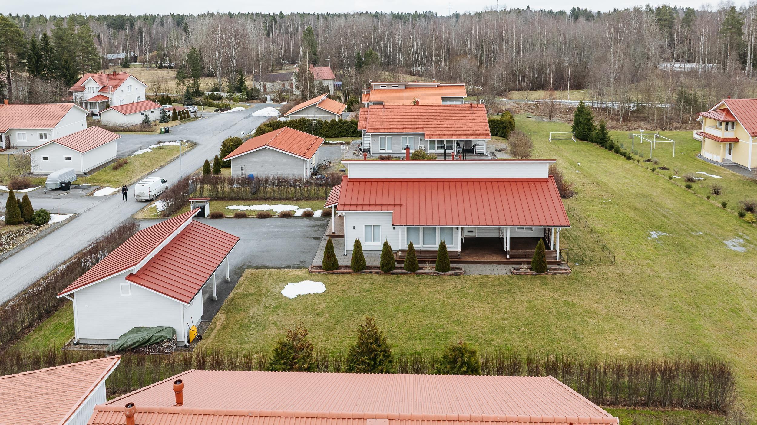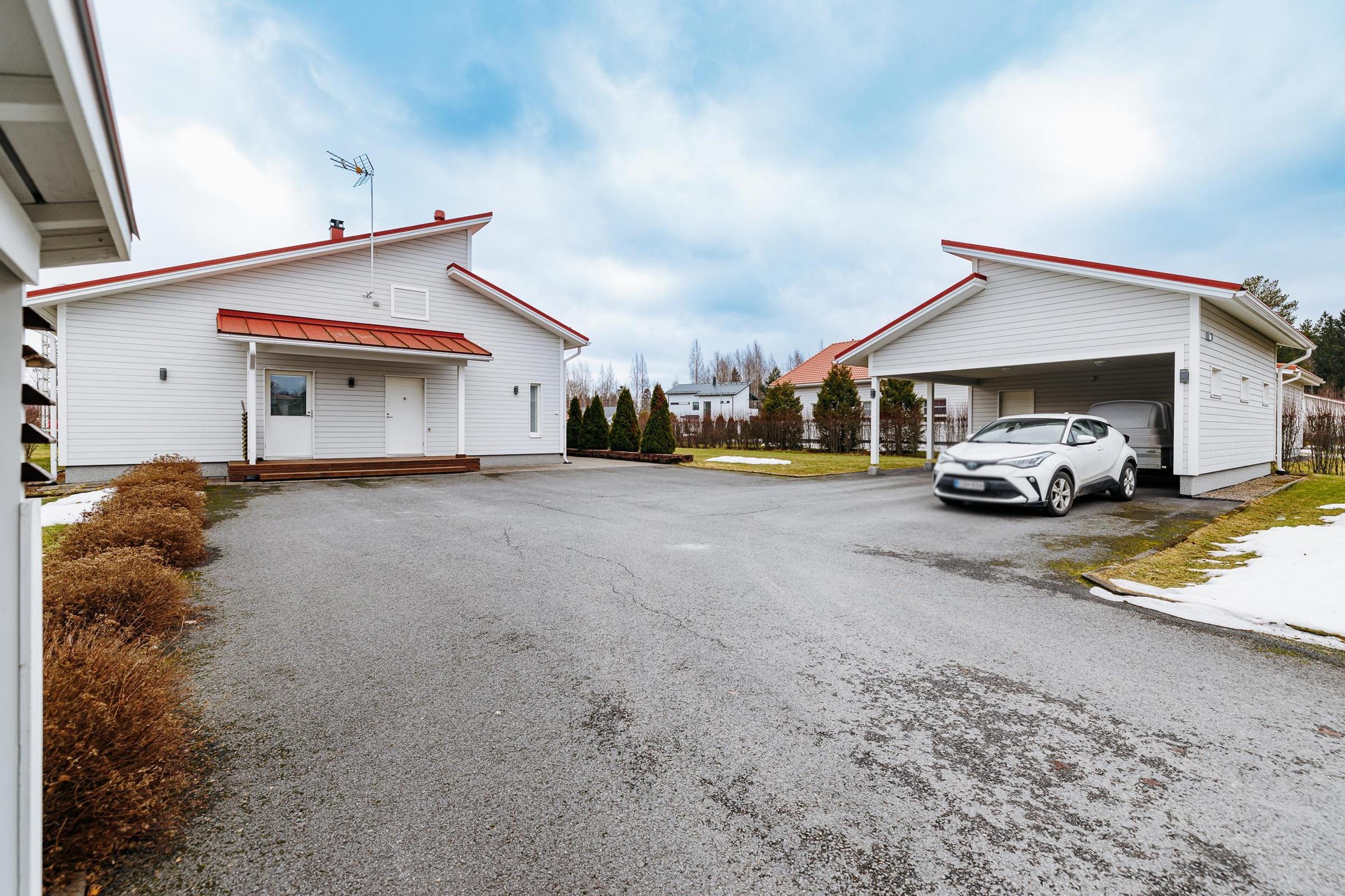 Helppohoitoinen piha tekee arjesta sujuvaa: nurmialueen reunustavat istutusaltaat ja asfaltoitu etupiha viimeistelevät siistin kokonaisuuden. Ulkorakennuksessa on tilava lämmin varasto sekä kahden auton autokatos, jotka tuovat arkeen lisää käytännöllisyyttä ja säilytystilaa.
