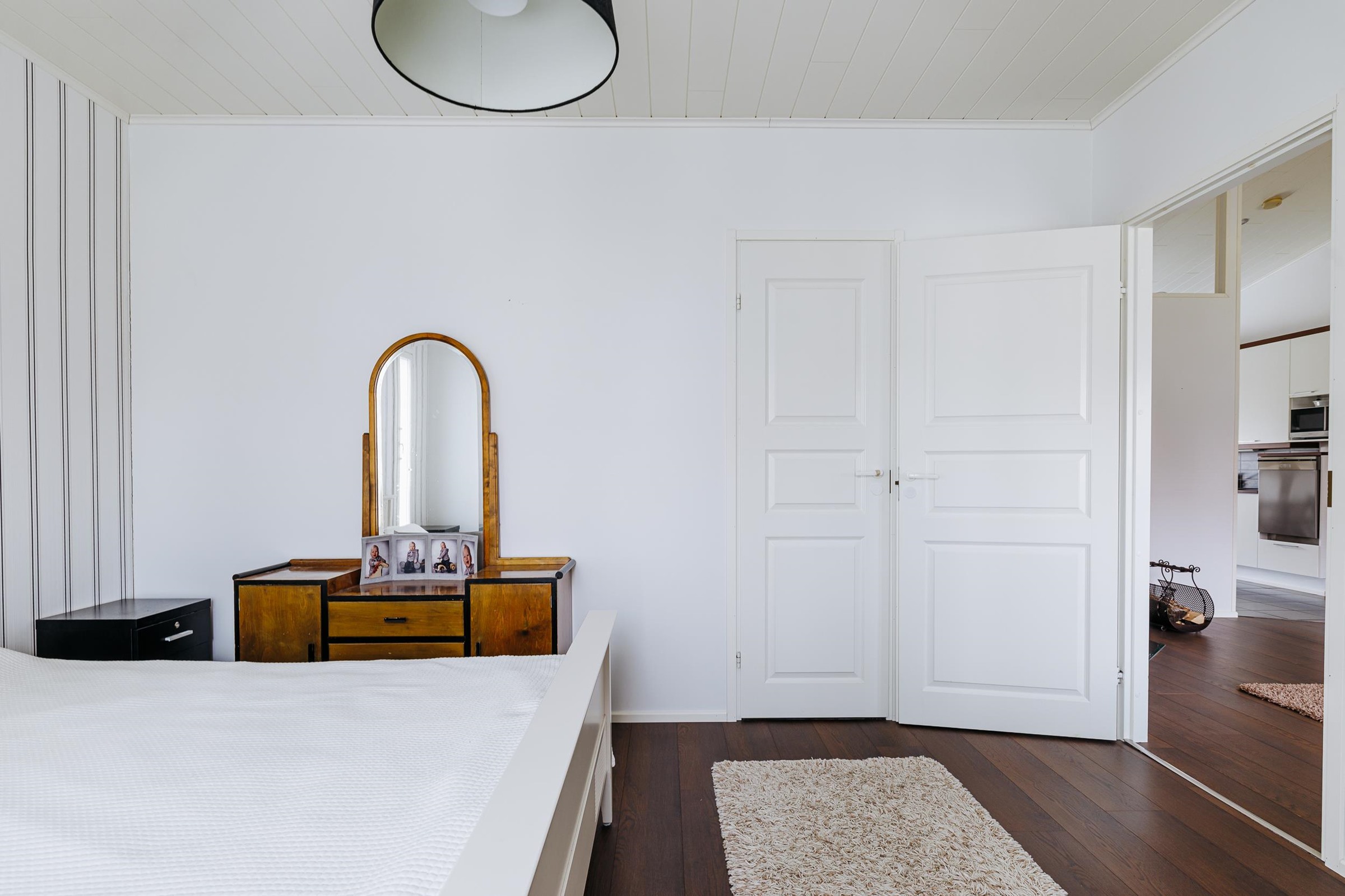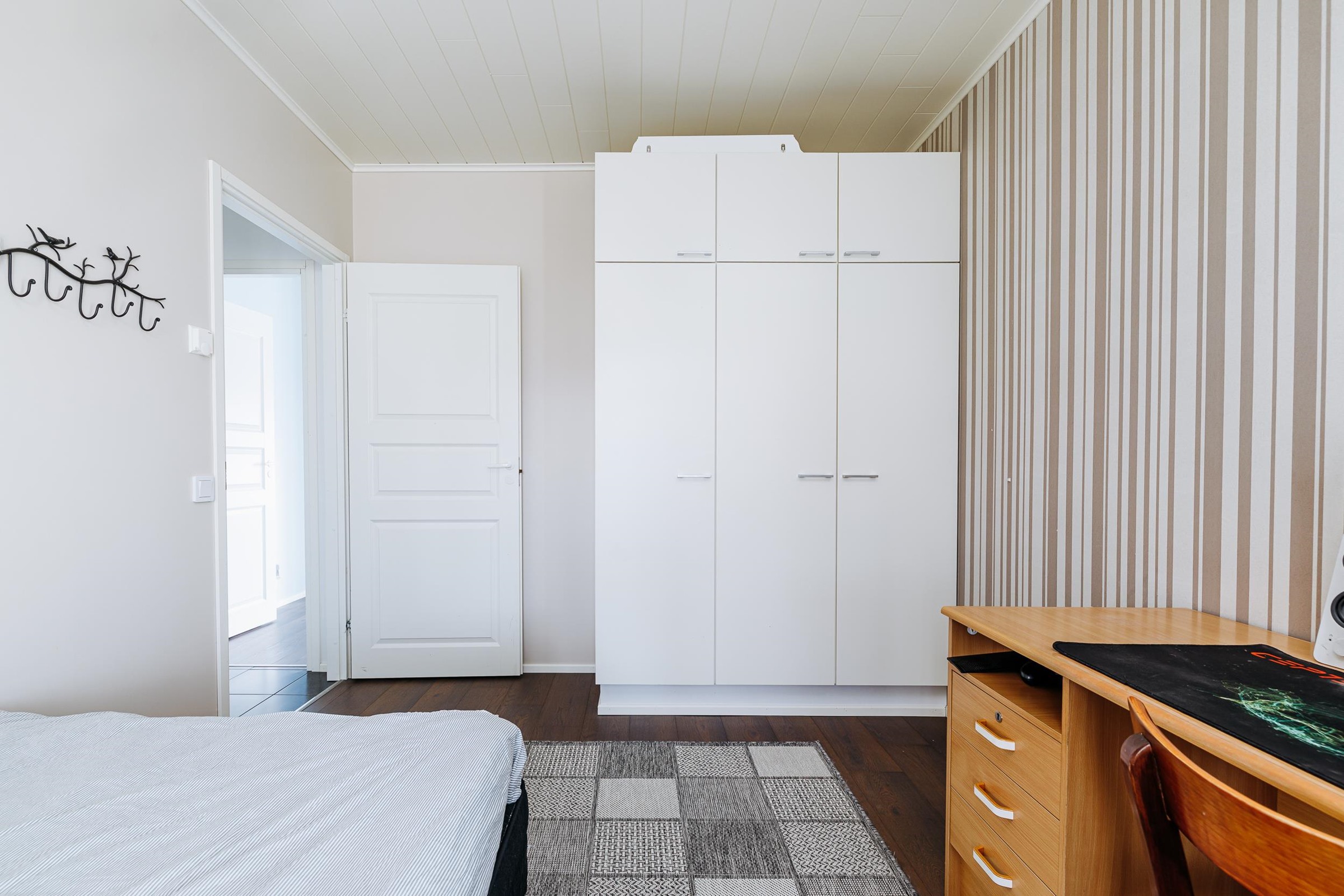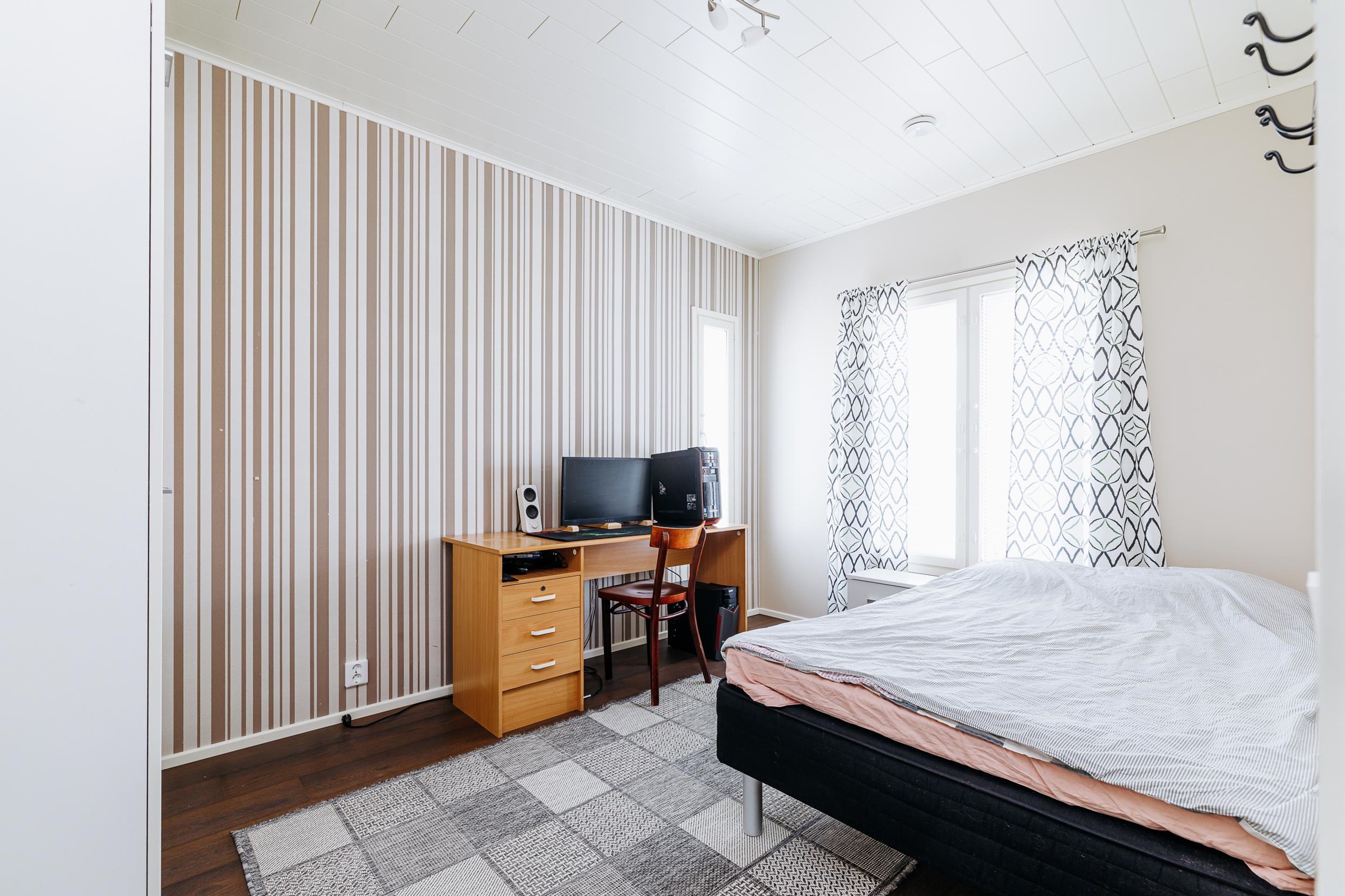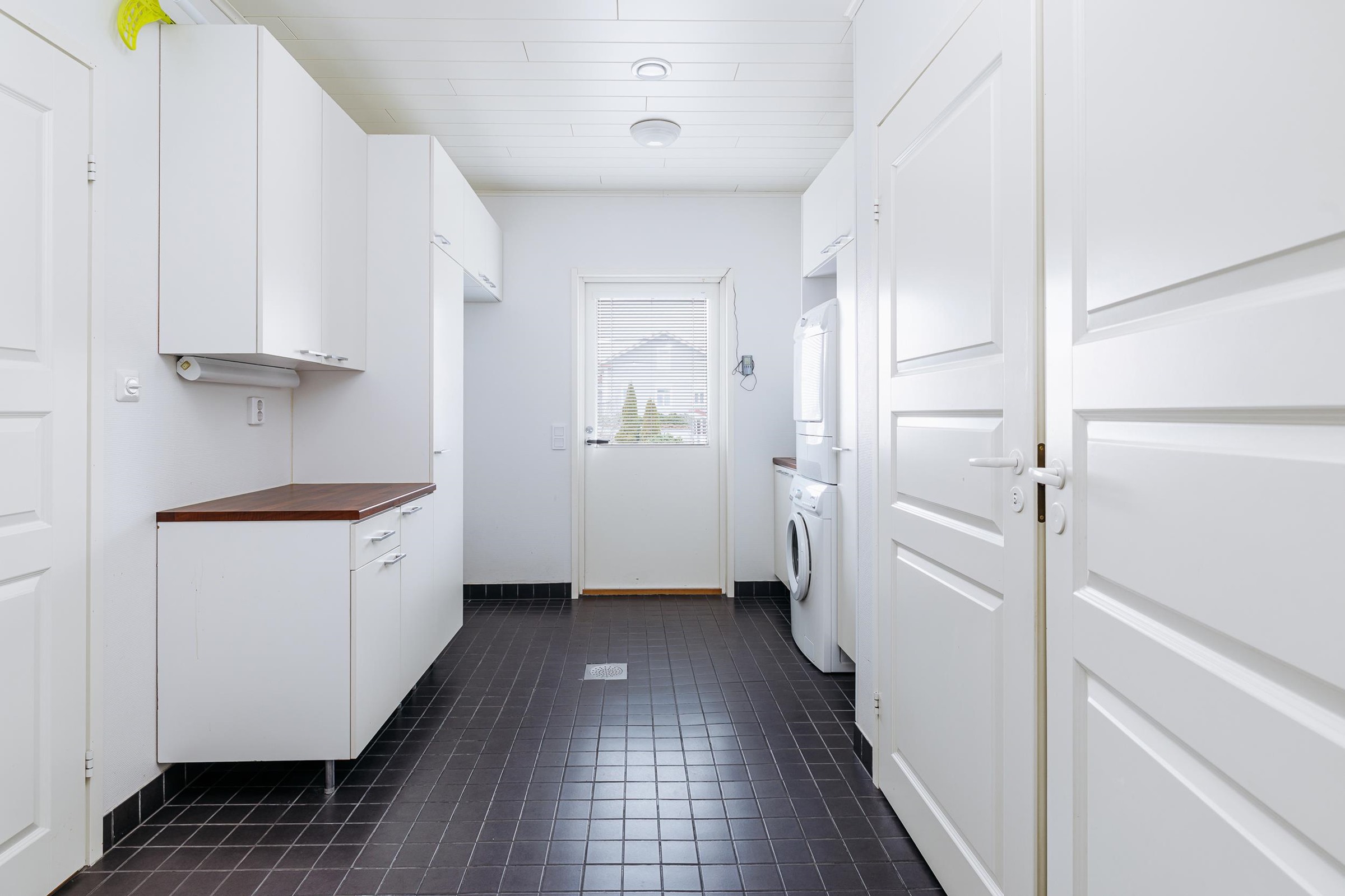 Tilavaan keittiöön mahtuu isompikin ruokapöytä, ja keittiöstä on sujuva kulku kodinhoitotilaan sekä edelleen pesutiloihin, mikä helpottaa arjen toimivuutta. Makuuhuoneista kolme sijaitsee talon toisessa päässä, kun taas yksi makuuhuone on sijoitettu kätevästi omaan rauhaansa talon toiseen päähän. Tästä huoneesta on kulku vaatehuoneen kautta kodinhoitotilaan ja pesutiloihin. Runsaat säilytysratkaisut, kuten tilava vaatehuone, tekevät kodista erityisen käytännöllisen lapsiperheen tarpeisiin.