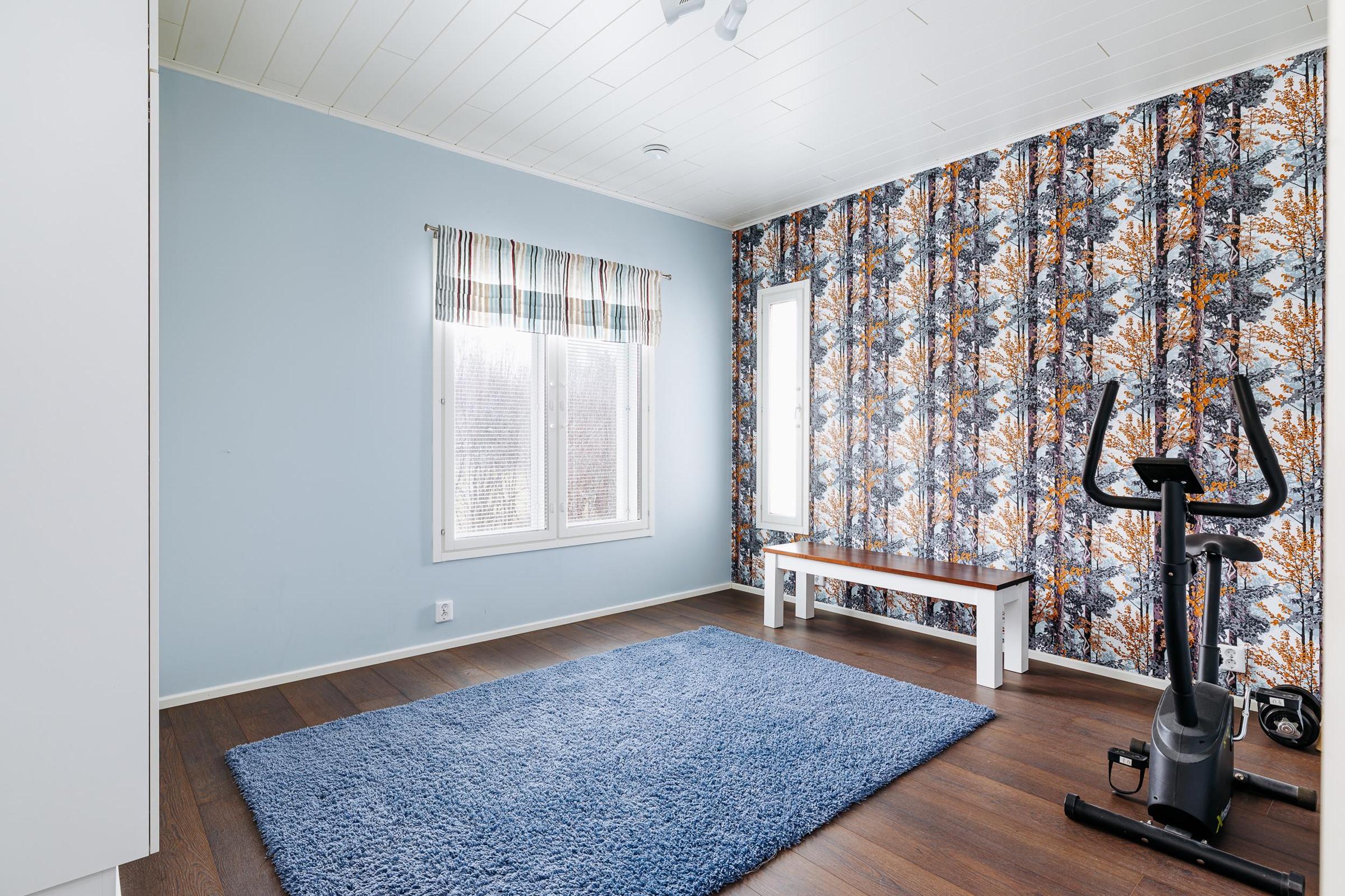 Keittiö: laatta/maali. Olohuone: laminaatti/maali. Makuuhuone 1: laminaatti/maali/tapetti. Makuuhuone 2: laminaatti/maali/tapetti. Makuuhuone 3: laminaatti/maali/tapetti. Kodinhoitohuone: laatta/lasikuitutapetti. Sauna: laatta/paneli. Kylpyhuone: laatta/laatta. Eteinen: laatta/maali. Wc: laatta/laatta. Makuuhuone 4: laminaatti/maali/tapetti.