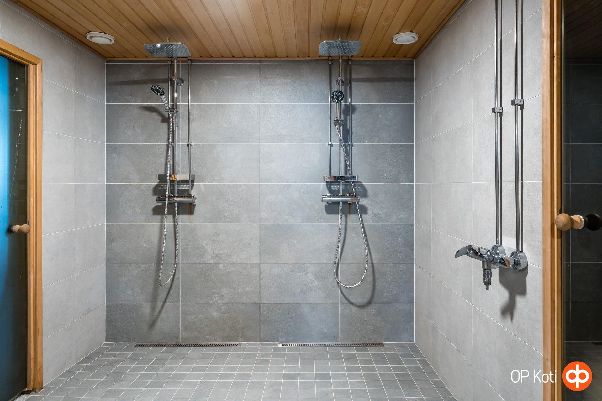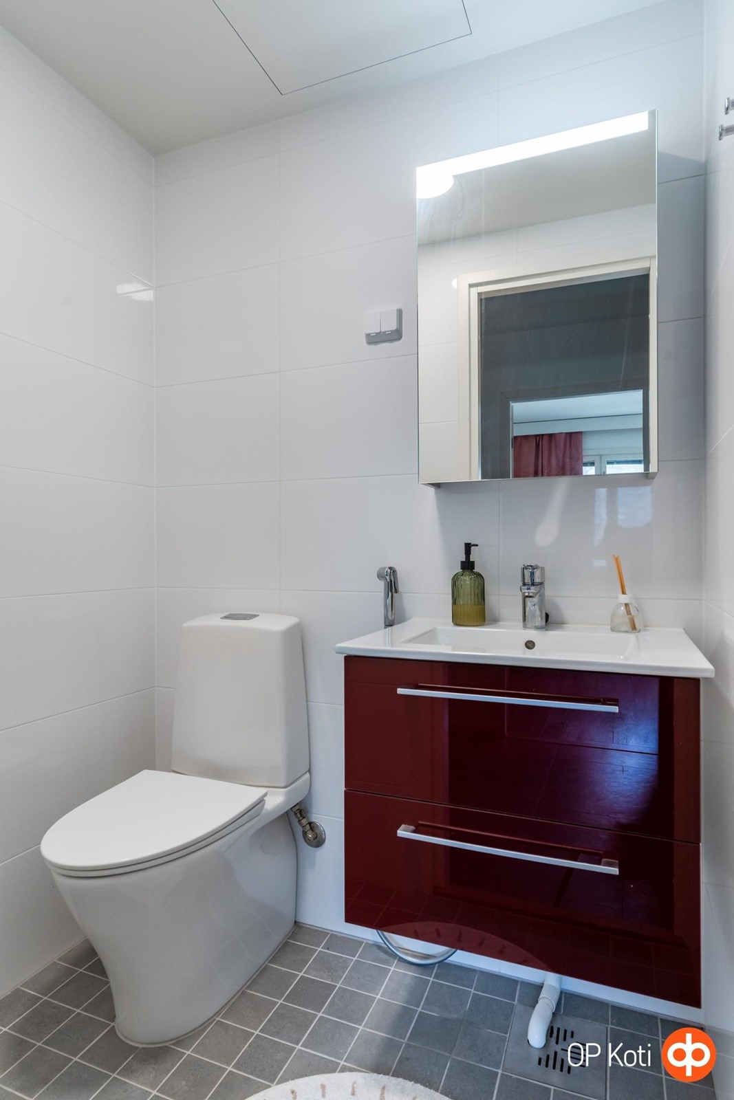 - Kylpyhuone, erillinen wc, suihku, peilikaappi kph, erillinen wc, allaskaappi kph, erillinen wc, pesukoneliitäntä, lattialämmitys sähköinen mukavuuslämmitys kph, kiinteät valaisimet. Suihkuovet , Wc -istuin myös kylpyhuoneessa . Pyyhekuivain kph:ssa