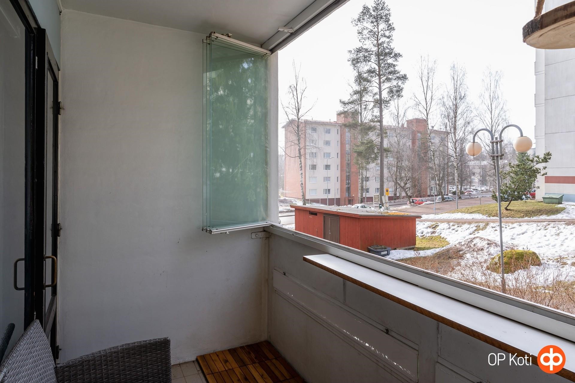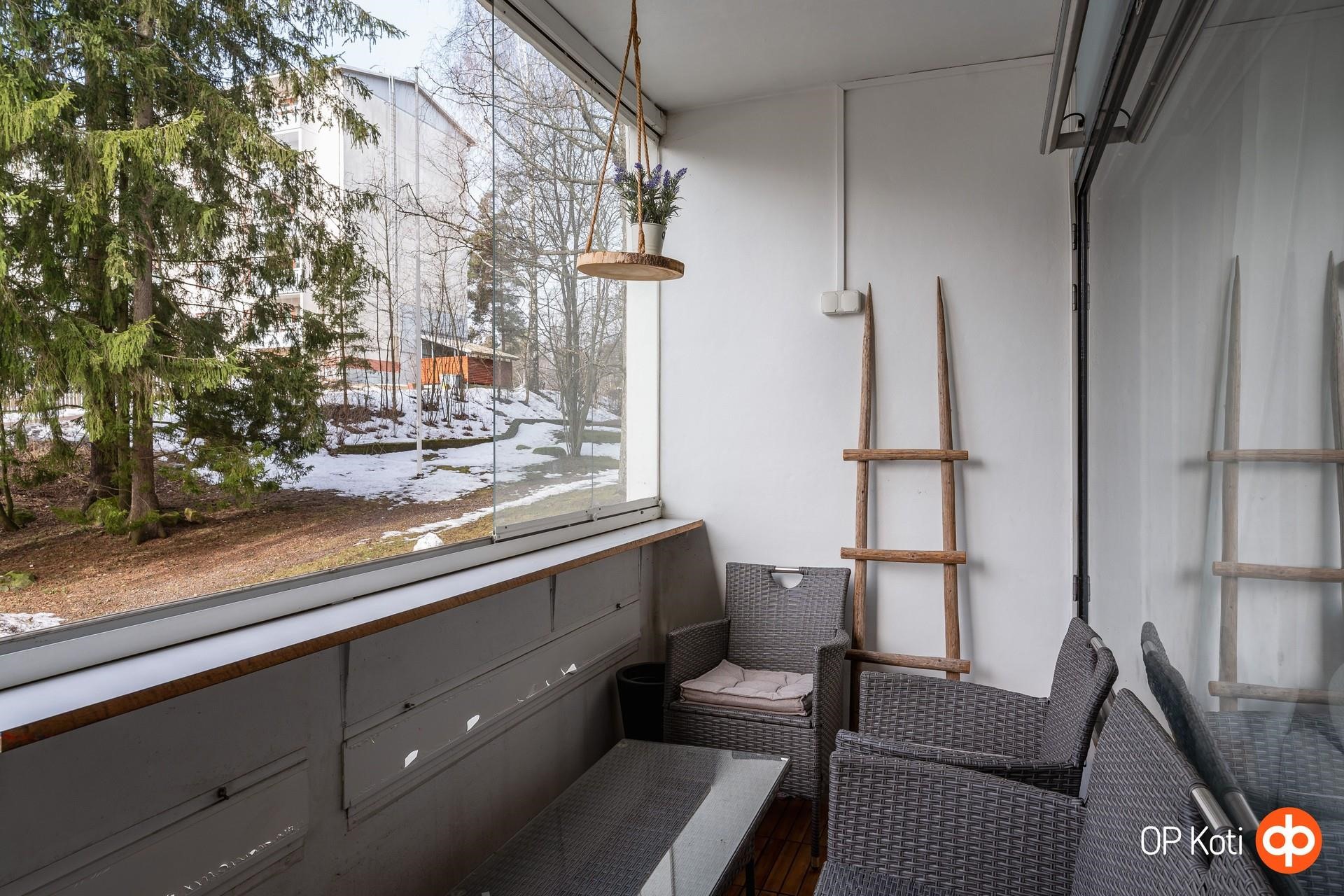 Lasitettu parveke toimii pitkälle syksyyn viihtyisänä oleskelutilana, täydellinen paikka rentoutumiseen.