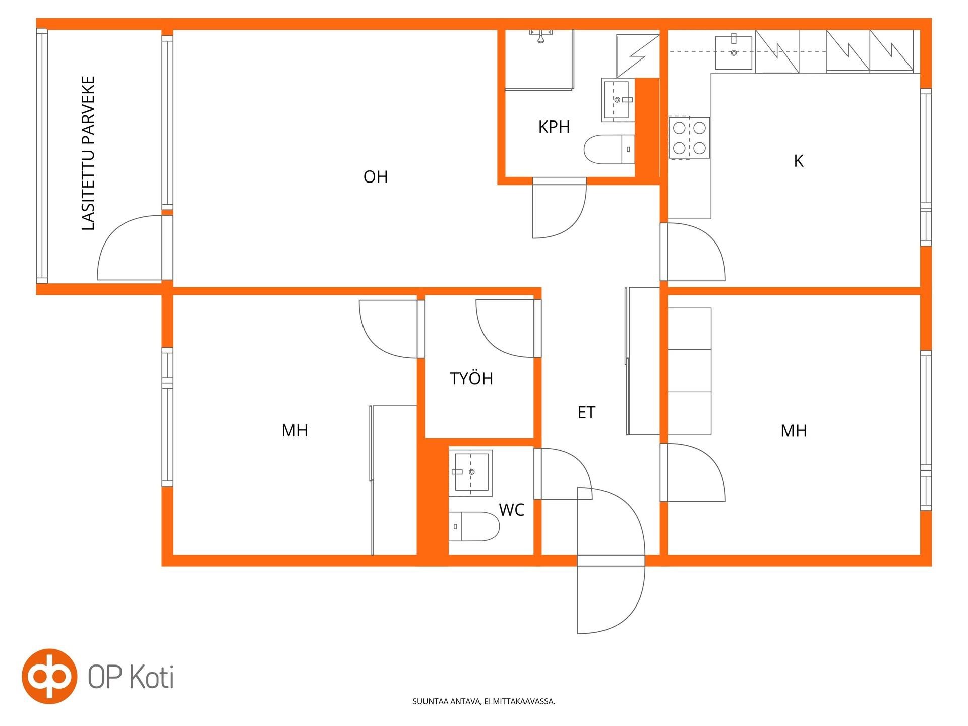 - Lasitettu parveke, olohuone, mh1 länteen, keittiö ja mh2 itään.