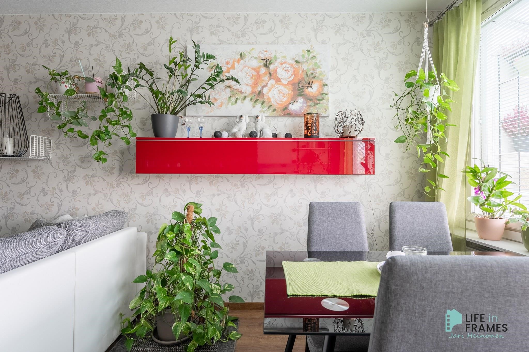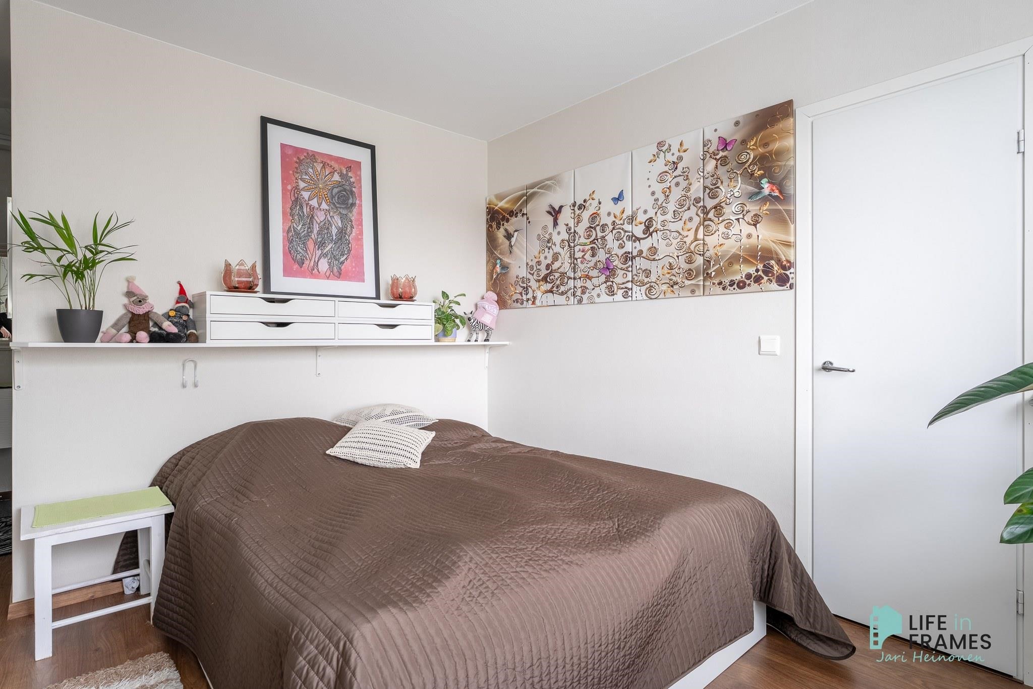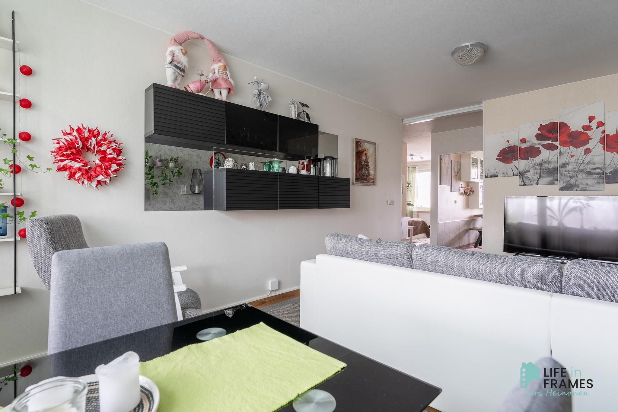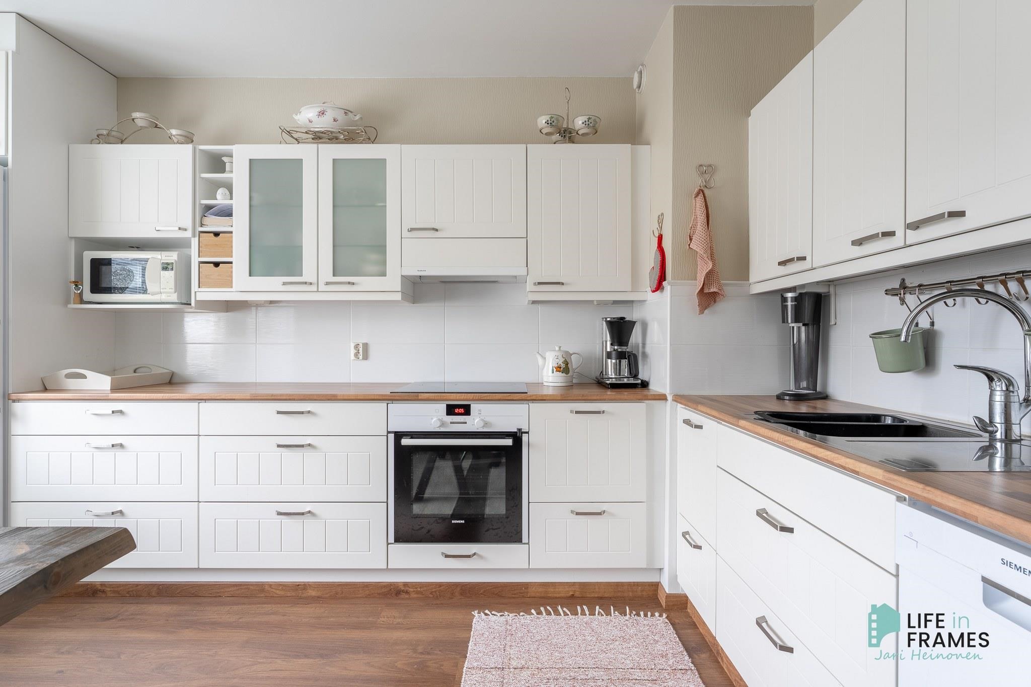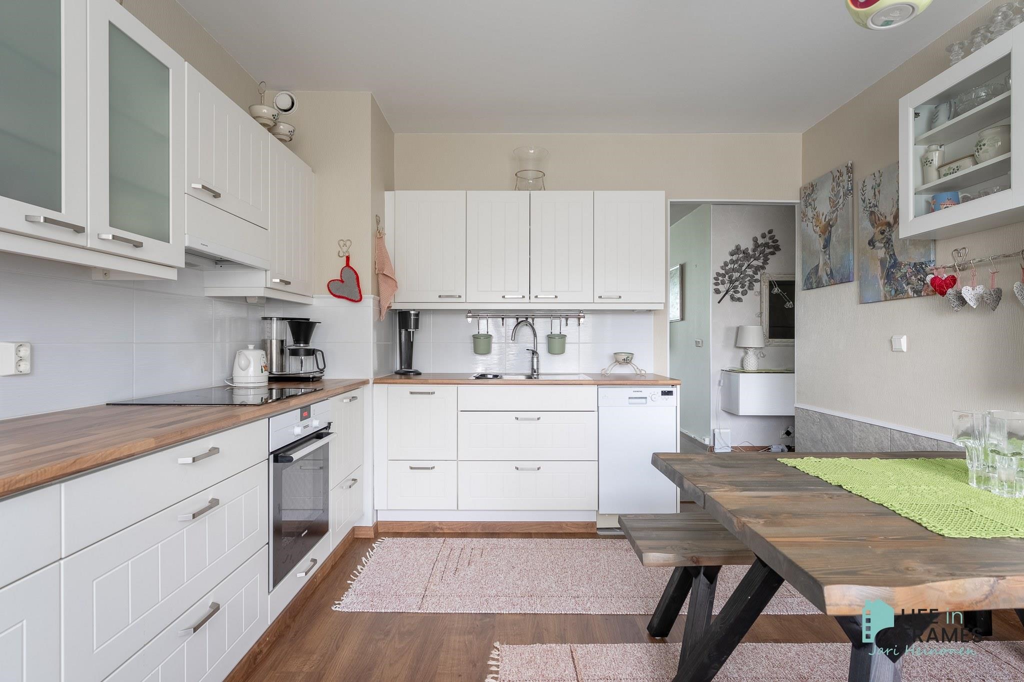 Tilava keittiö on remontoitu hyvällä maulla, laskutilaa on reilusti ja kodinkoneet nykyaikaiset. Keittiöön mahtuu helposti neljän hengen ruokapöytä ja silti tilaa riittää. Kylpyhuonetta on uudistettu maalaamalla, sekä kalusteita vaihtamalla vuonna 2024. Säilytystilaa löytyy reilusti sekä eteisen liukuovikaapistoista että makuuhuoneen yhteydessä olevasta vaatehuoneesta. Olohuoneesta on käynti taloyhtiön ainoalle katetulle ja lasitetulle parvekkeelle, josta on näkymä Liekovedelle päin.