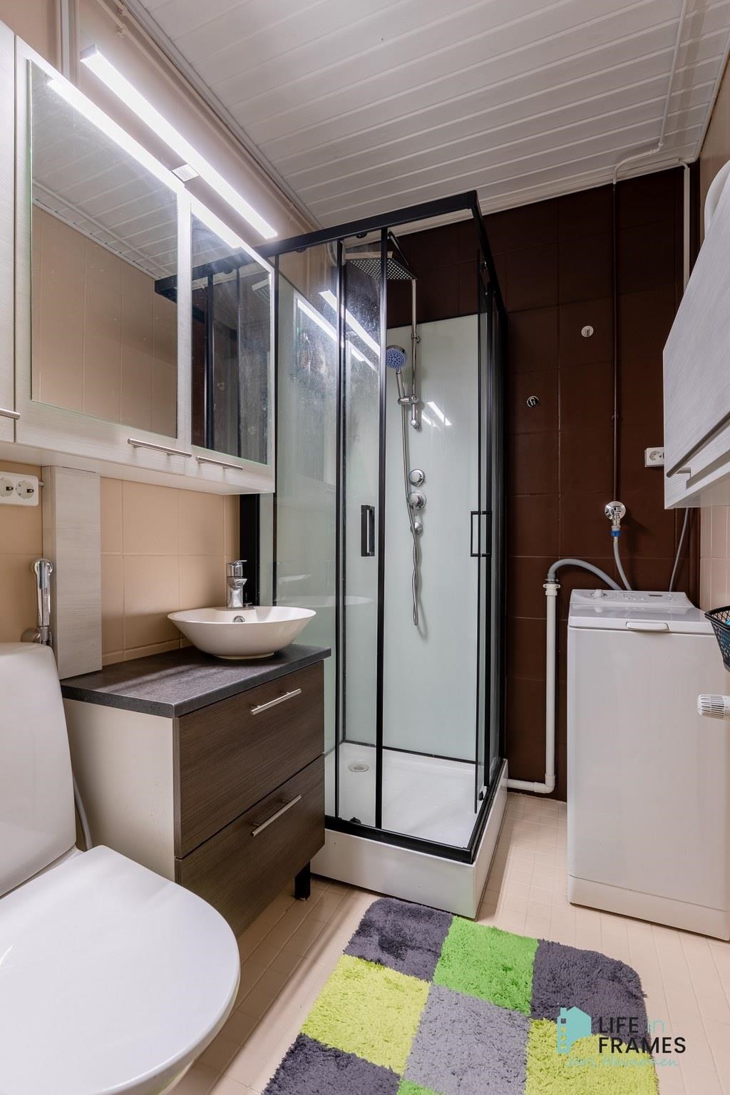 - Kylpyhuone, suihku, suihkukaappi, peilikaappi, allaskaappi, pesukoneliitäntä, kiinteät valaisimet. Kylpyhuonetta uudistettu 2024.