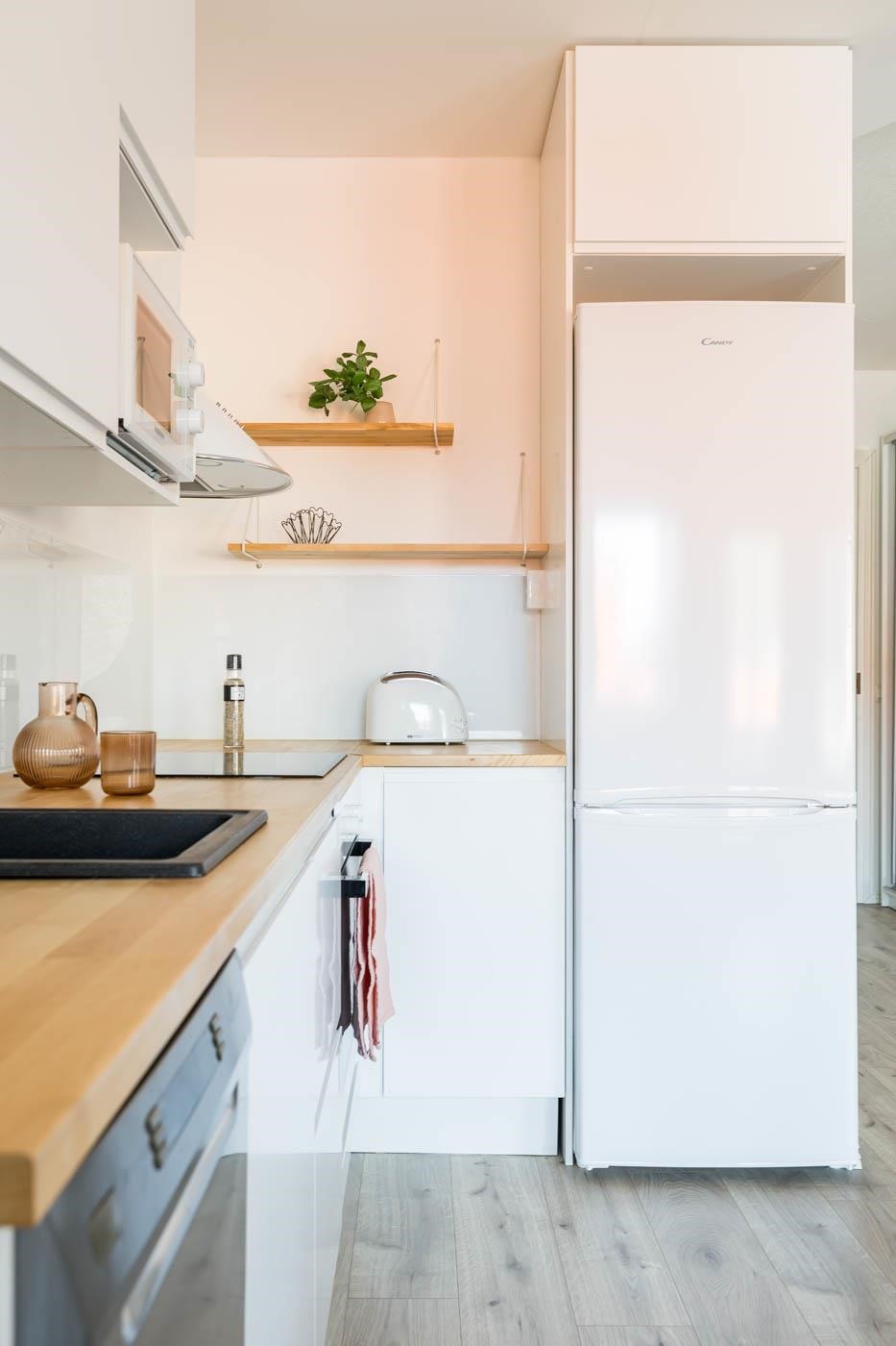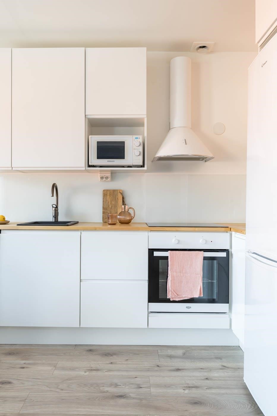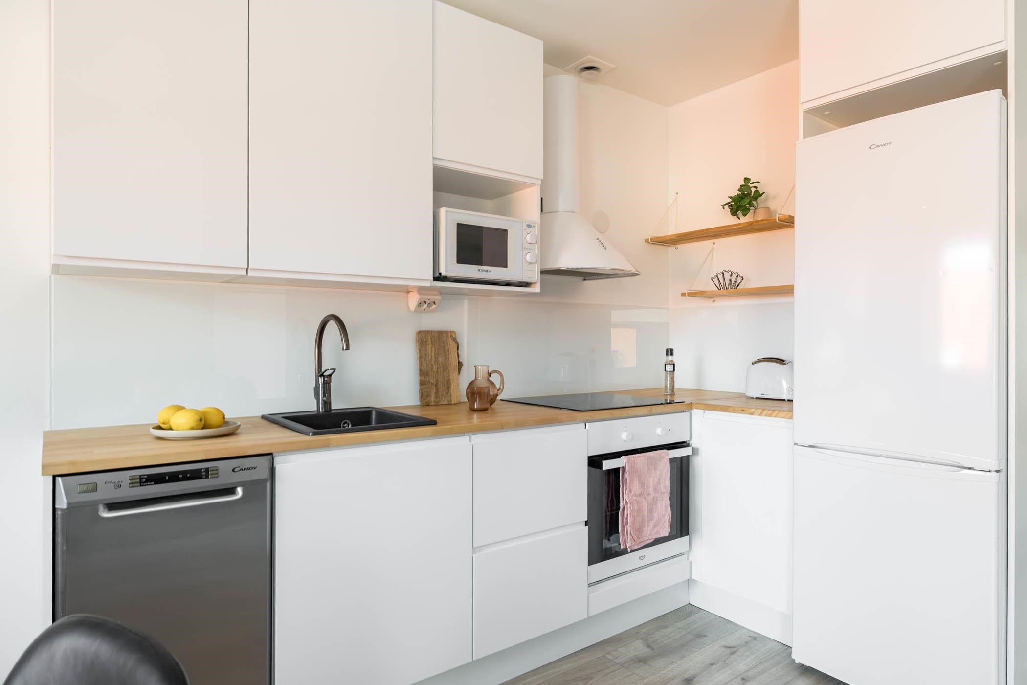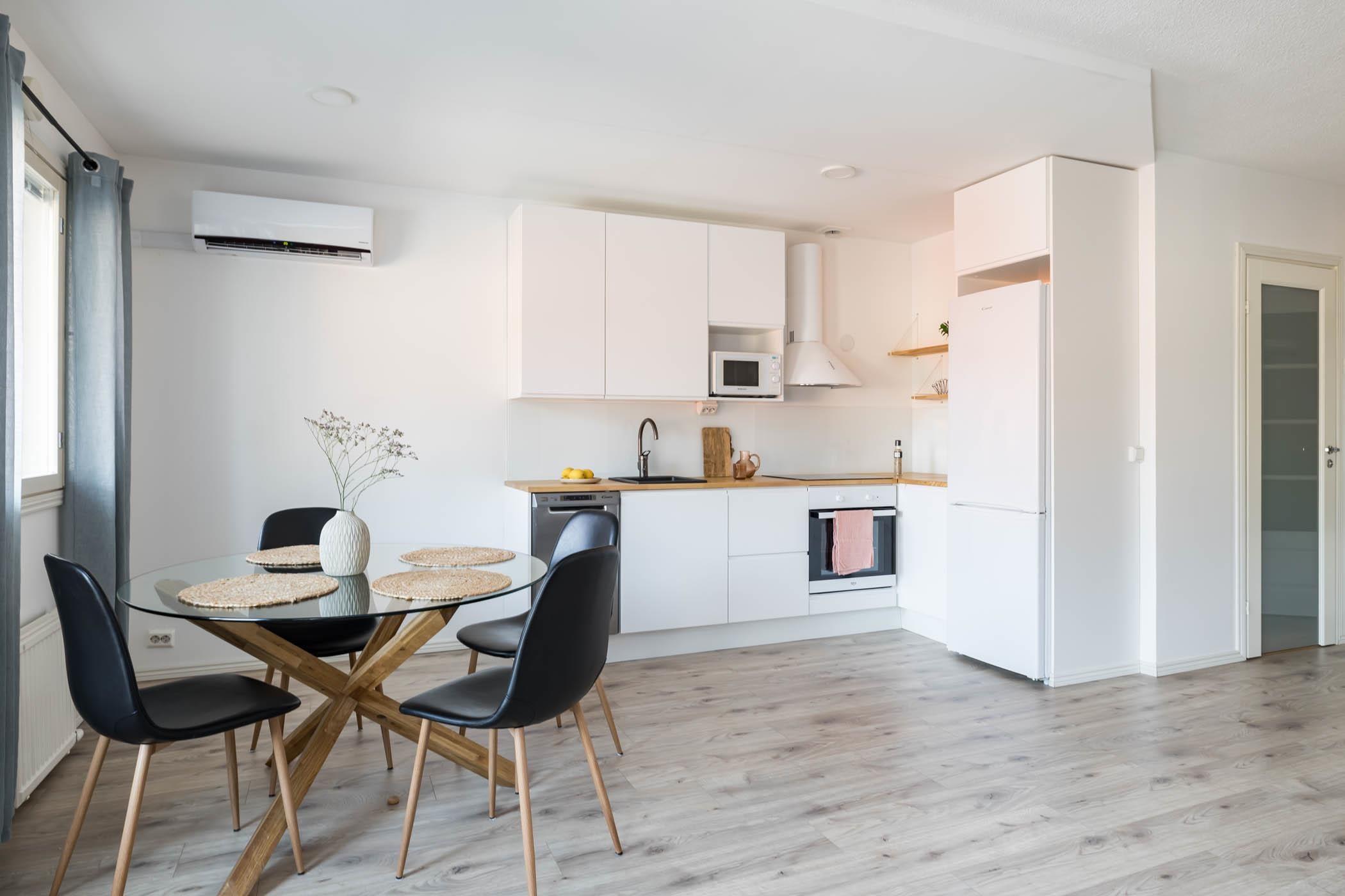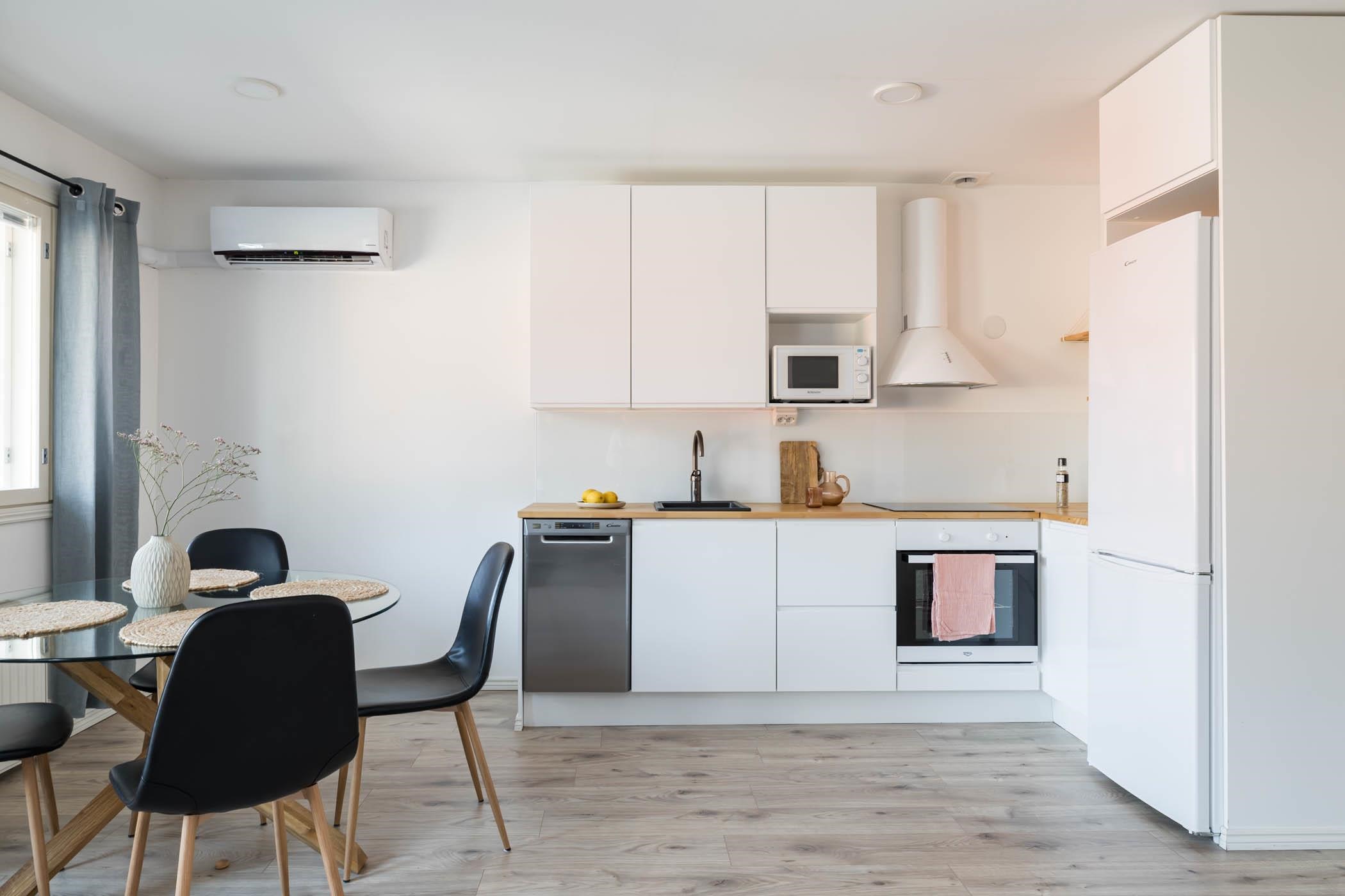- Keittiössä jääkaappipakastin, erillisuuni induktiotasolla, liesituuletin, astianpesukone, kaapistot, kiinteät valaisimet.