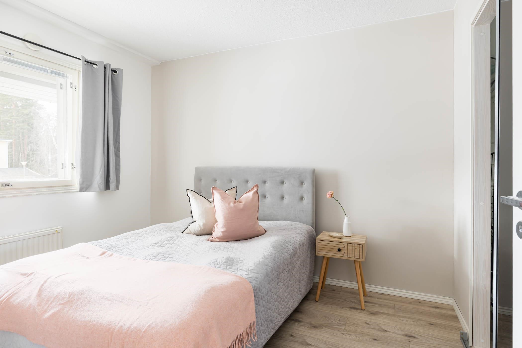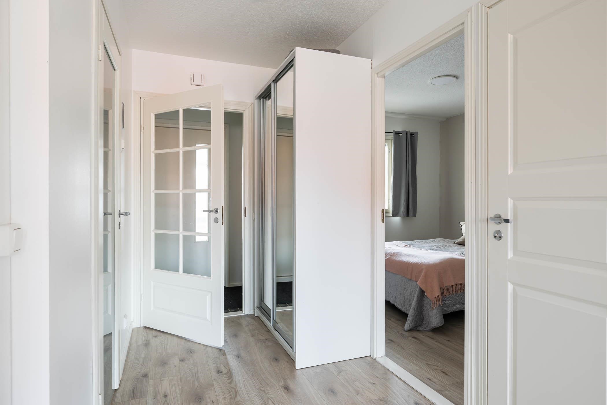 Keittiö: laminaattilattia/seinät maalattu, työtaso puuta. Olohuone: laminaattilattia/seinät maalattu. Makuuhuone 1: laminaattilattia/seinät maalattu. Sauna: puupaneloitu seinät ja katto/laattalattia. Kylpyhuone: laatta/laatta. Wc: laattalattia/seinät maalattu. Vaatehuone: laminaattilattia/seinät maalattu. Eteinen: laattalattia/seinät maalattu.