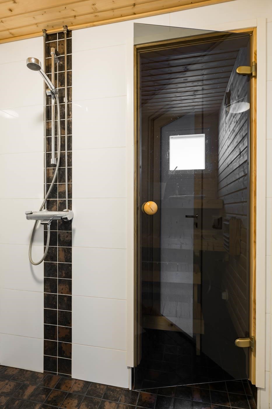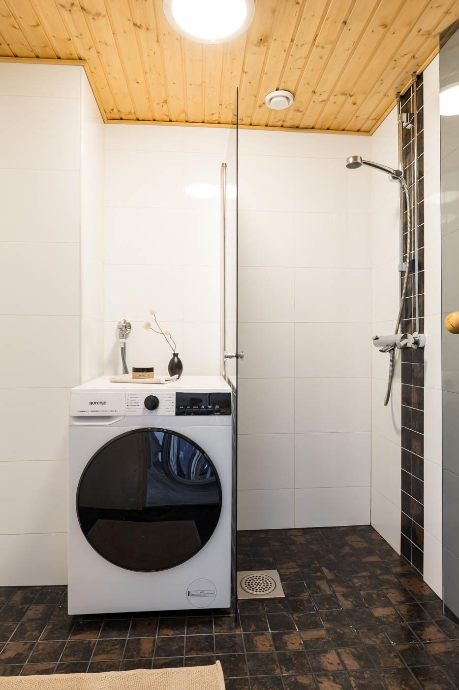 - Kylpyhuoneessa suihku,suihkuseinä,pesukoneliitäntä ja lattialämmitys.Erillinen wc jossa wc-istuin, allaskaappi,peili,bidee ja korkeakaappi. Saunassa sähkökiuas ja kiinteä valaisin.