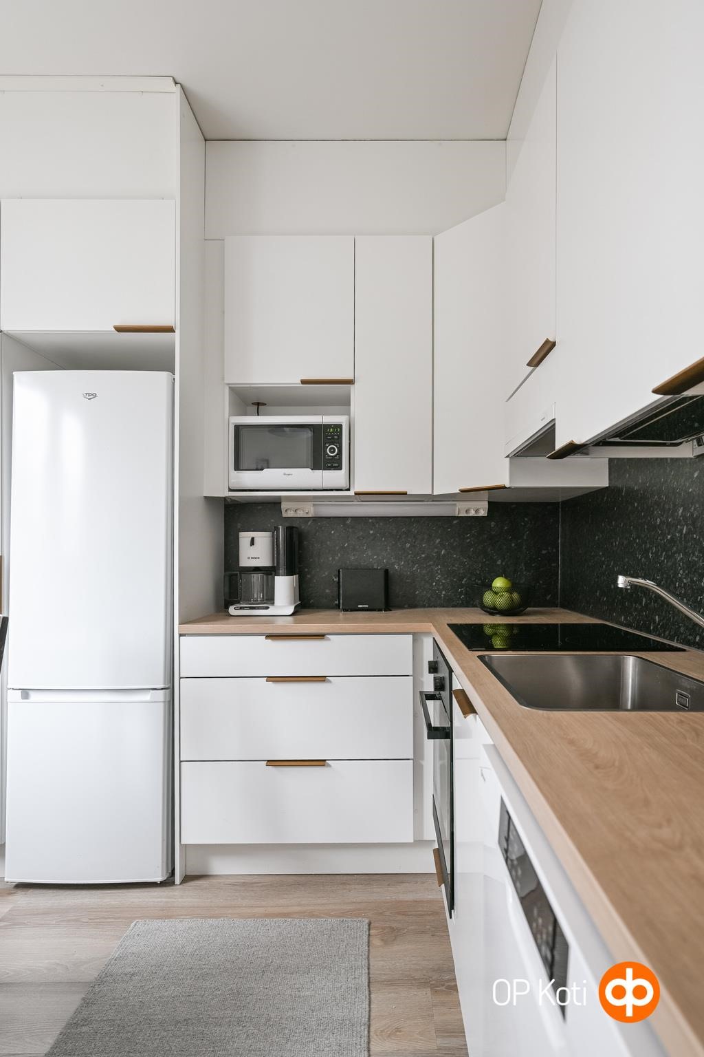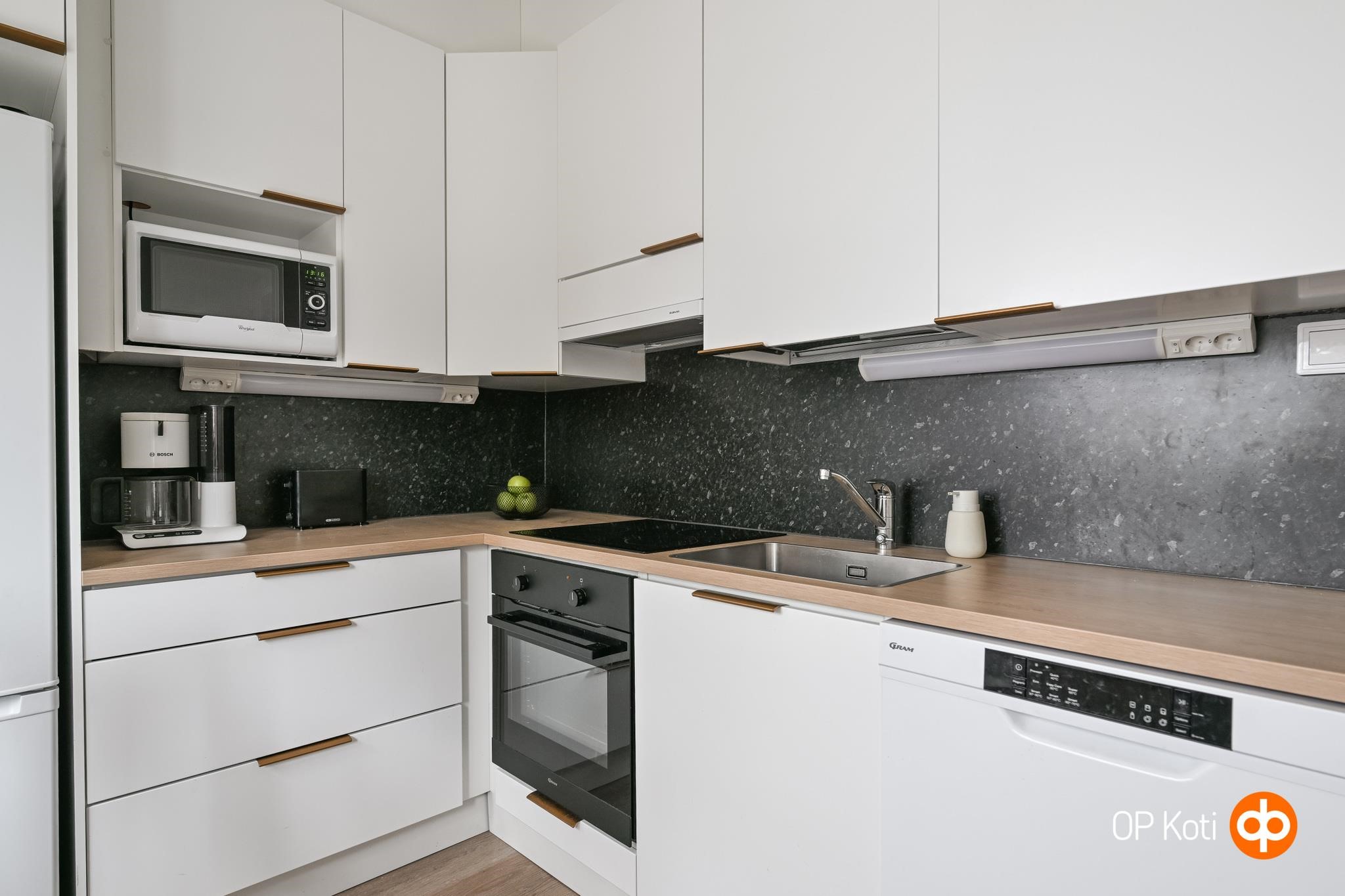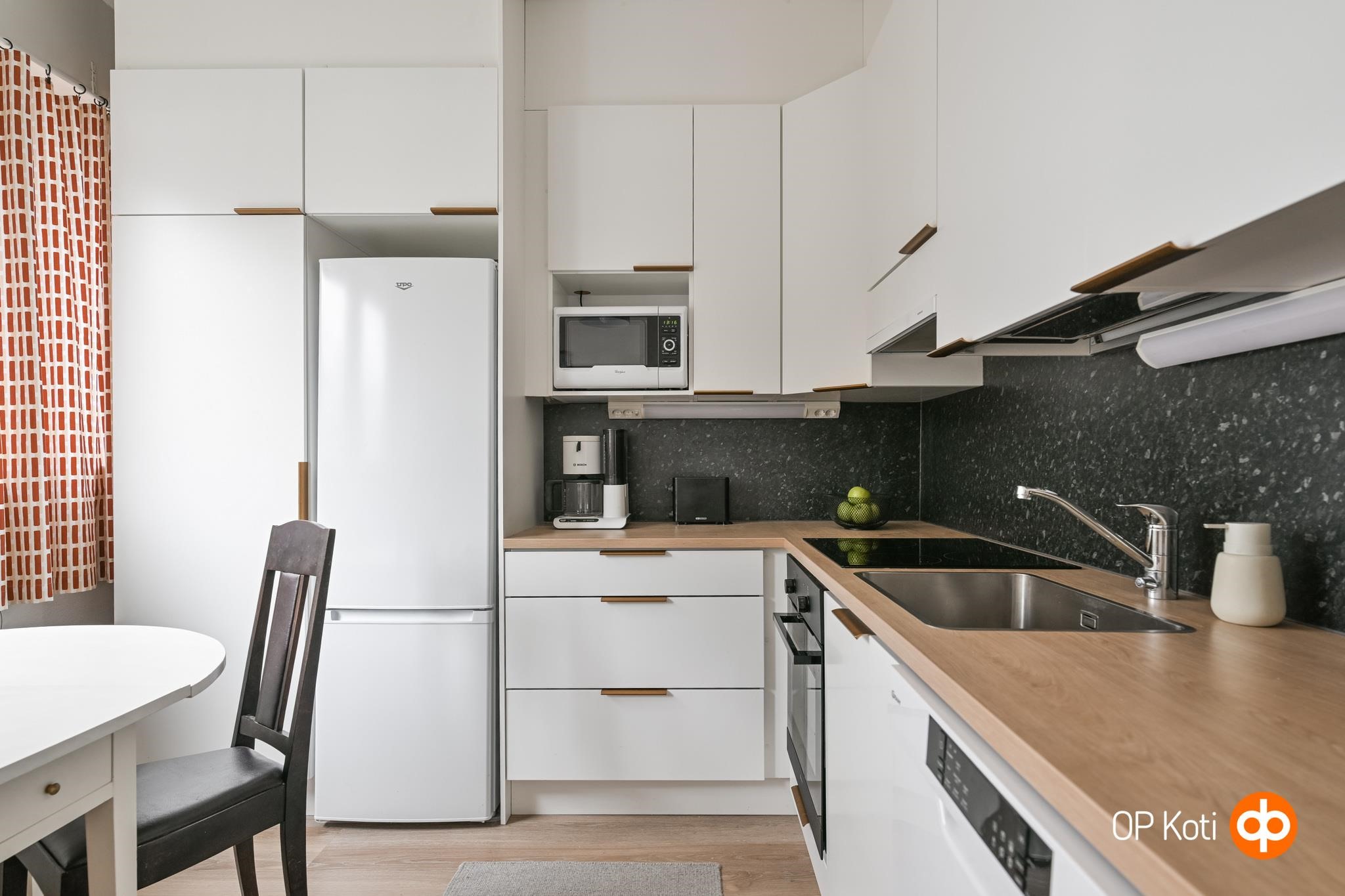 - Jääkaappipakastin, erillisuuni, induktioliesi, liesituuletin, astianpesukone, kaapistot, kiinteät valaisimet.
