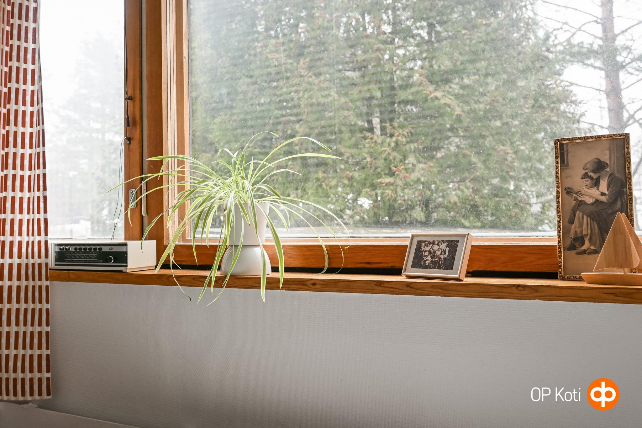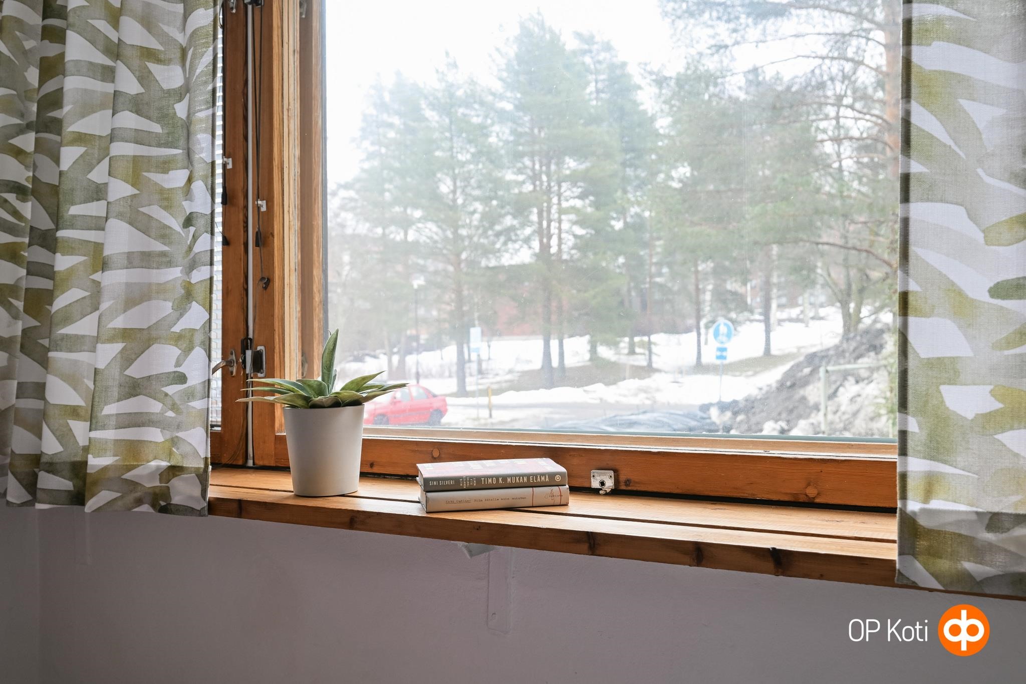 - Keittiön ja makuuhuoneen ikkunoista näkymät talon takapihalle. Olohuoneesta näkymät Viitaniementielle.