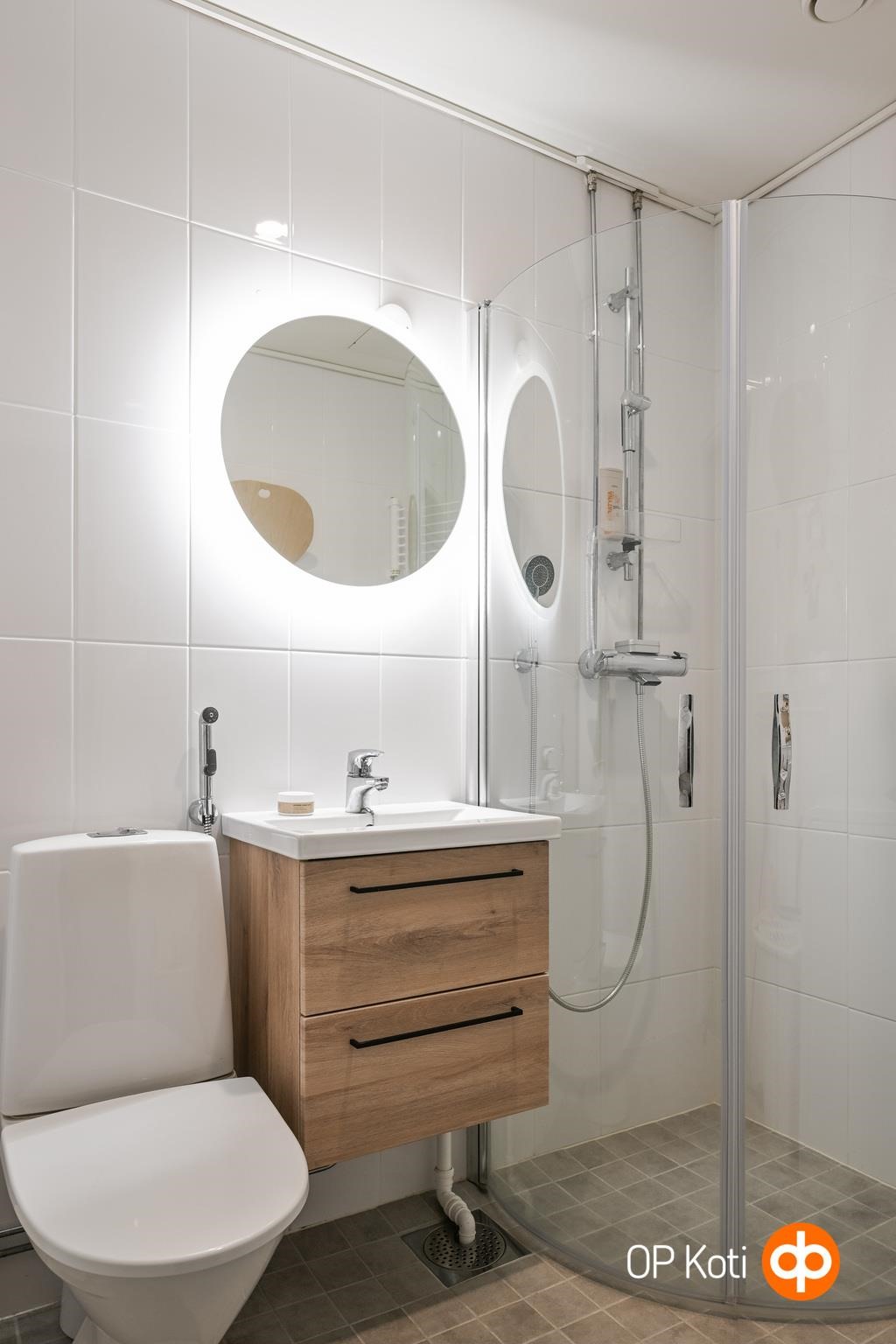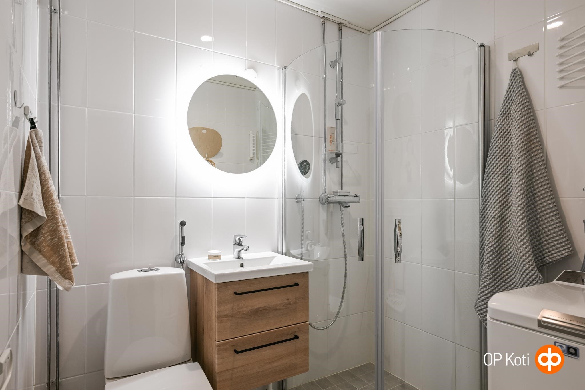 - Kylpyhuone, suihku, suihkuseinä, peilit, allaskaappi, pesukoneliitäntä, lattialämmitys, kiinteät valaisimet.