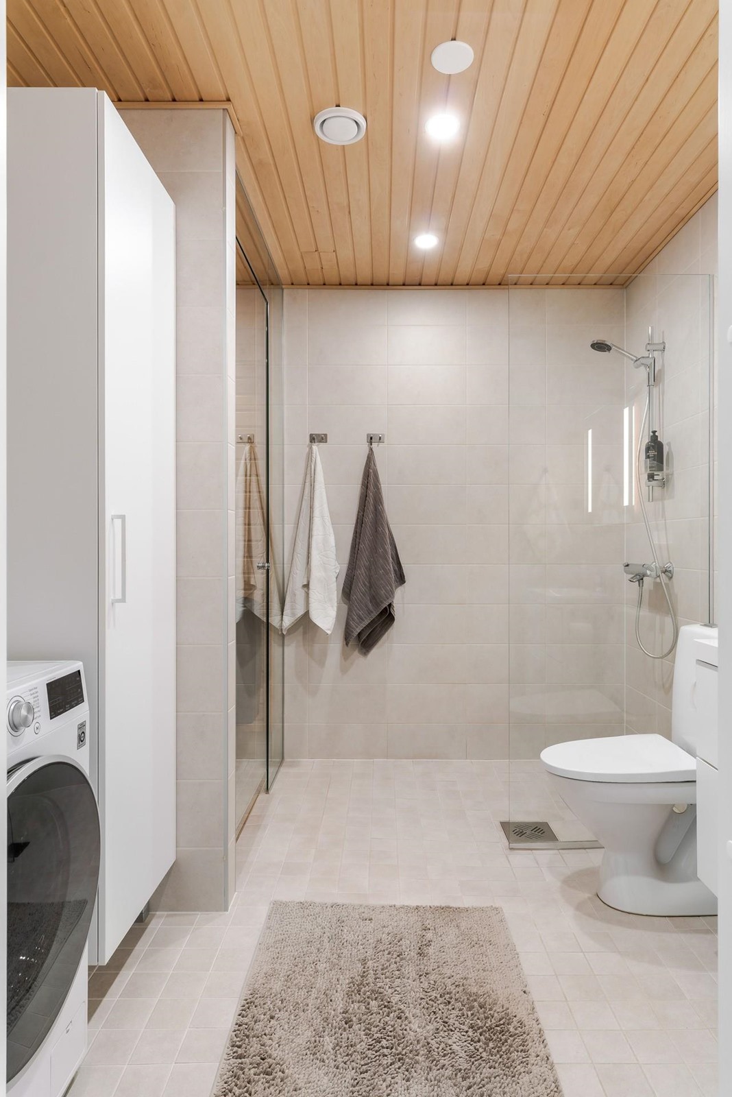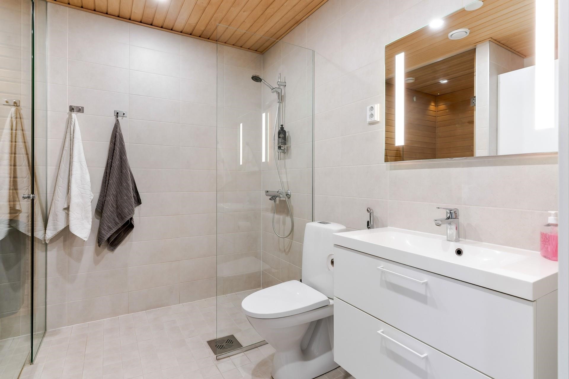 - Sauna, sähkökiuas, kylpyhuone, suihku, suihkuseinä, peilit 1 kpl, kaapit täyskorkea kaappi, allaskaappi, pesukoneliitäntä, lattialämmitys, kiinteät valaisimet.