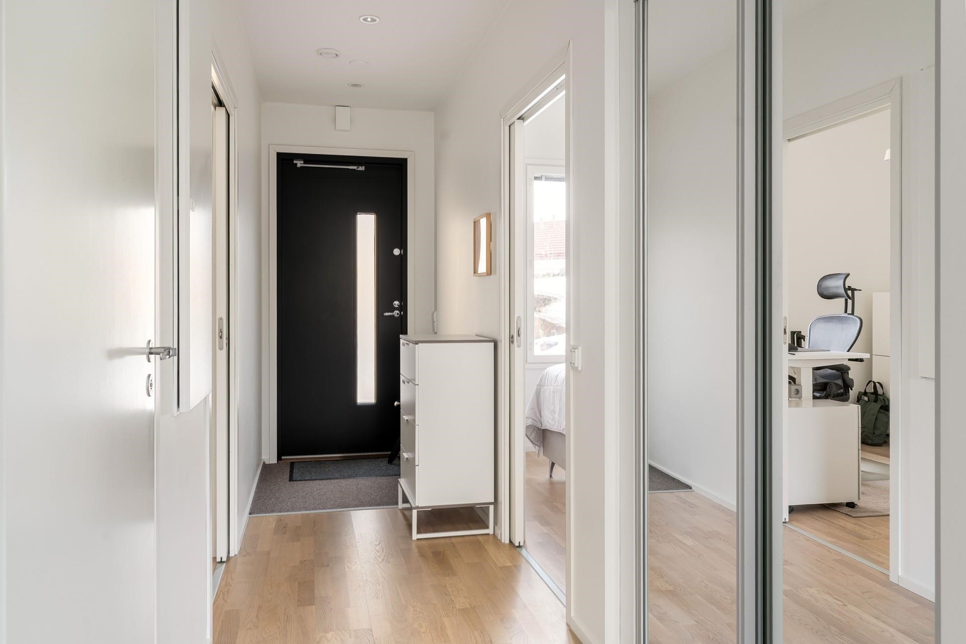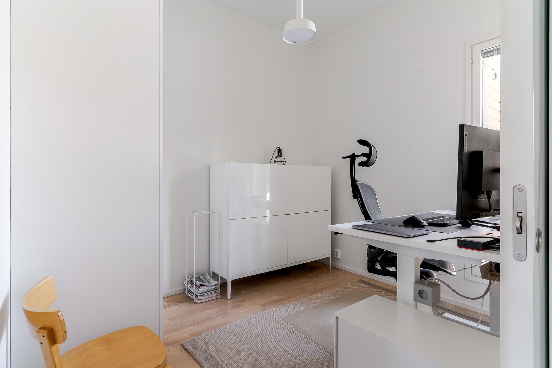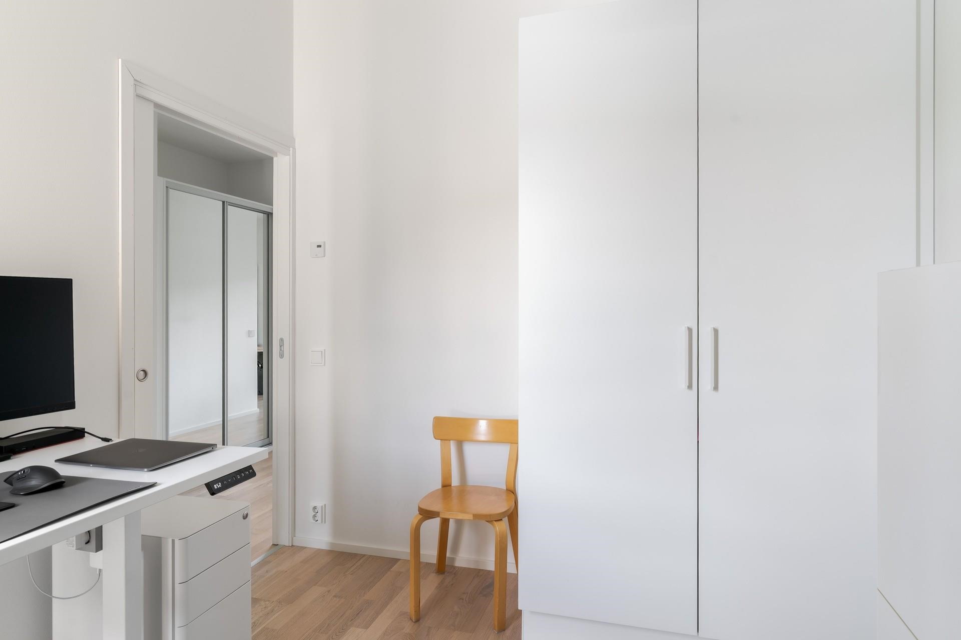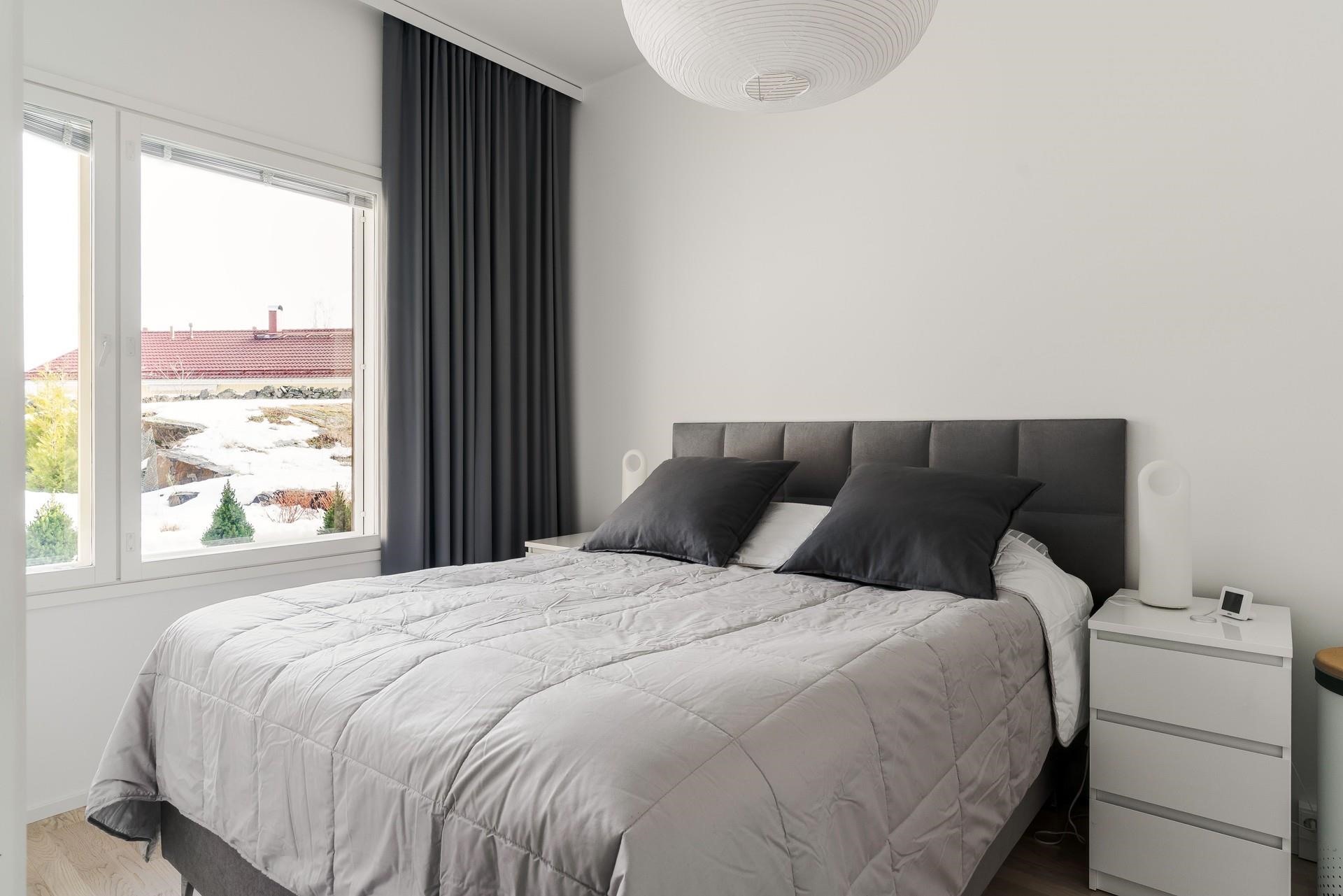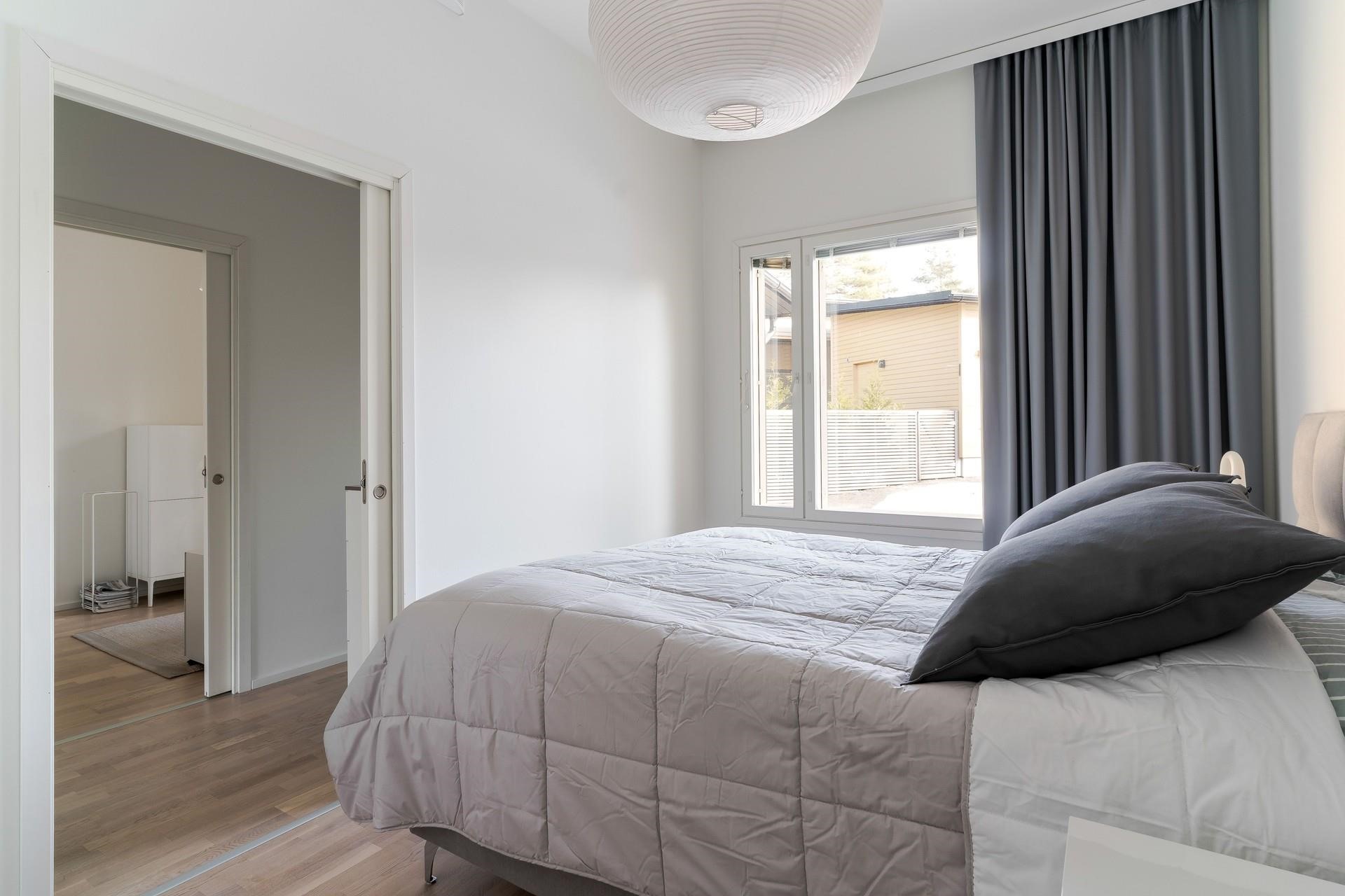 Makuuhuoneet sijoittuvat taloyhtiön rauhalliselle sisäpihan puolelle, joista toinen tarjoaa hieman enemmän tilaa. Huoneista avautuvat avarat näkymät yhtiön sisäpihalle kallioineen, mikä lisää kodin levollista tunnelmaa. Tyylikäs kylpyhuone ja sauna luovat rentouttavat puitteet arkeen.