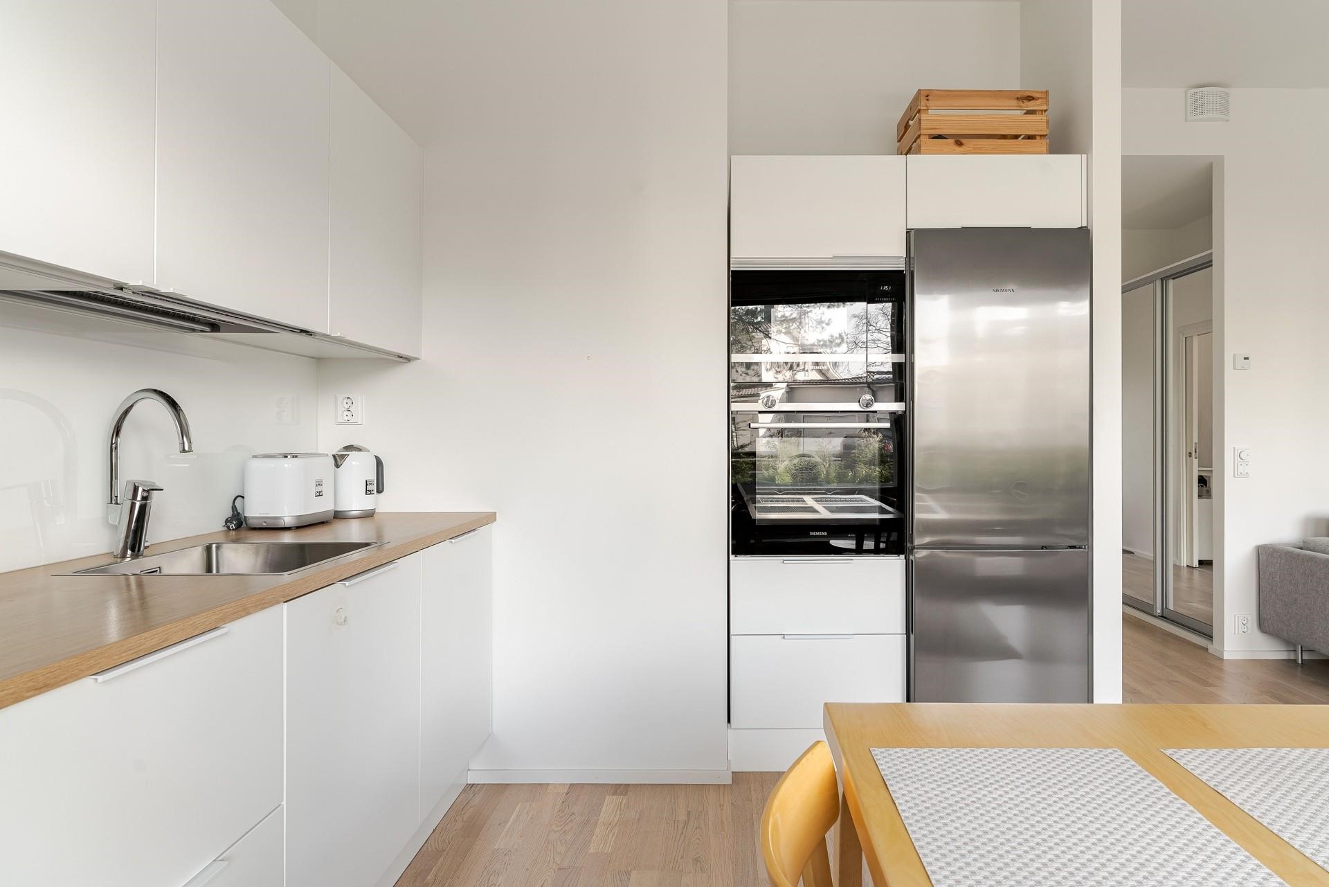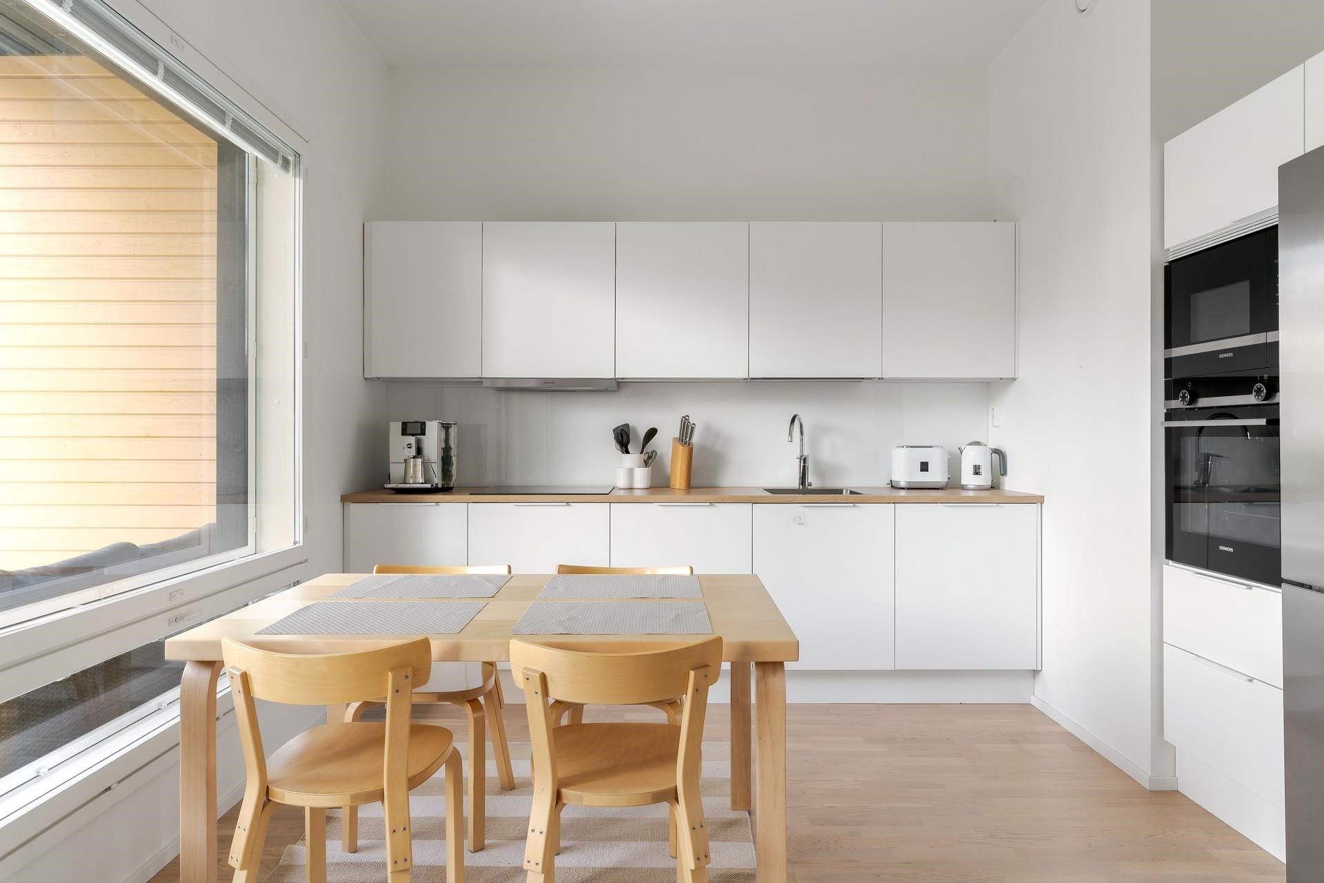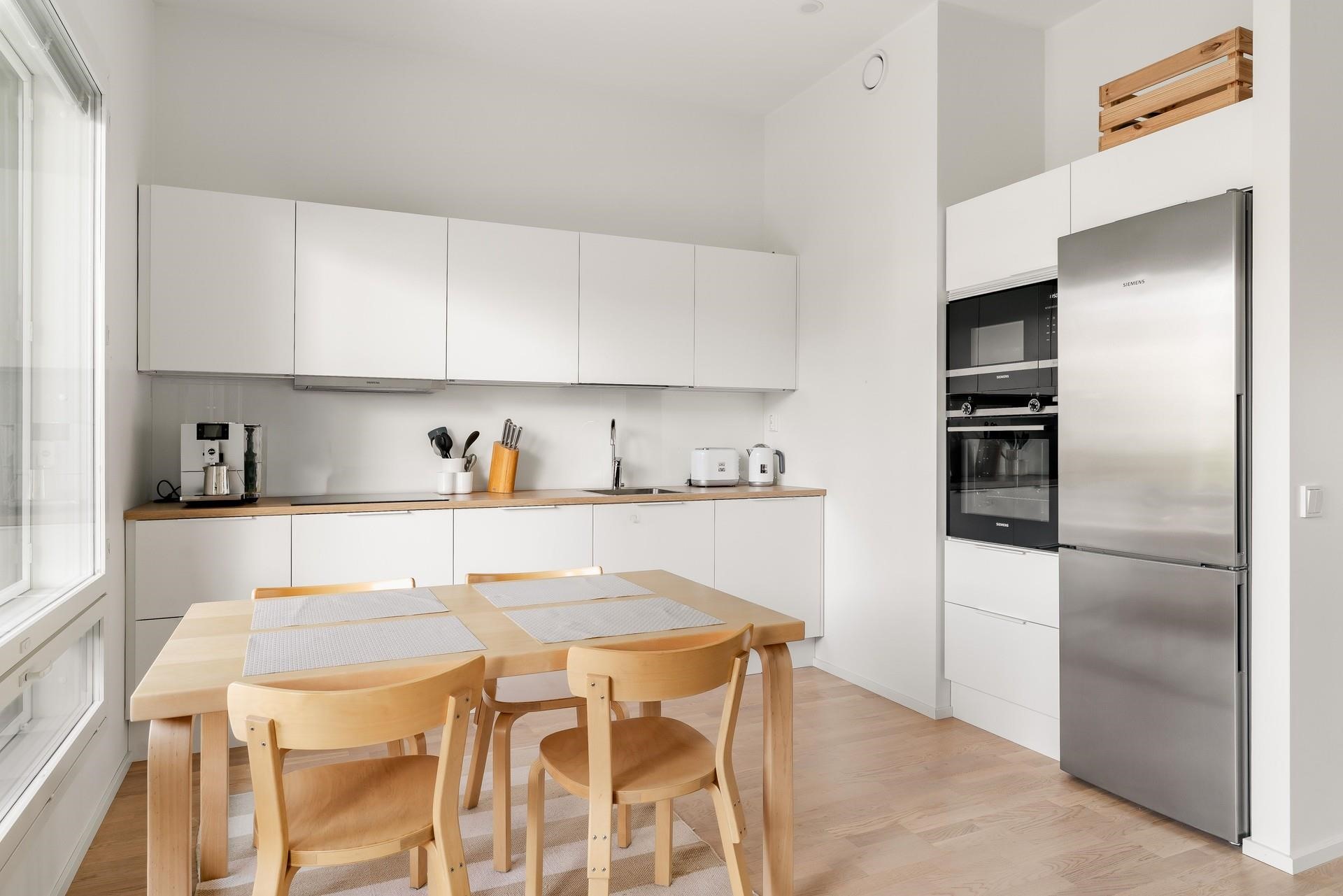 - Jääkaappipakastin, erillisuuni kiertoilma, induktioliesi, liesituuletin, mikroaaltouuni integroitu, astianpesukone, kaapistot, kiinteät valaisimet. Siemens kodinkoneet.
