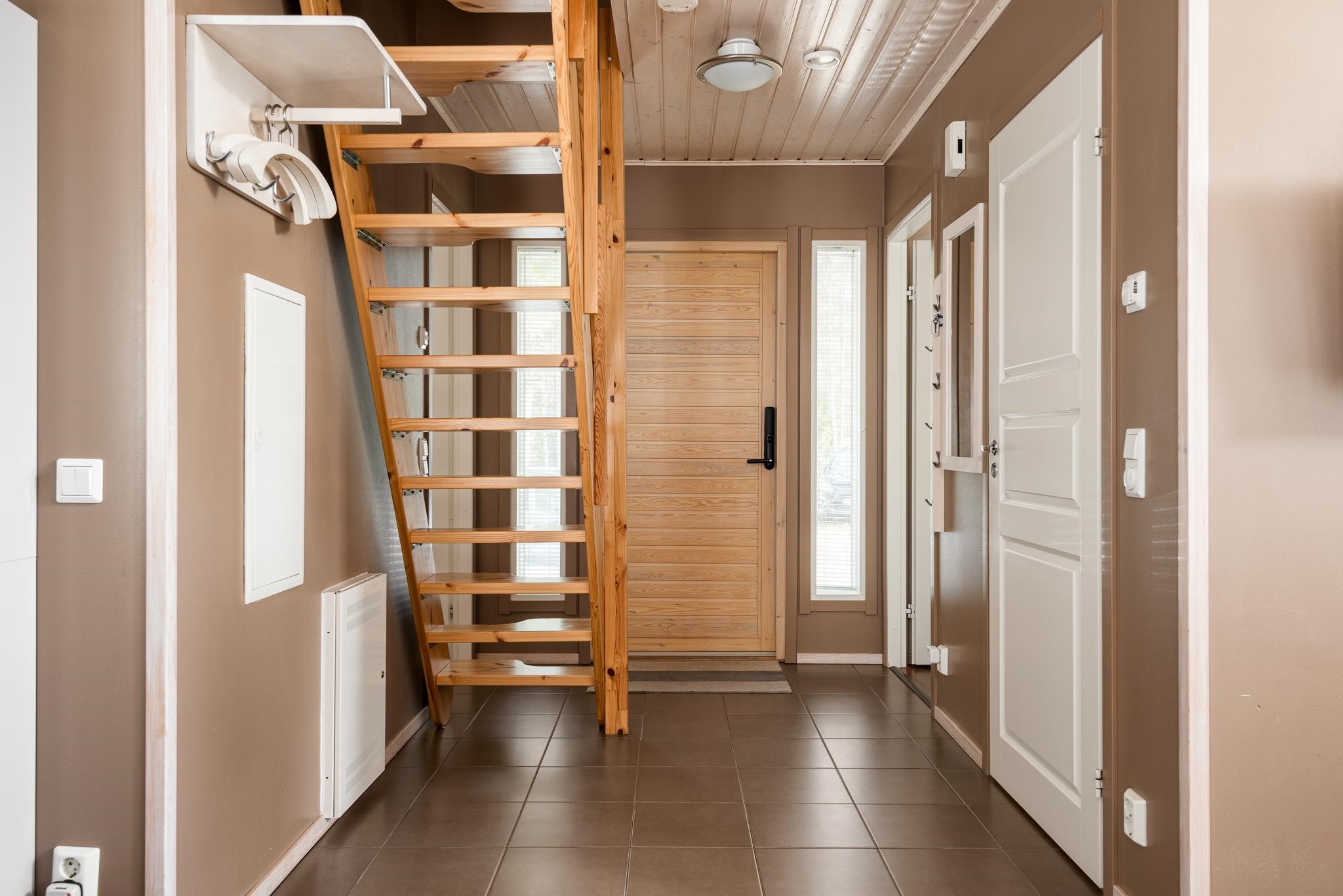 Keittiö: laatta/maali. Olohuone: Laatta/maali. Makuuhuone 1: laatta/maali. Makuuhuone 2: laatta/maali. Sauna: laatta/paneeli. Kylpyhuone: laatta/laatta. Wc: laatta/laatta. parvi: laminaatti/maali.
