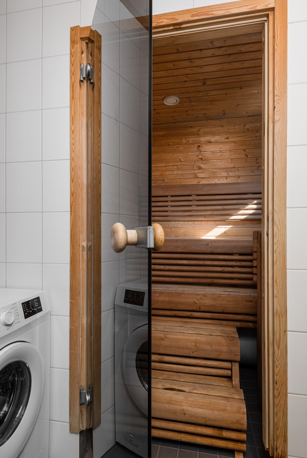 - Sauna, sähkökiuas, suihku, kiinteät valaisimet.