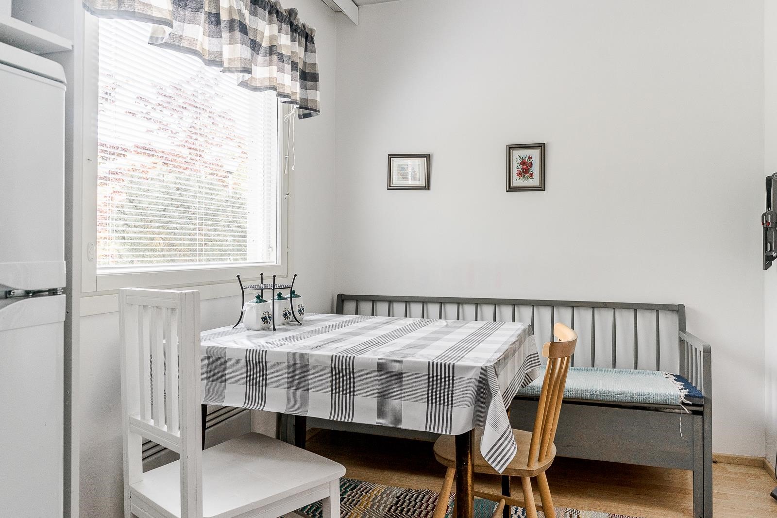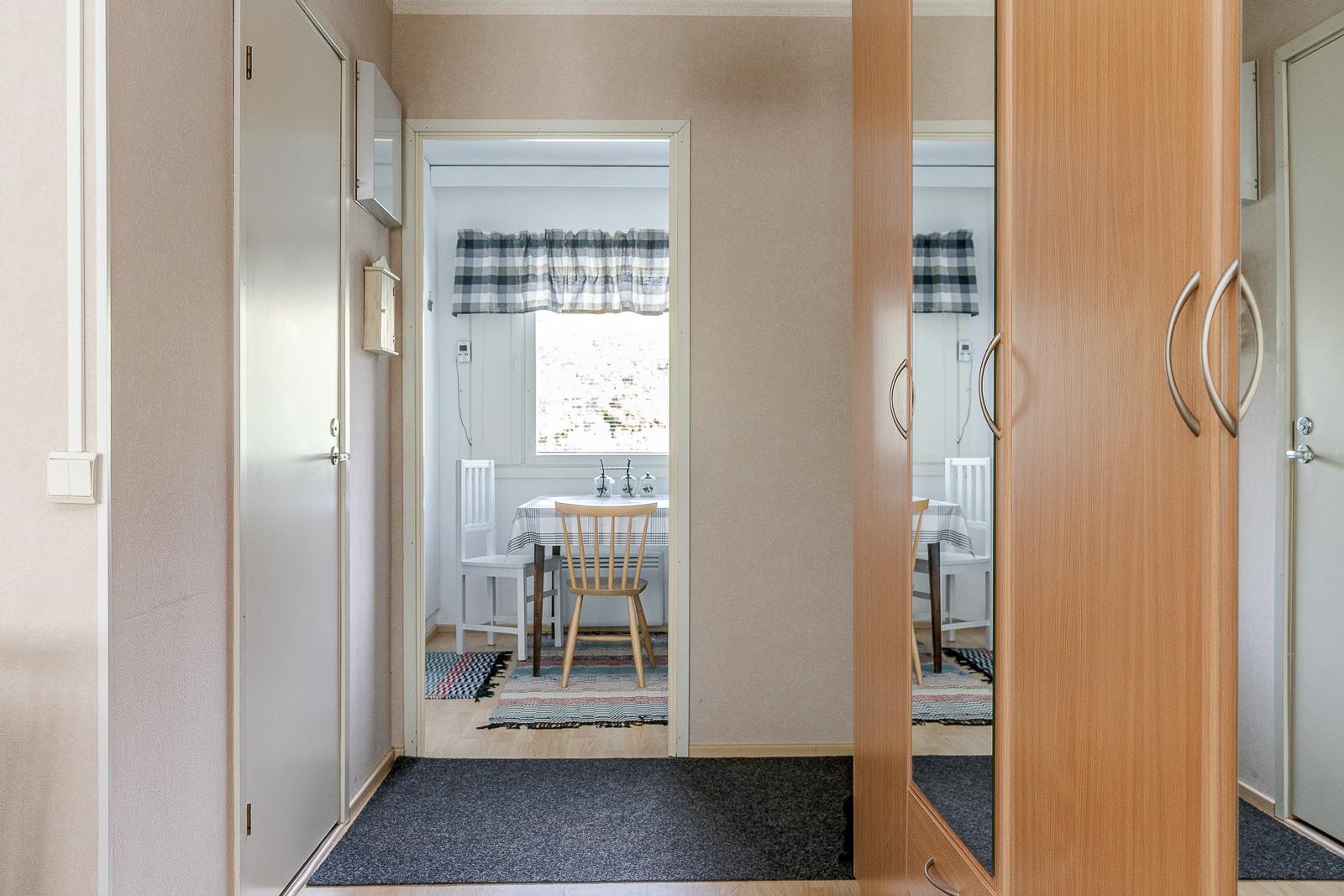 - Keittiön ikkuna pohjoiseen etupihalle ja olohuoneen ikkuna ja parveke etelään.