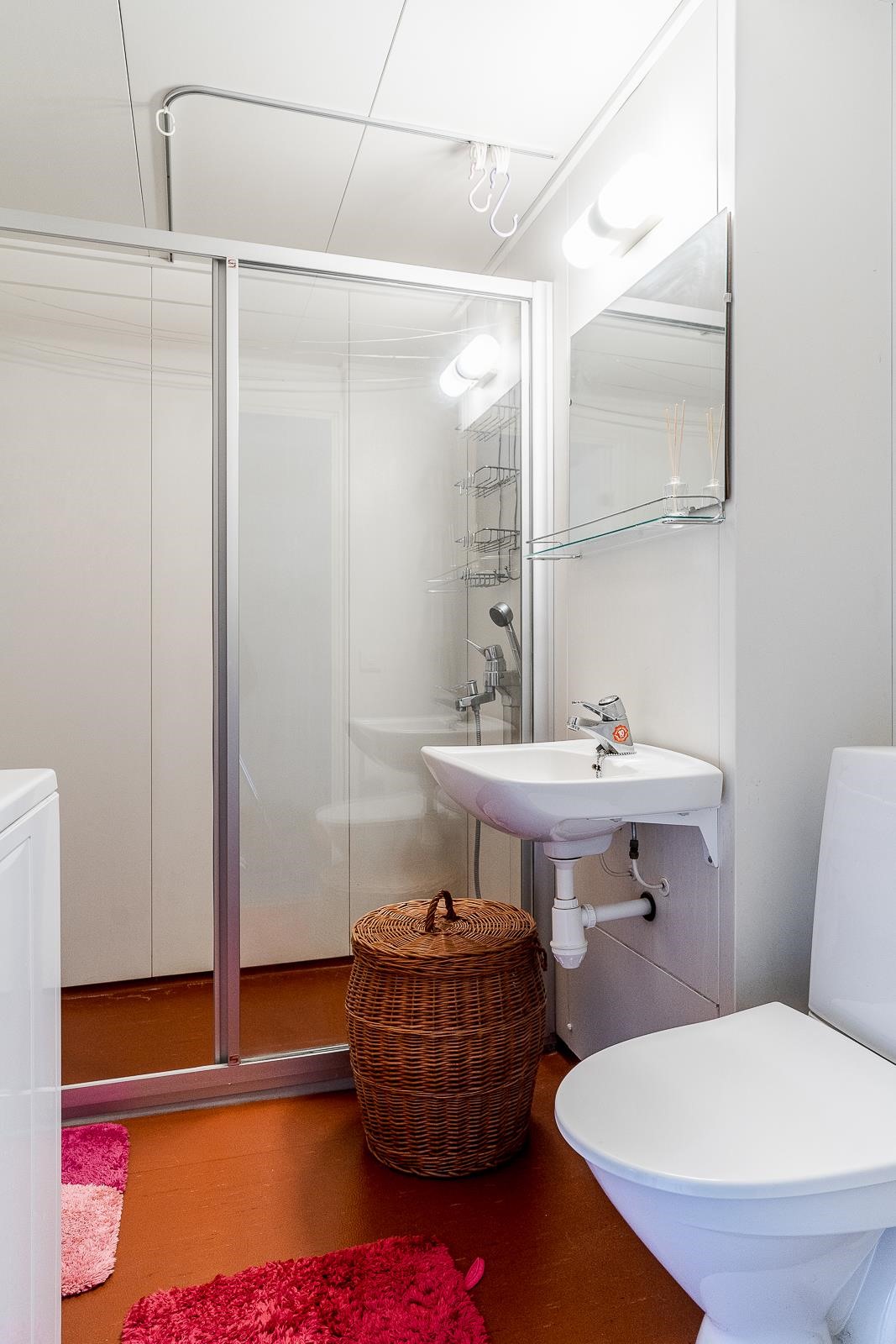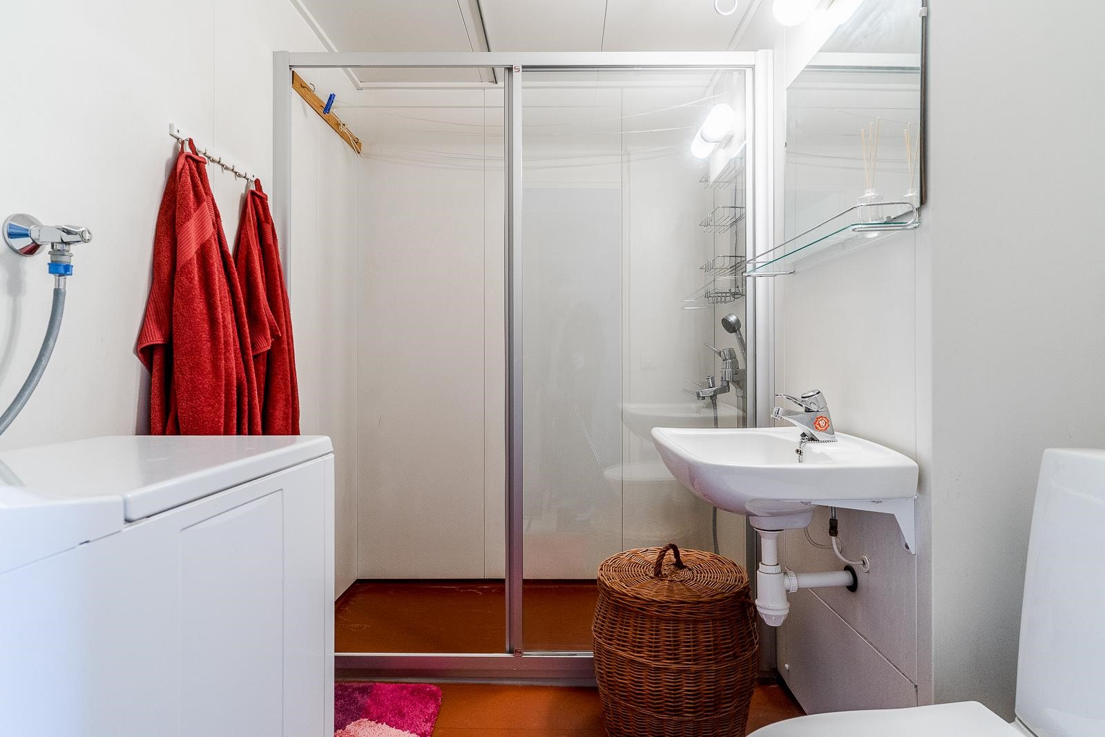 - Kylpyhuone, suihku, suihkukaappi, peilit, pesukoneliitäntä, lattialämmitys, kiinteät valaisimet.