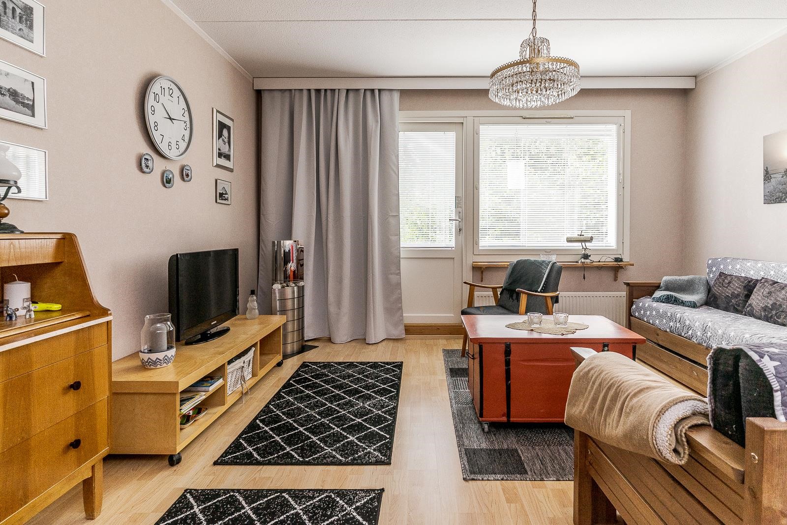 Keittiö: Laminaattilattia ja maalatut seinät. Olohuone: Laminaattilattia ja tapetoidut seinät. Kylpyhuone: Vinyylimatto ja vinyyliverhoillut peltiseinät.