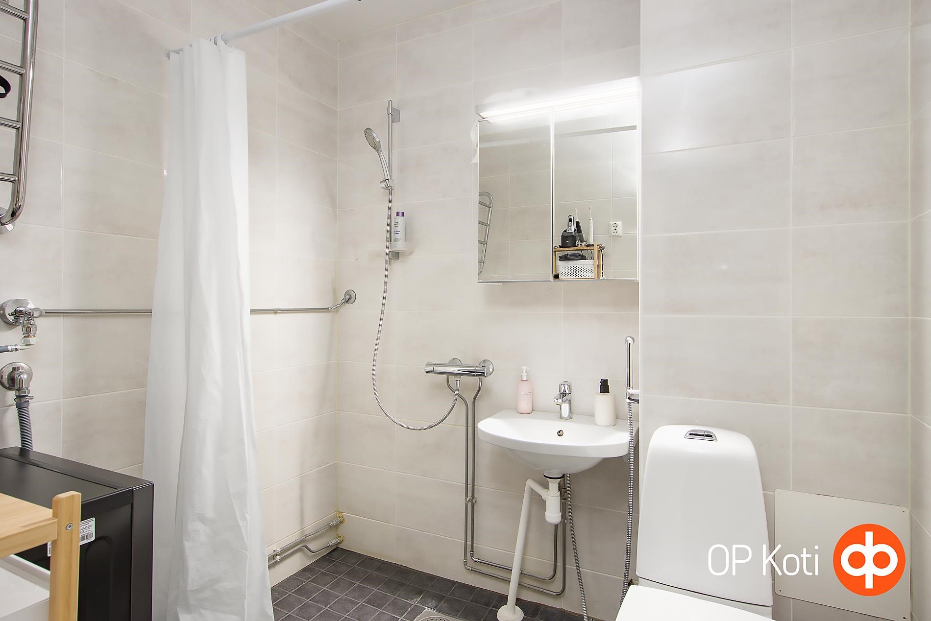 - Kylpyhuone, suihku, peilikaappi, pesukoneliitäntä, lattialämmitys Vesikiertoinen. Kylpyhuone remontoitu taloyhtiön puolesta n.8 v sitten.