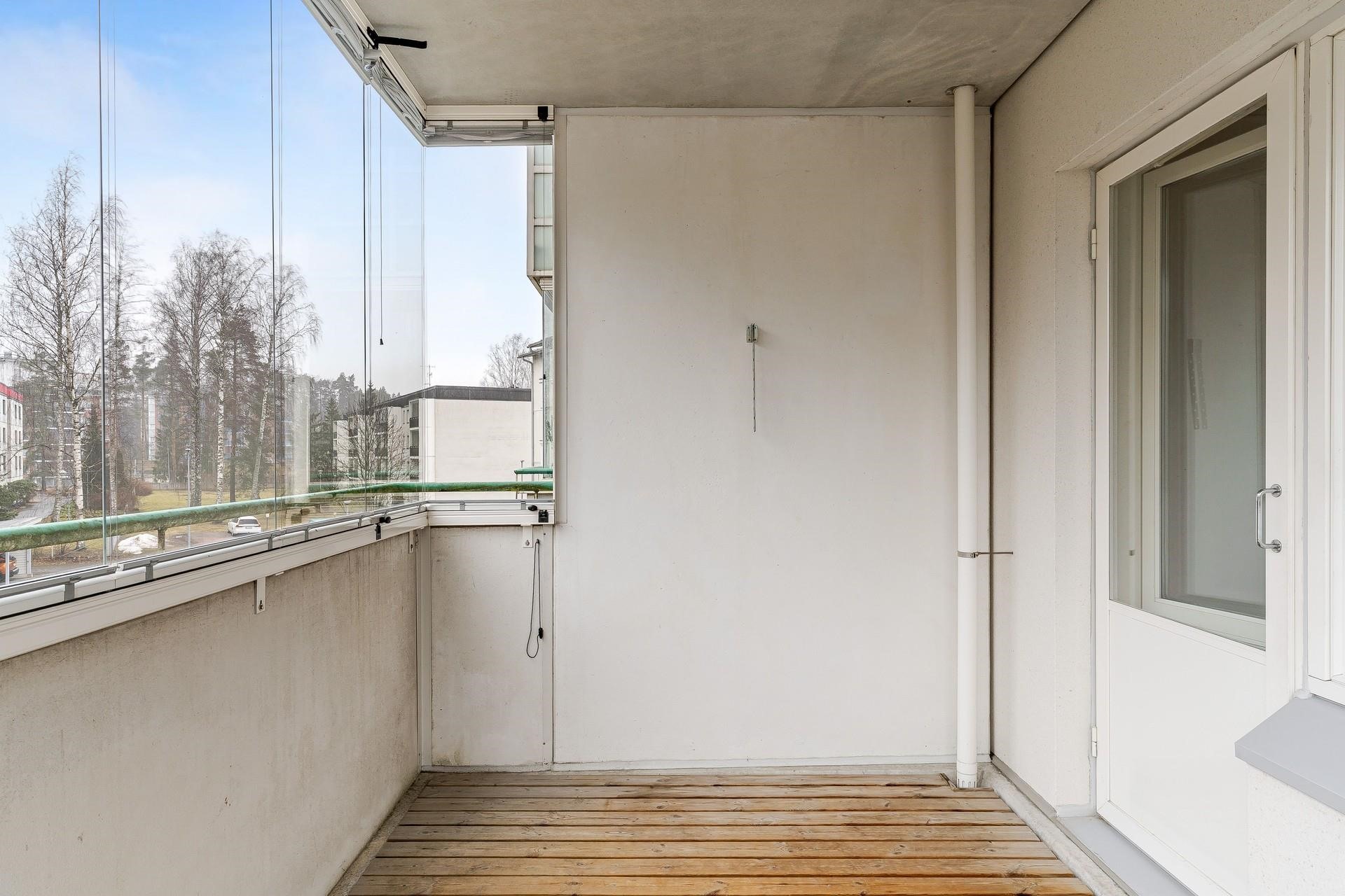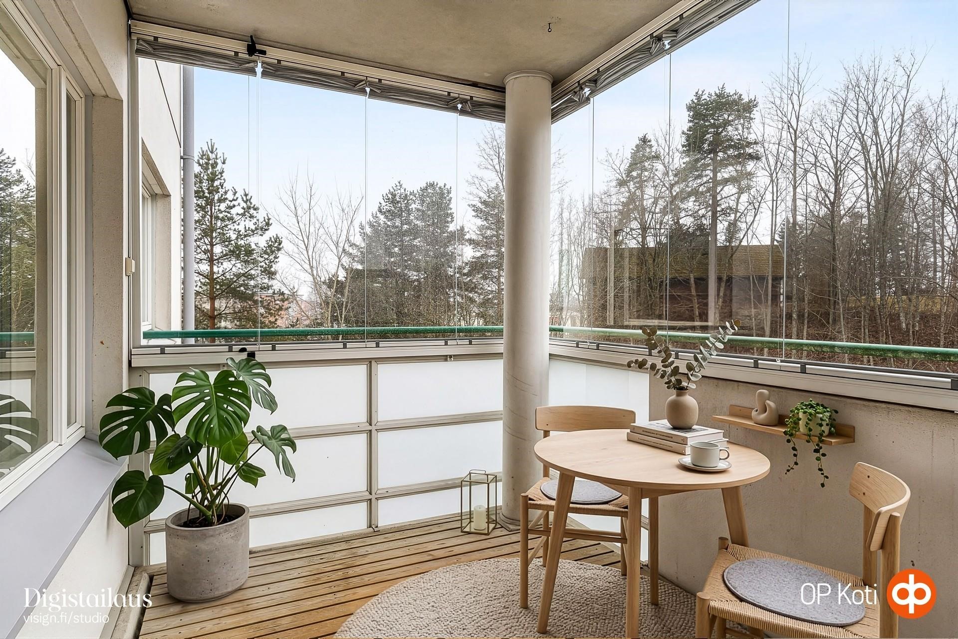 Tässä Aarnenpolun kaksiossa on kaikki, mitä hyvä asumiselta voi toivoa. Oma sauna, iso, lasitettu parveke, erillinen ruokailutila, tilava keittiö, runsaasti säilytystilaa ja kaiken kukkuraksi taloyhtiössä on myös hissi. Huoneiston näkymät ovat luonnonläheiset ja mikä viehättävämpää, kuin vaikka piipahtaa aamutossusillaan naapurissa sijaitsevassa kahvilassa.