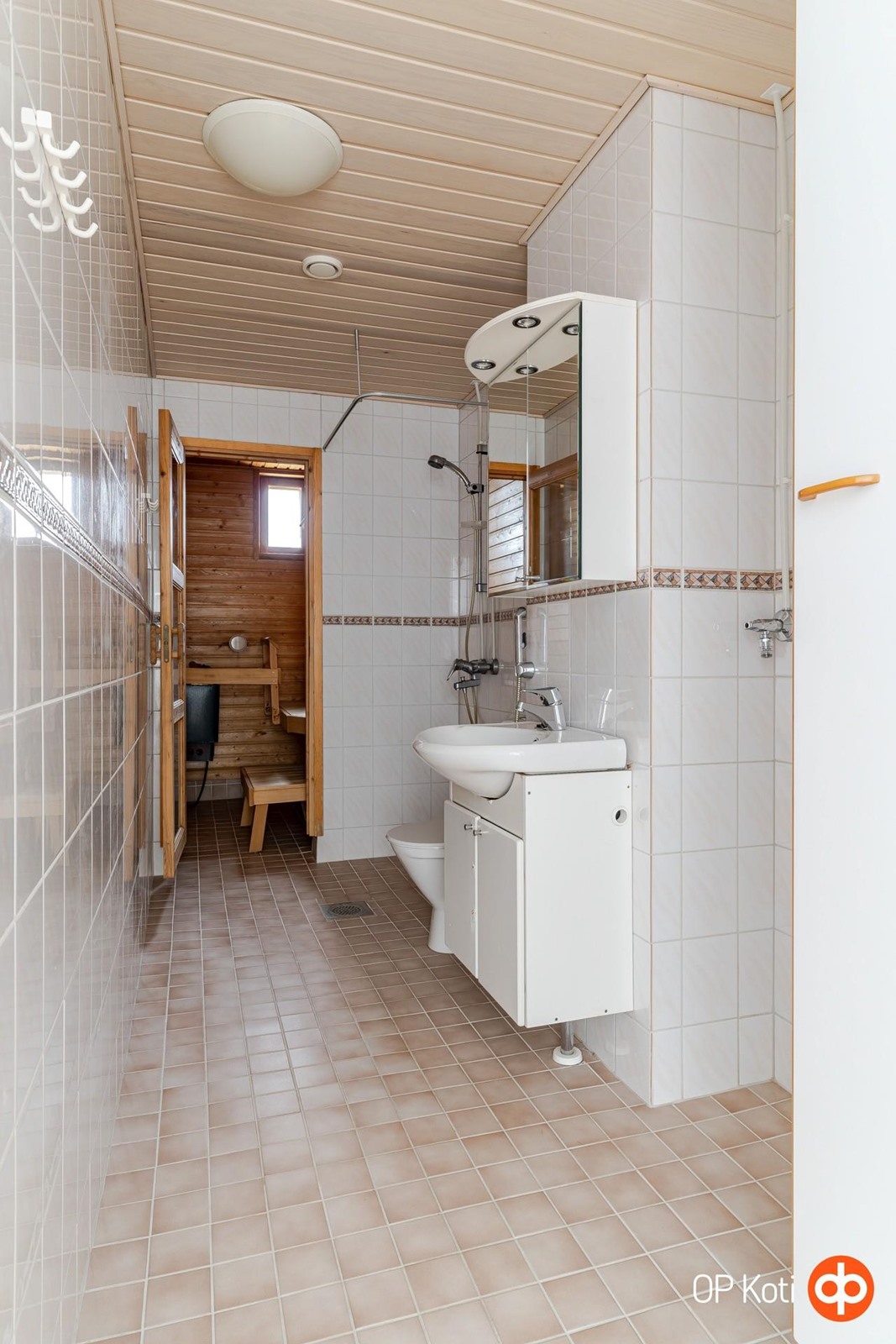 - Sauna, sähkökiuas, kylpyhuone, suihku, peilikaappi, pesukoneliitäntä, kiinteät valaisimet.