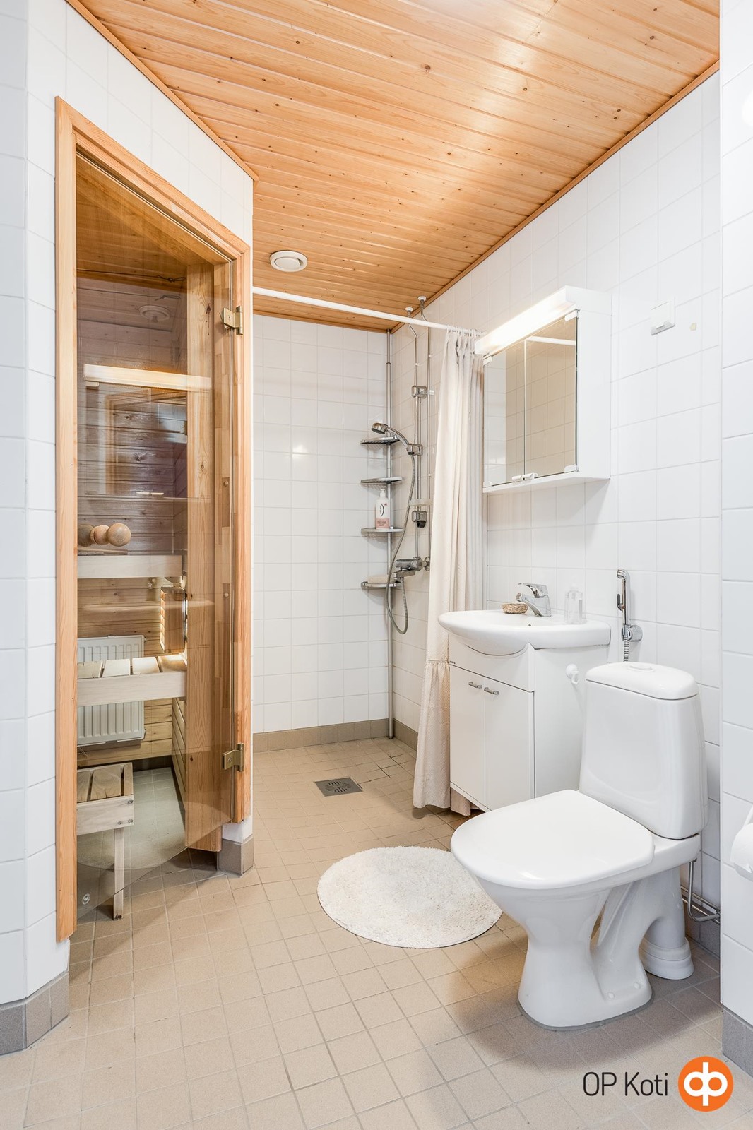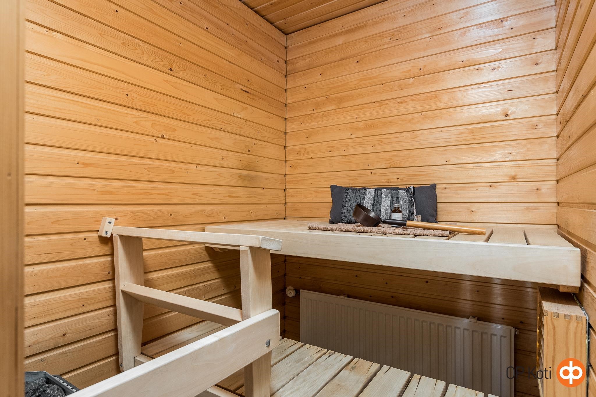 - Sauna, sähkökiuas, kylpyhuone, suihku, peilikaappi, allaskaappi, pesukoneliitäntä, lattialämmitys, kiinteät valaisimet.