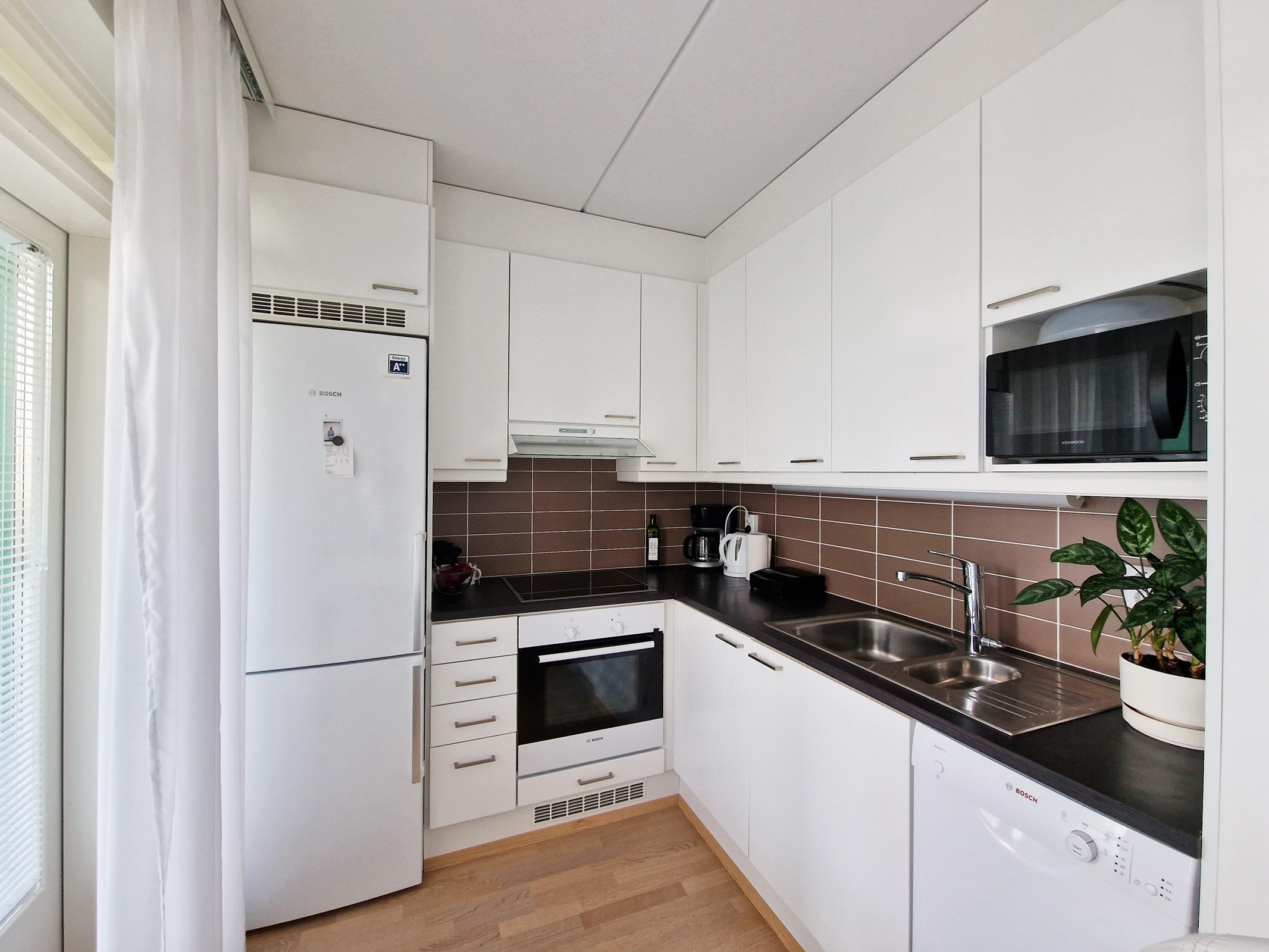 - Jääkaappipakastin, erillisuuni, liesitaso, liesituuletin, astianpesukone, kaapistot, kiinteät valaisimet.