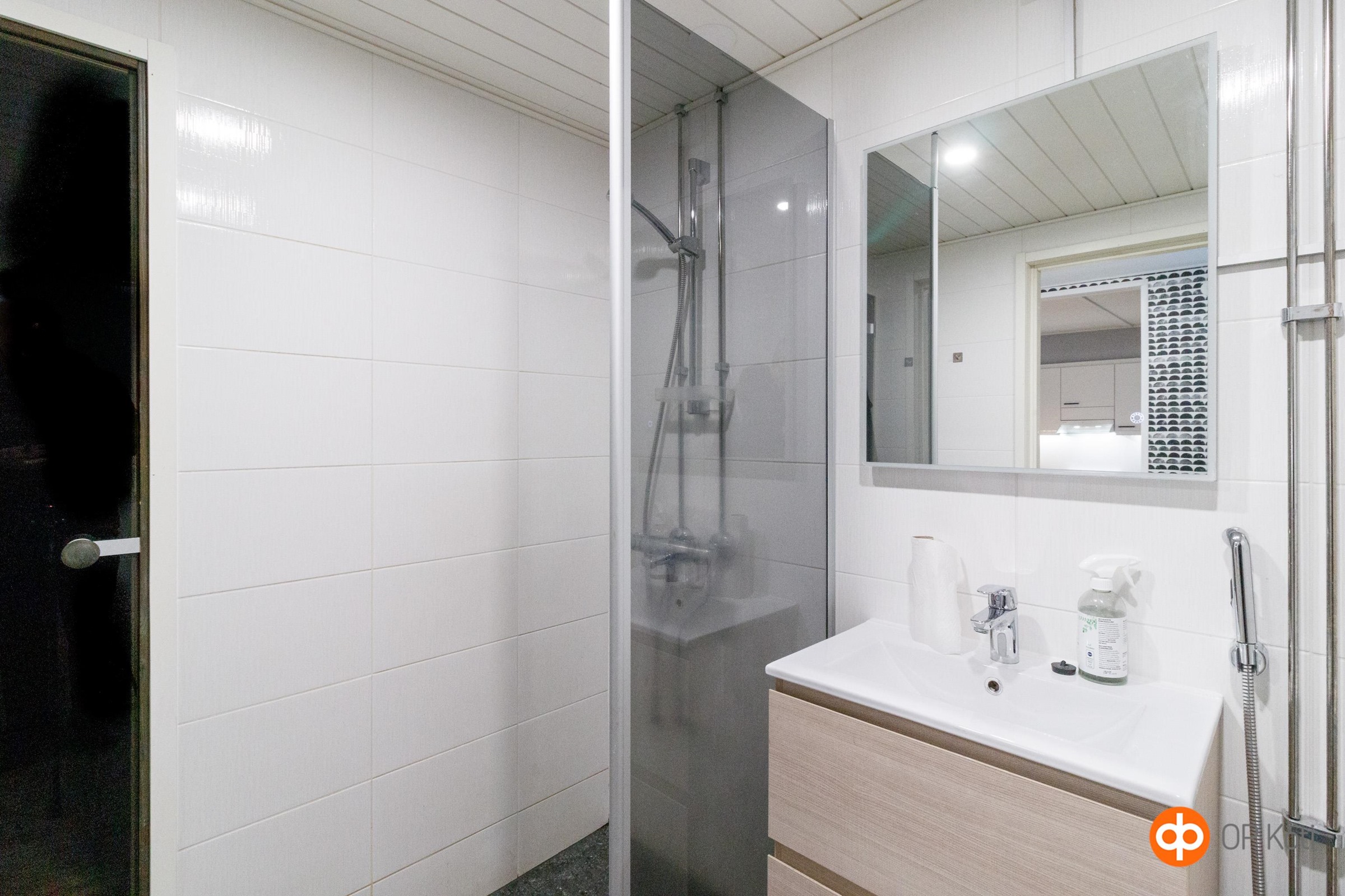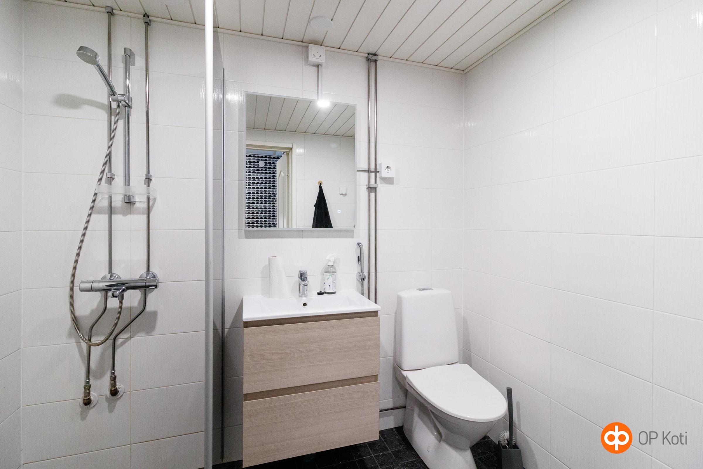 - Sauna, sähkökiuas, kylpyhuone, suihku, suihkuseinä, peilit, allaskaappi, pesukoneliitäntä, lattialämmitys vesikiertoinen, kiinteät valaisimet.