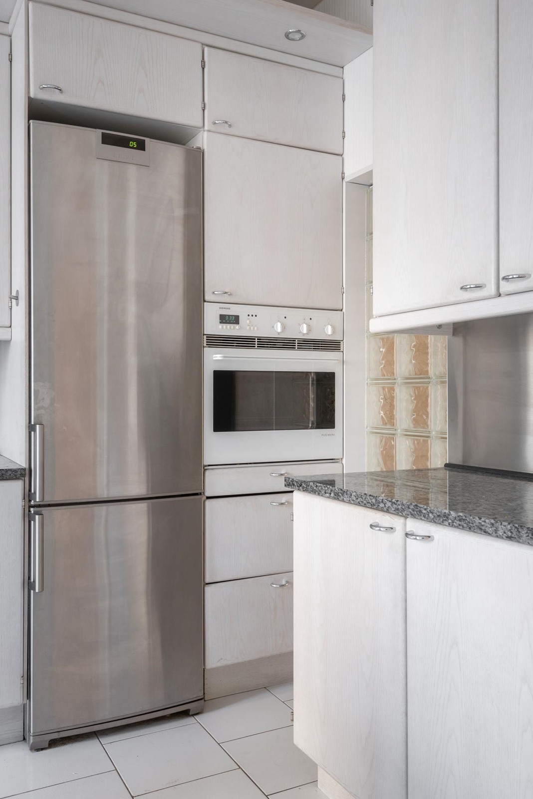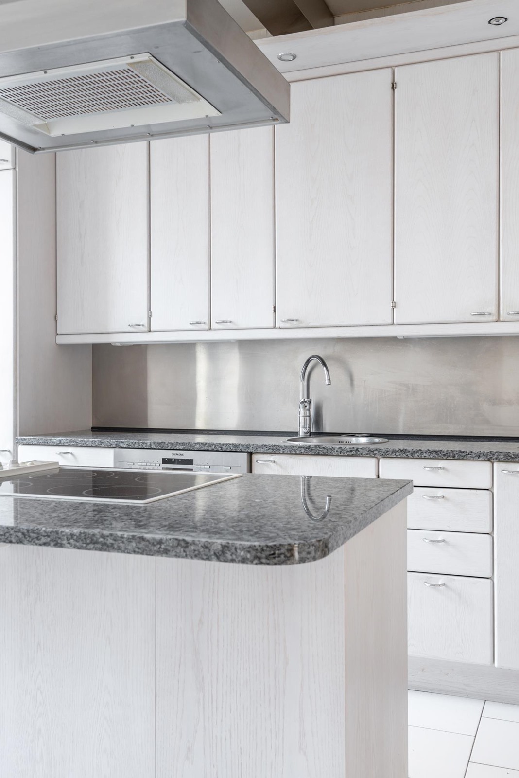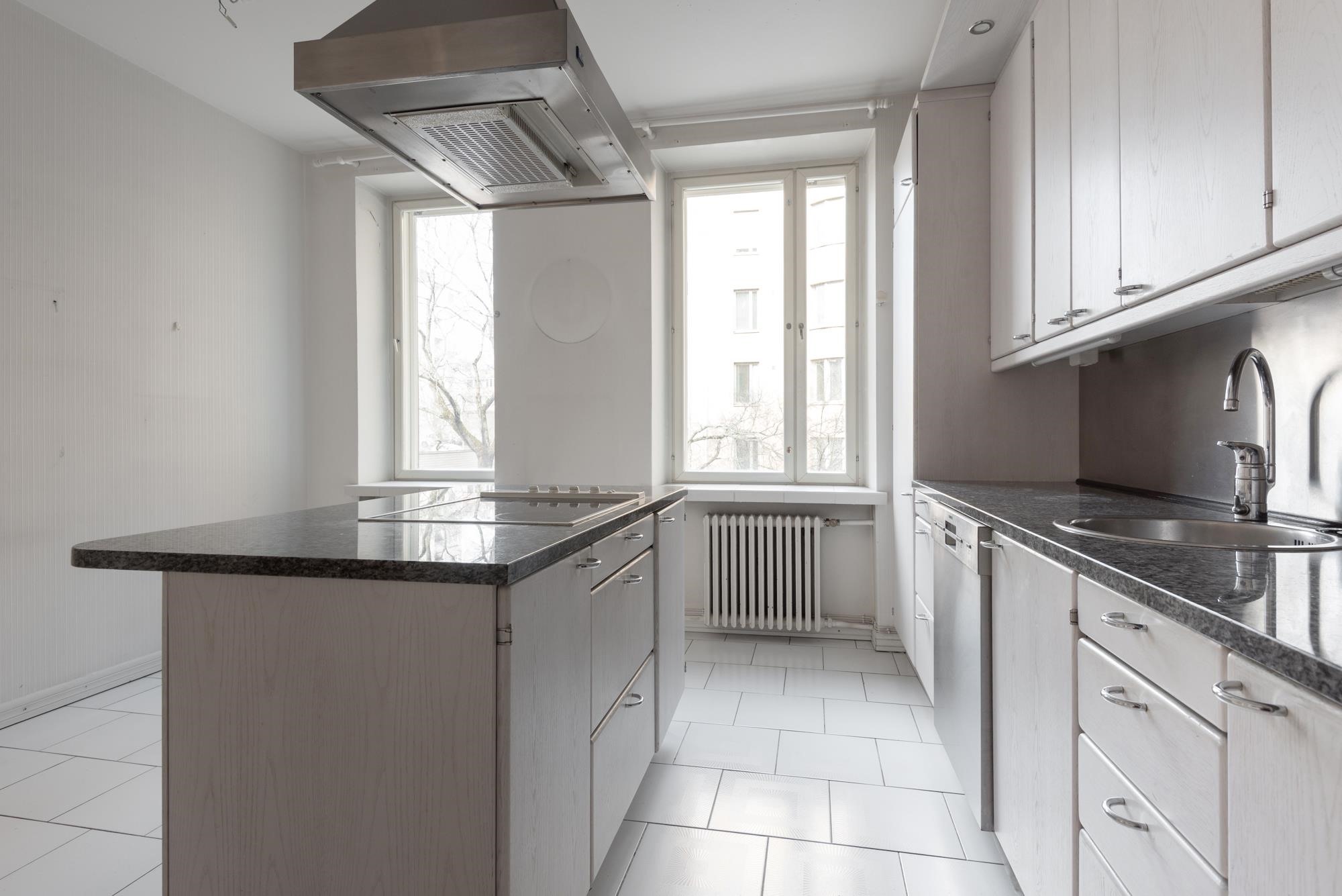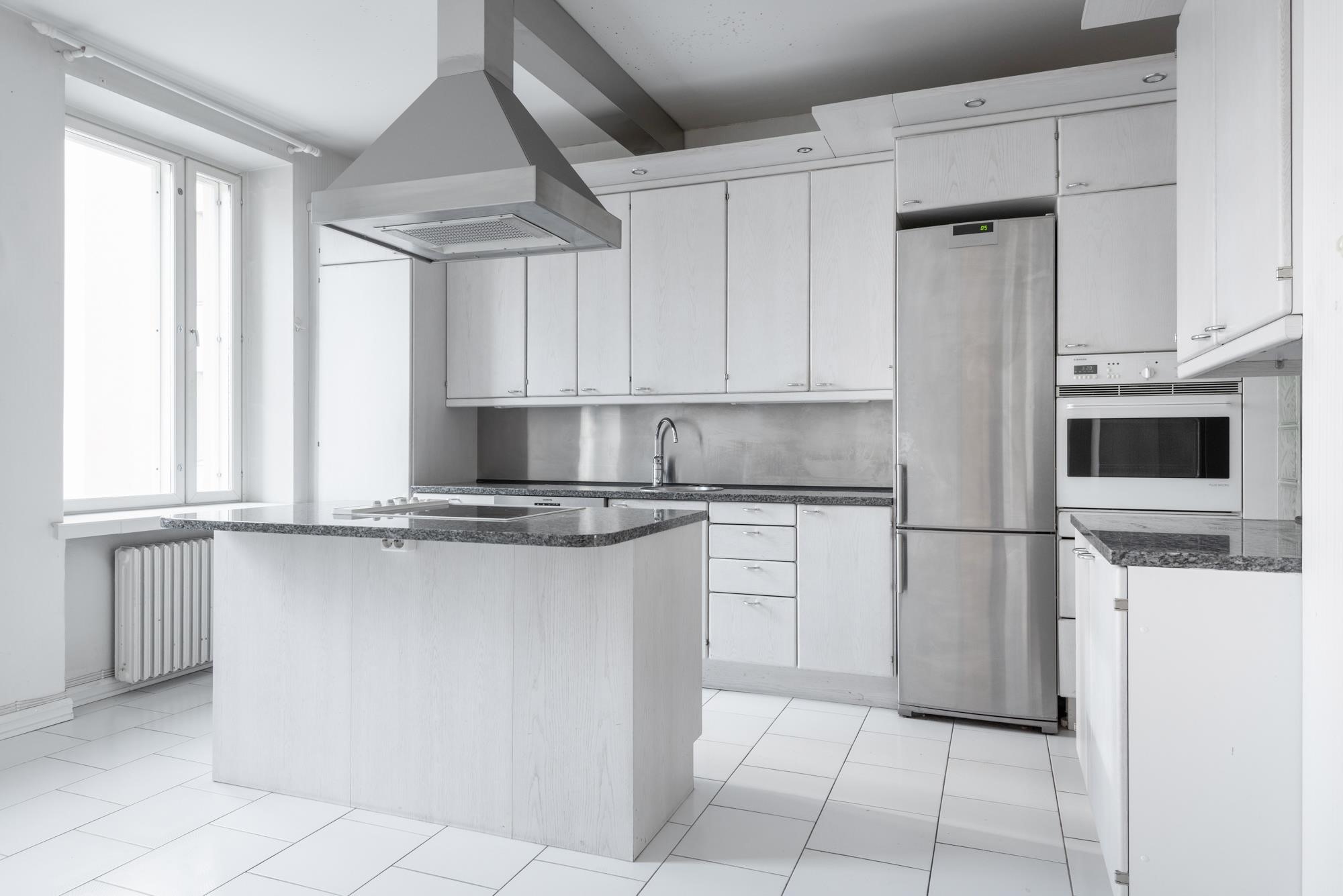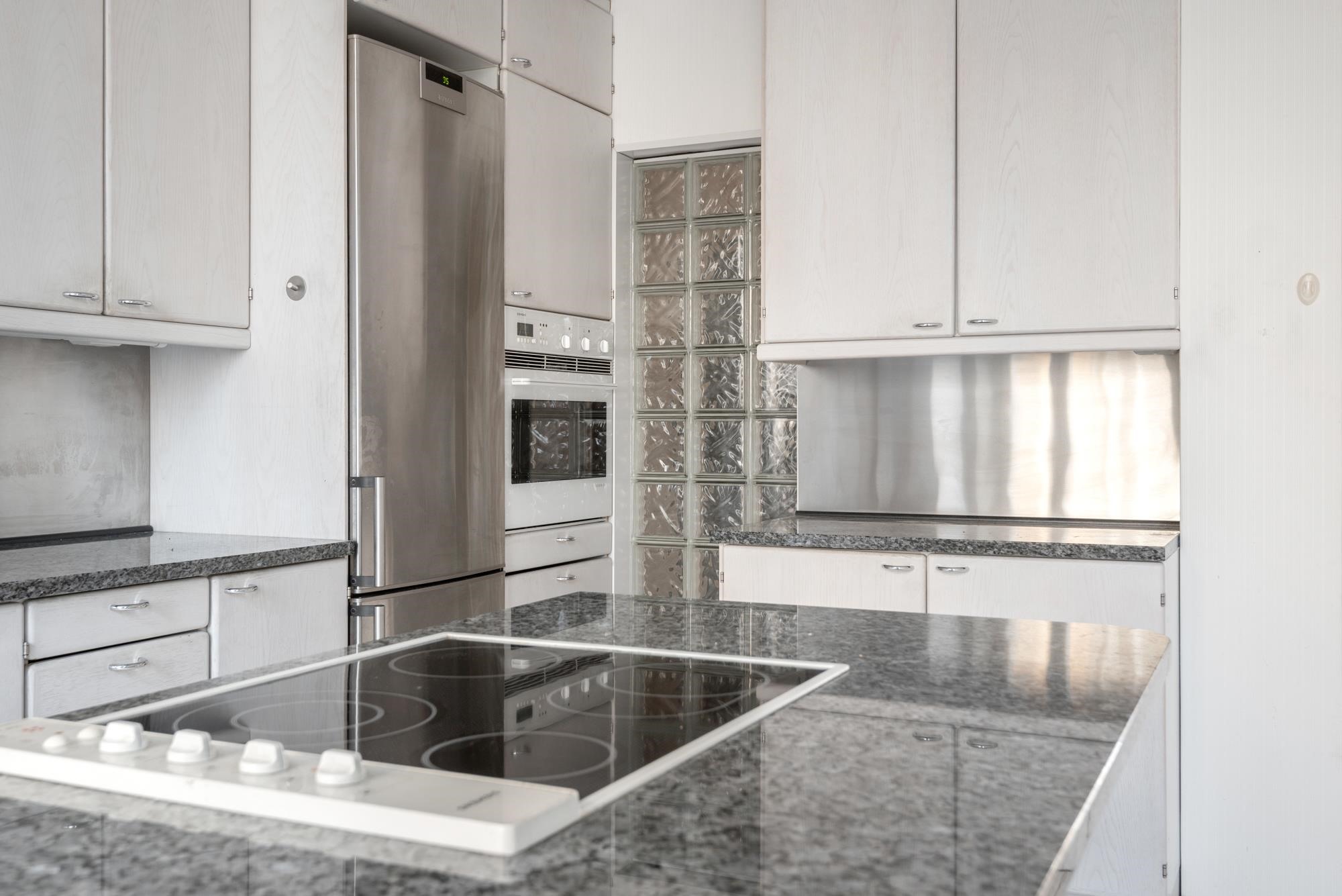 - Jääkaappipakastin, erillisuuni, induktioliesi, liesituuletin, astianpesukone, kaapistot, kiinteät valaisimet. Marmorinen tiskipöytätaso sekä marmorisaareke, jossa induktioliesi ja kaapistot.
