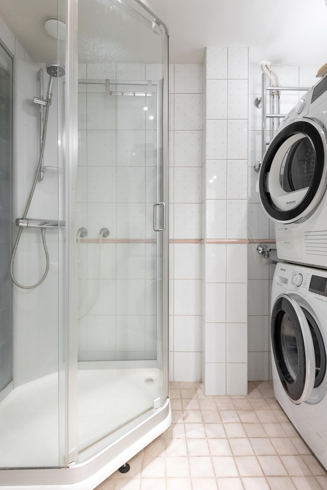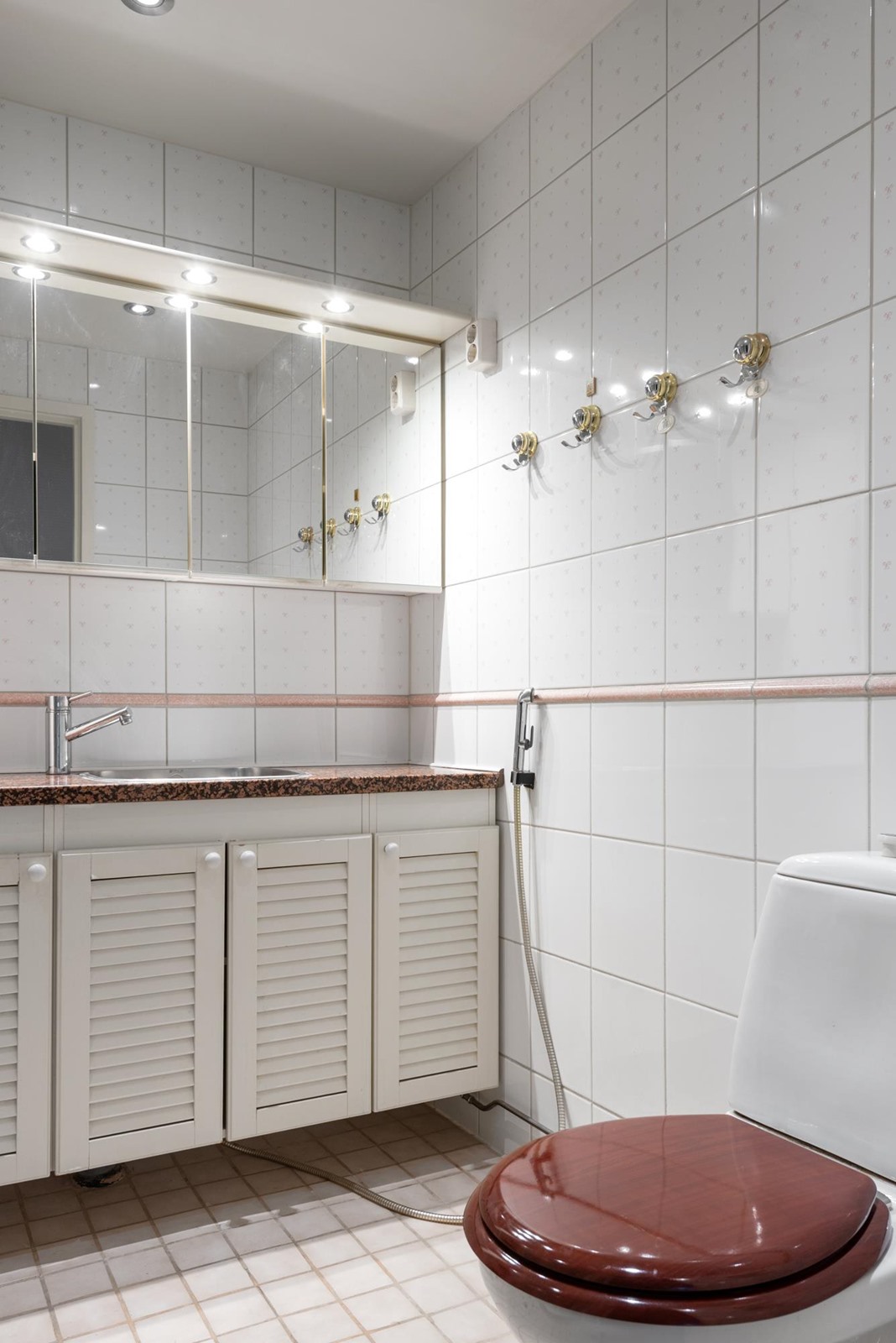 - Kylpyhuone, suihkukaappi, peilikaappi, allaskaappi, pesukoneliitäntä. Pesukone ja kuivausrumpu sisältyvät kylpyhuoneen varusteluun.