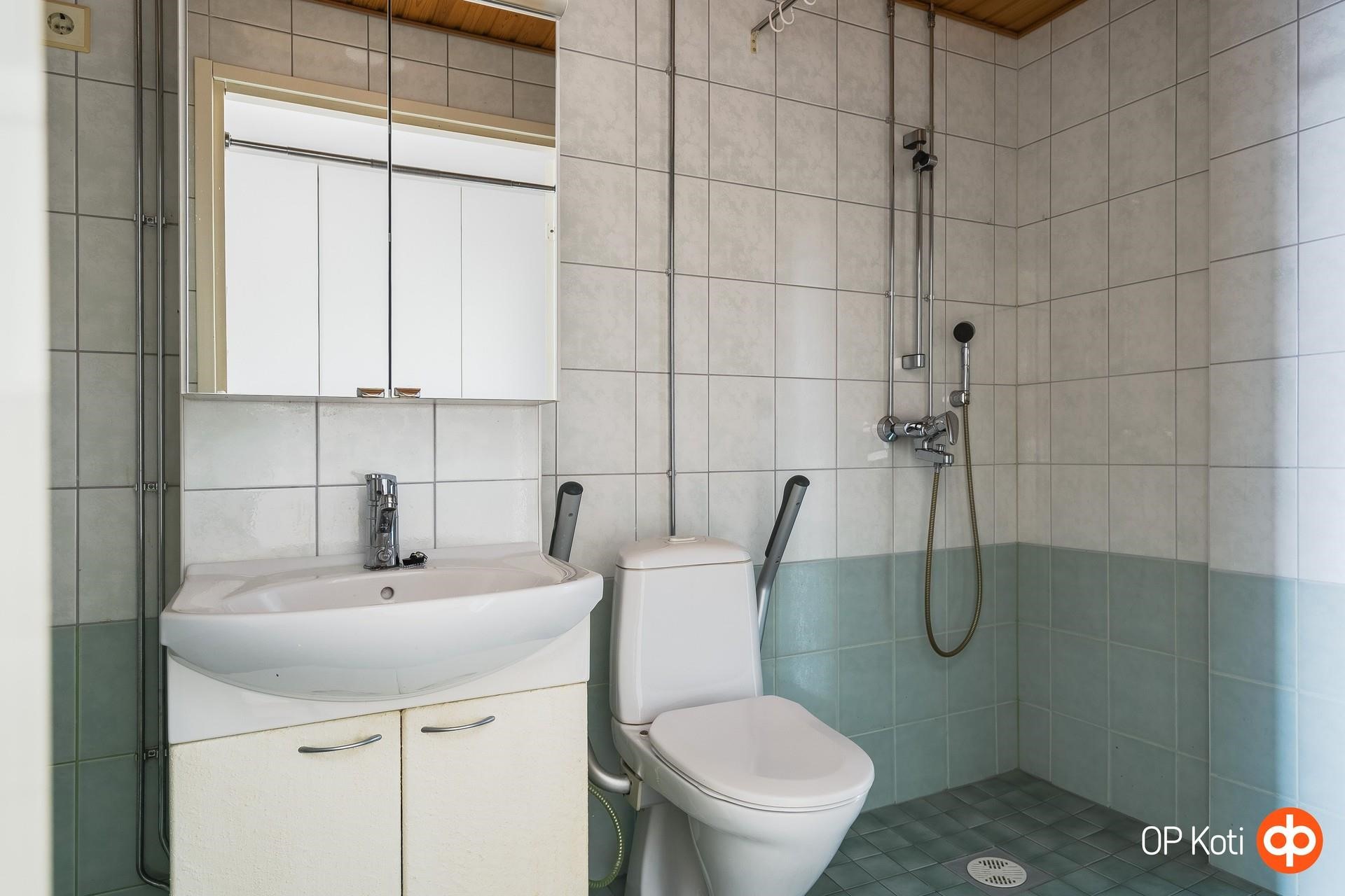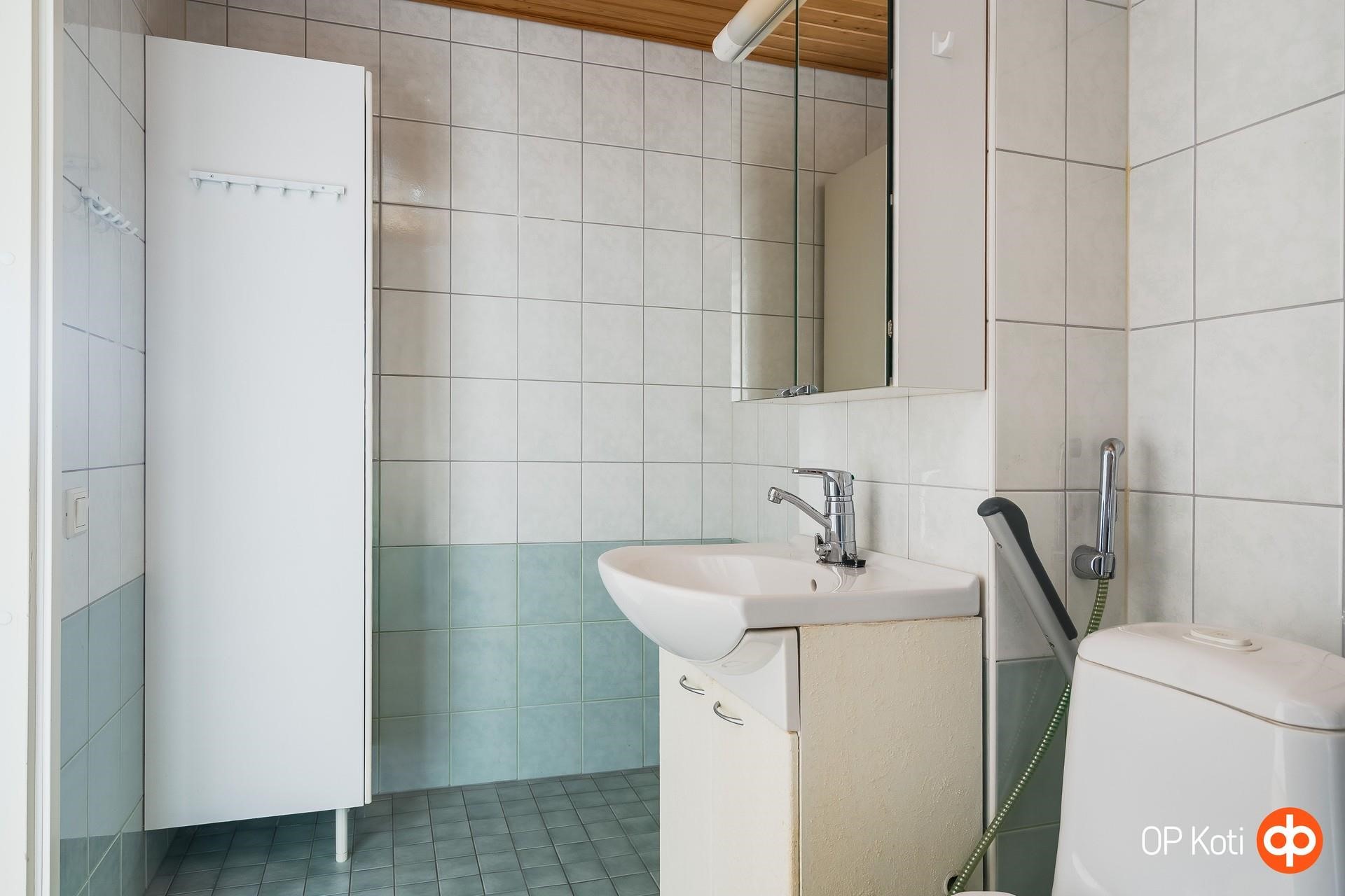 - Kylpyhuone on tilava ja toimiva kokonaisuus, jossa on suihku, peilikaappi sekä kaapistoja säilytystä varten. Allaskaappi tuo lisää laskutilaa, ja pesukoneliitäntä tekee arjesta vaivatonta. Tilassa on sähköinen lattialämmitys, joka lisää mukavuutta, sekä kiinteät valaisimet, jotka tuovat selkeän ja miellyttävän yleisvalon.