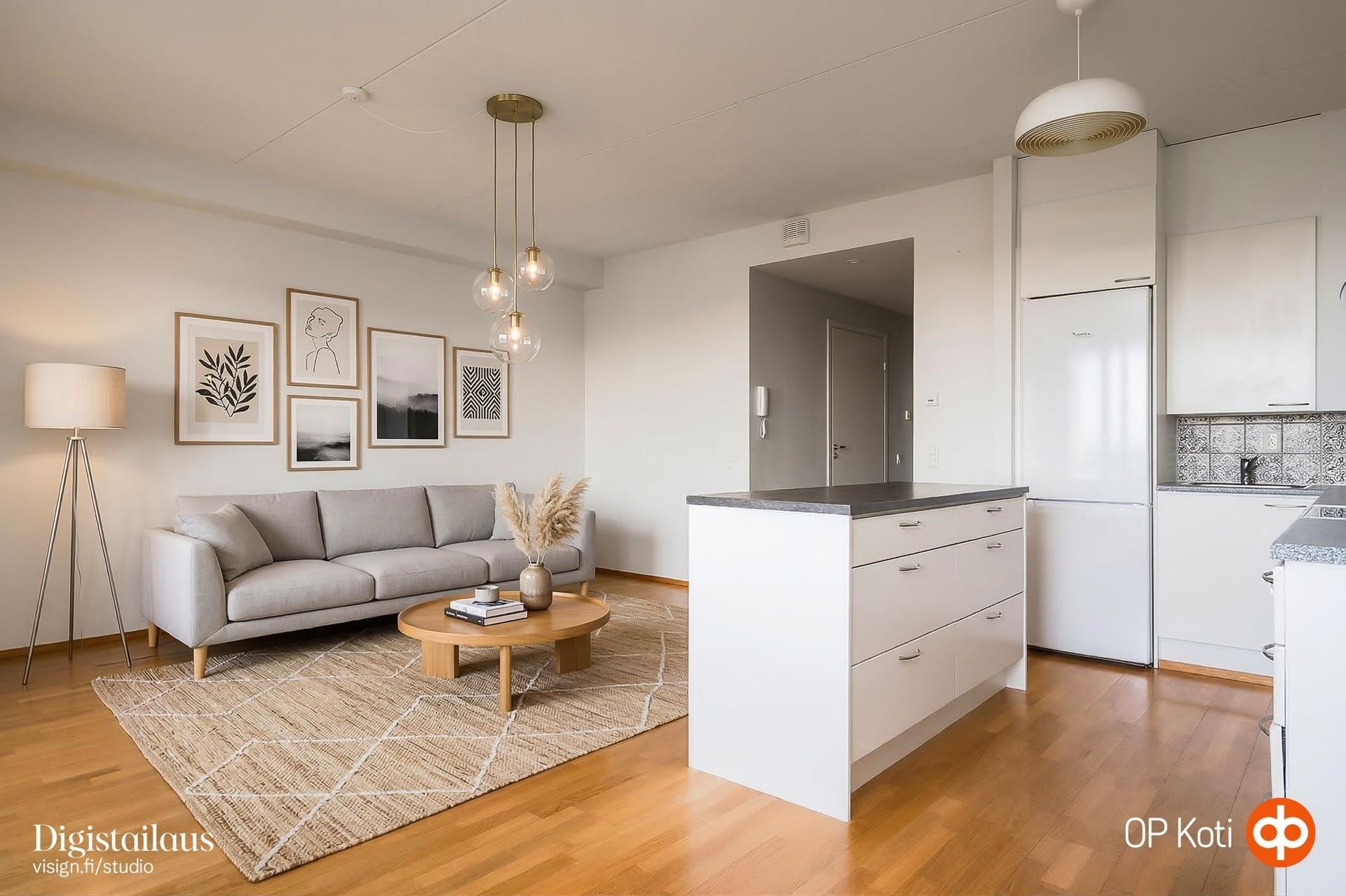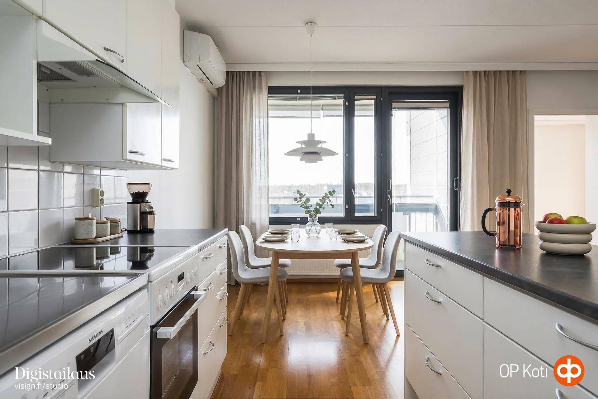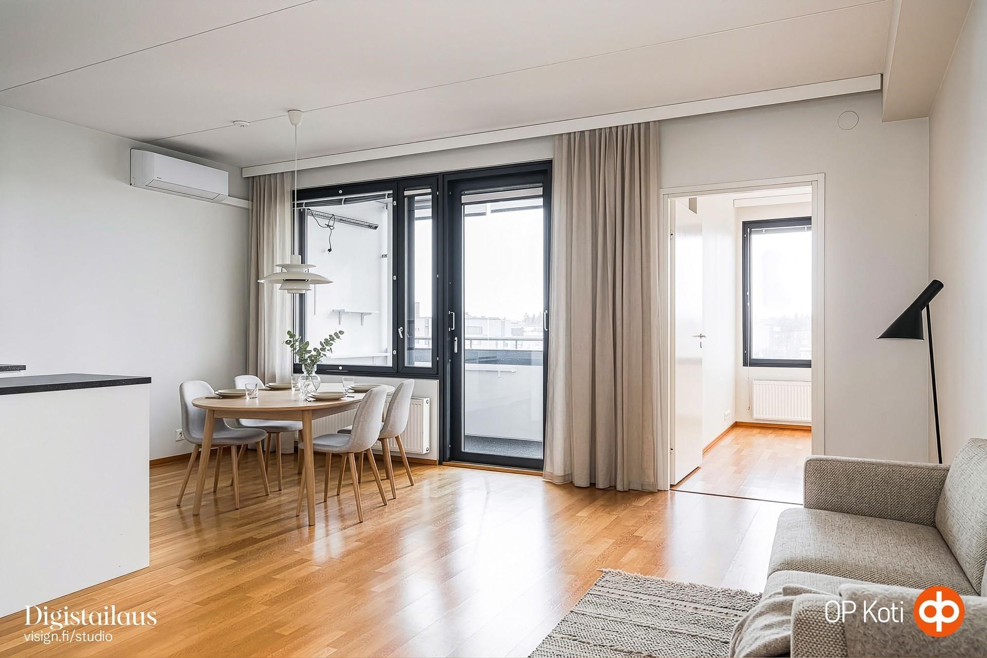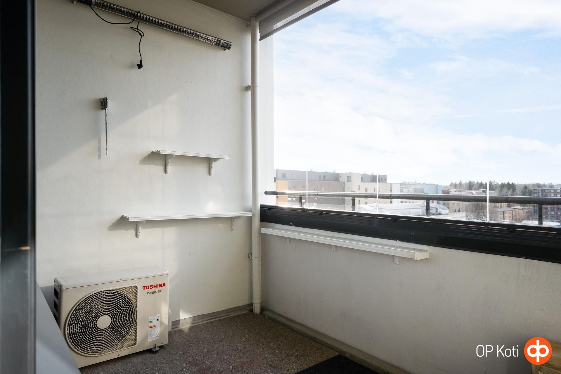 Kodin 7. kerroksen sijainti avaa näkymät länteen: valo kulkee sisään kauniisti ja maisemat levittäytyvät silmien eteen. Lasitettu parveke kutsuu nauttimaan hetkistä ympäri vuoden, ja parvekkeen infrapunalämmitin tuo lisämukavuutta viileisiin päiviin. Sisätiloissa asumismukavuutta lisää ilmalämpöpumppu, joka pitää kodin viileänä kesähelteillä.