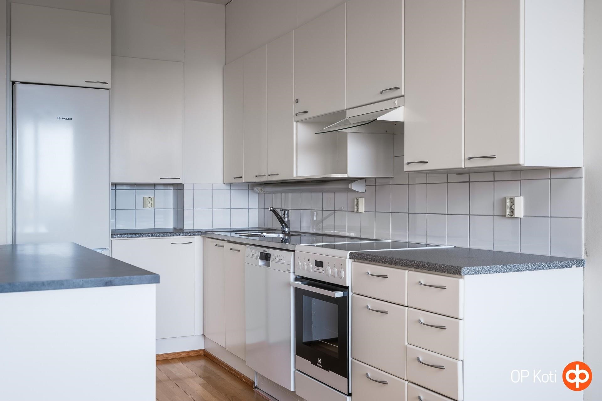 - Keittiö on vaalea, selkeälinjainen ja käytännölliseksi suunniteltu kokonaisuus. Varusteluun kuuluu jääkaappipakastin, induktioliesi kiertoilmauunilla, liesituuletin, astianpesukone ja hyvin säilytystilaa tarjoavat kaapistot. Kiinteät valaisimet viimeistelevät tilan ja tuovat miellyttävän työskentelyvalon. Keittiössä on lisäksi siirrettävä saareke, joka mukautuu arjen tarpeisiin ja toimii erinomaisesti ylimääräisenä lasku- tai tarjoilutilana