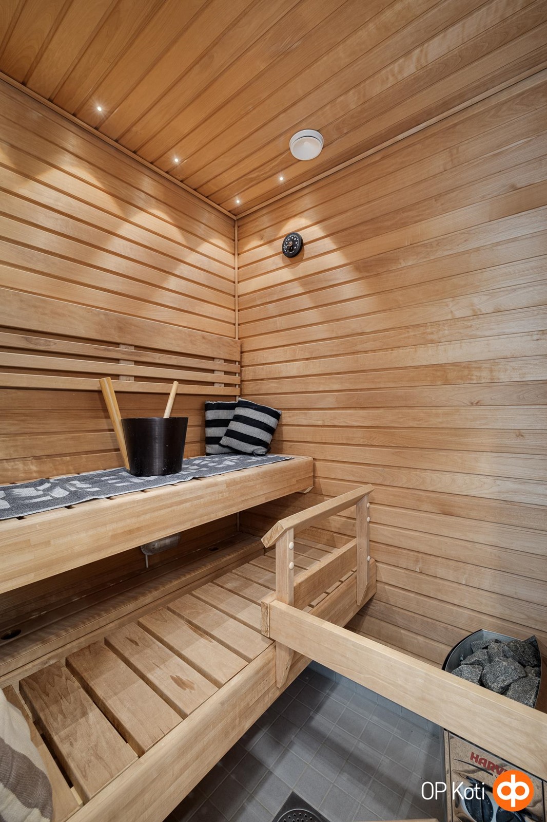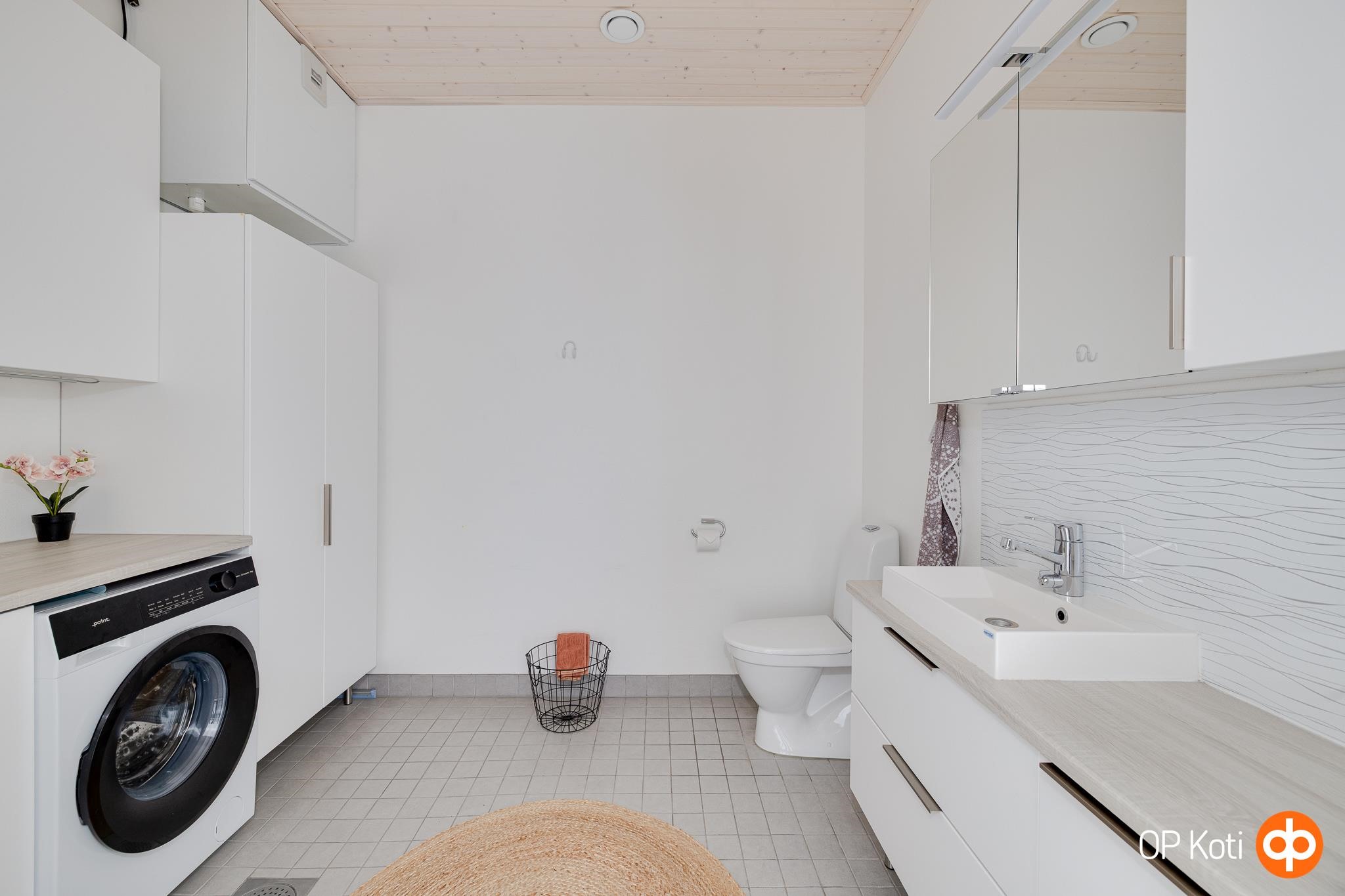 - Sauna, sähkökiuas, kylpyhuone, erillinen wc, suihku, suihkuseinä, peilikaappi, kaapit, allaskaappi, pesukoneliitäntä, lattialämmitys Vesikiertoinen, kiinteät valaisimet.