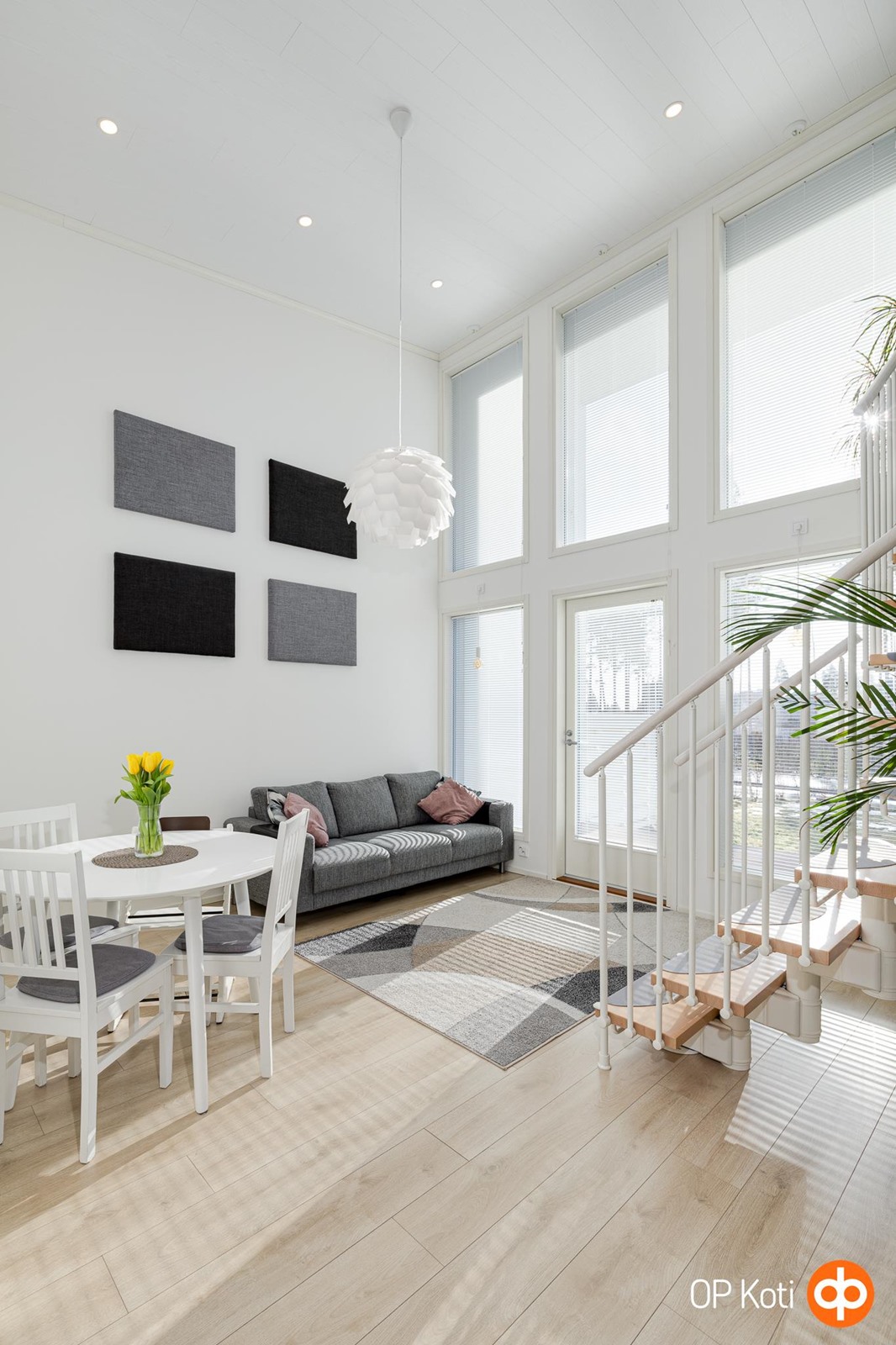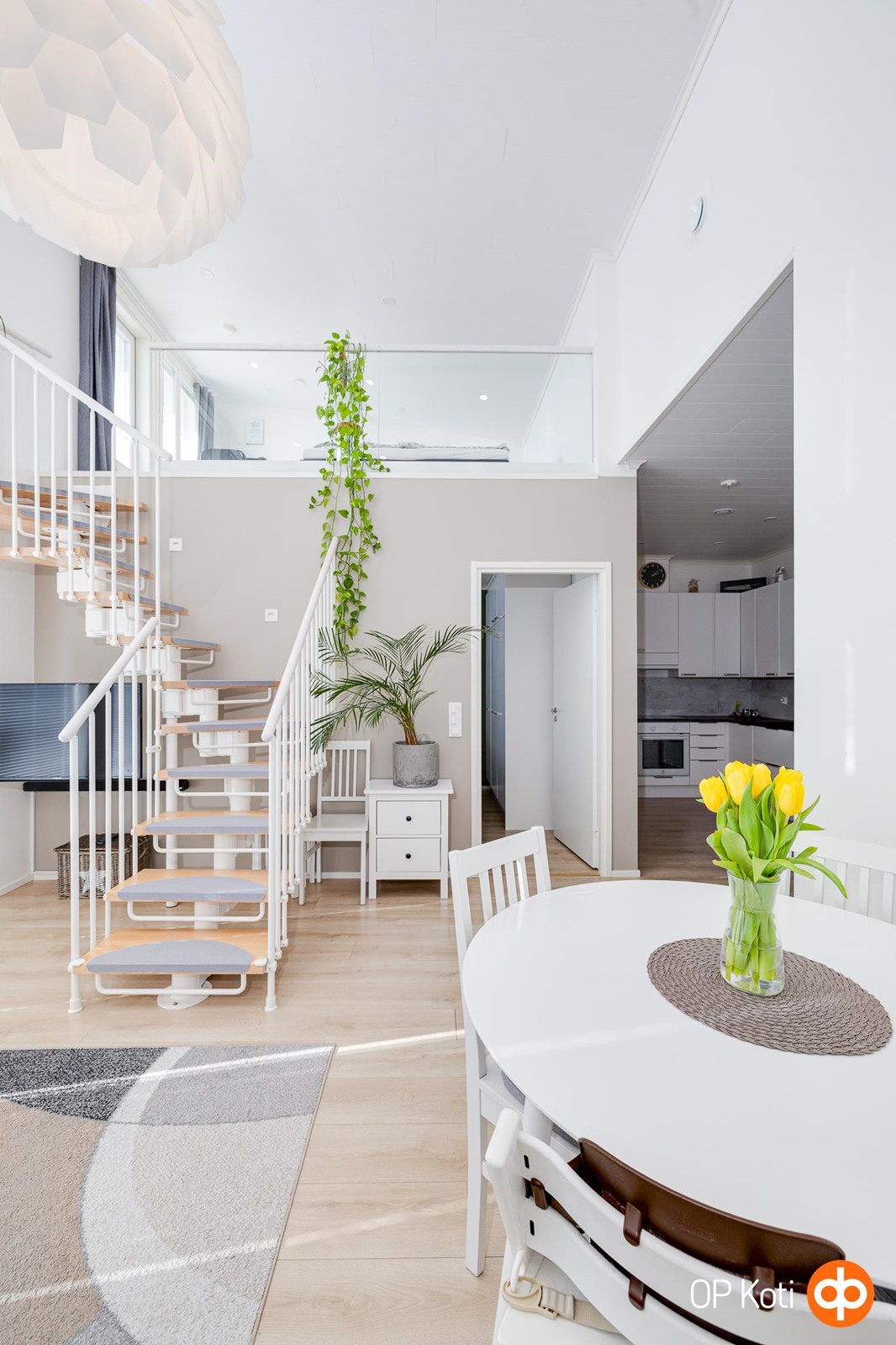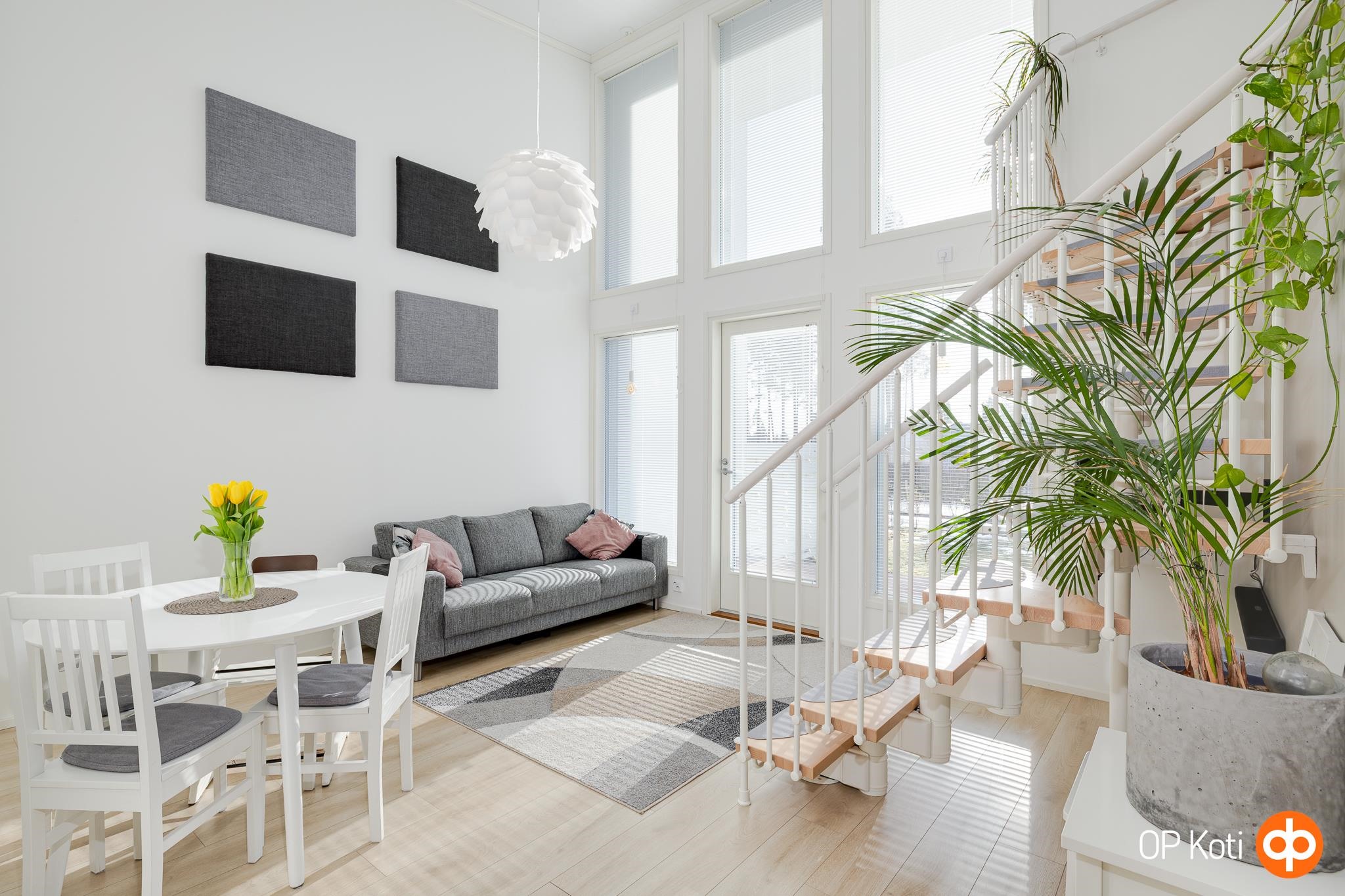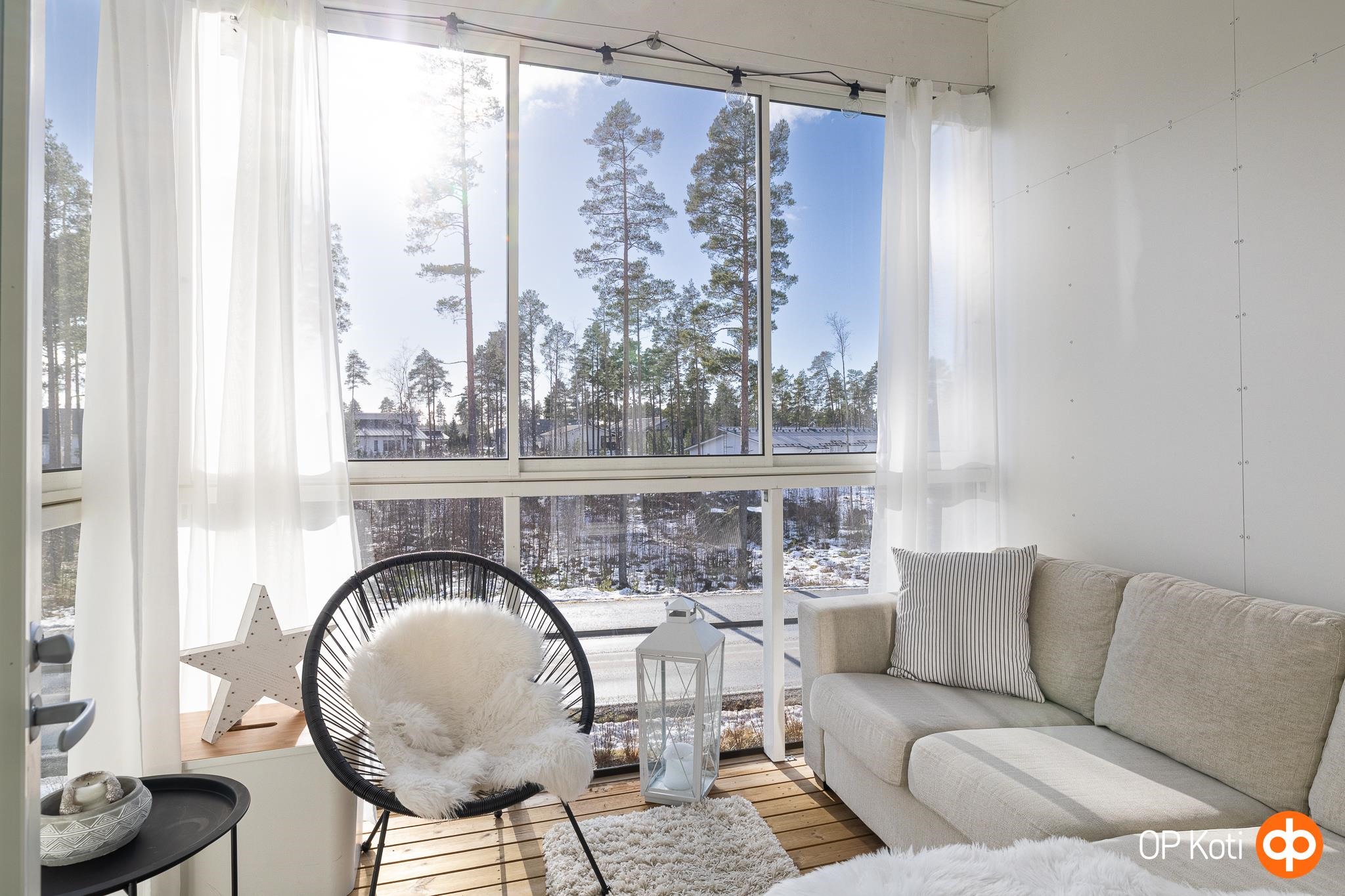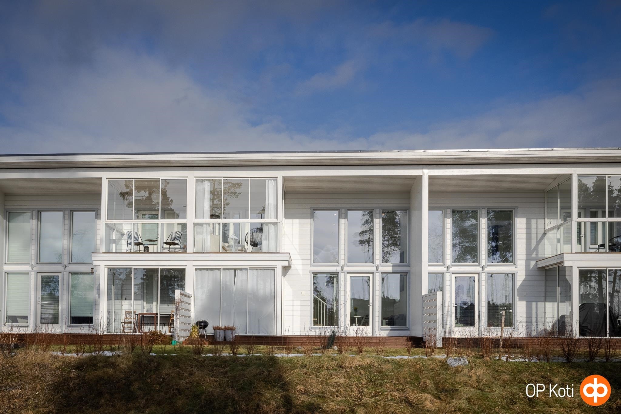 Tämän kodin korkea olohuone luo tilaan näyttävyyttä ja runsaasti luonnonvaloa. Arjen sujuvuutta lisäävät hyvin suunniteltu huonejako, käytännöllinen keittiö sekä säilytystilat. Oma sauna ja tilava kylpyhuone tarjoavat arjen rentoutumishetkiä. Lasitettu parveke kutsuu nauttimaan auringonlaskuista, ja suojaisa piha-alue tuo mahdollisuuden viettää aikaa omassa rauhassa, istutuksista ja vihreydestä nauttien. Aamuaurinko tervehtii etupihalla ja iltapäivisin sekä iltaisin takapihan vehreys kylpee valossa.