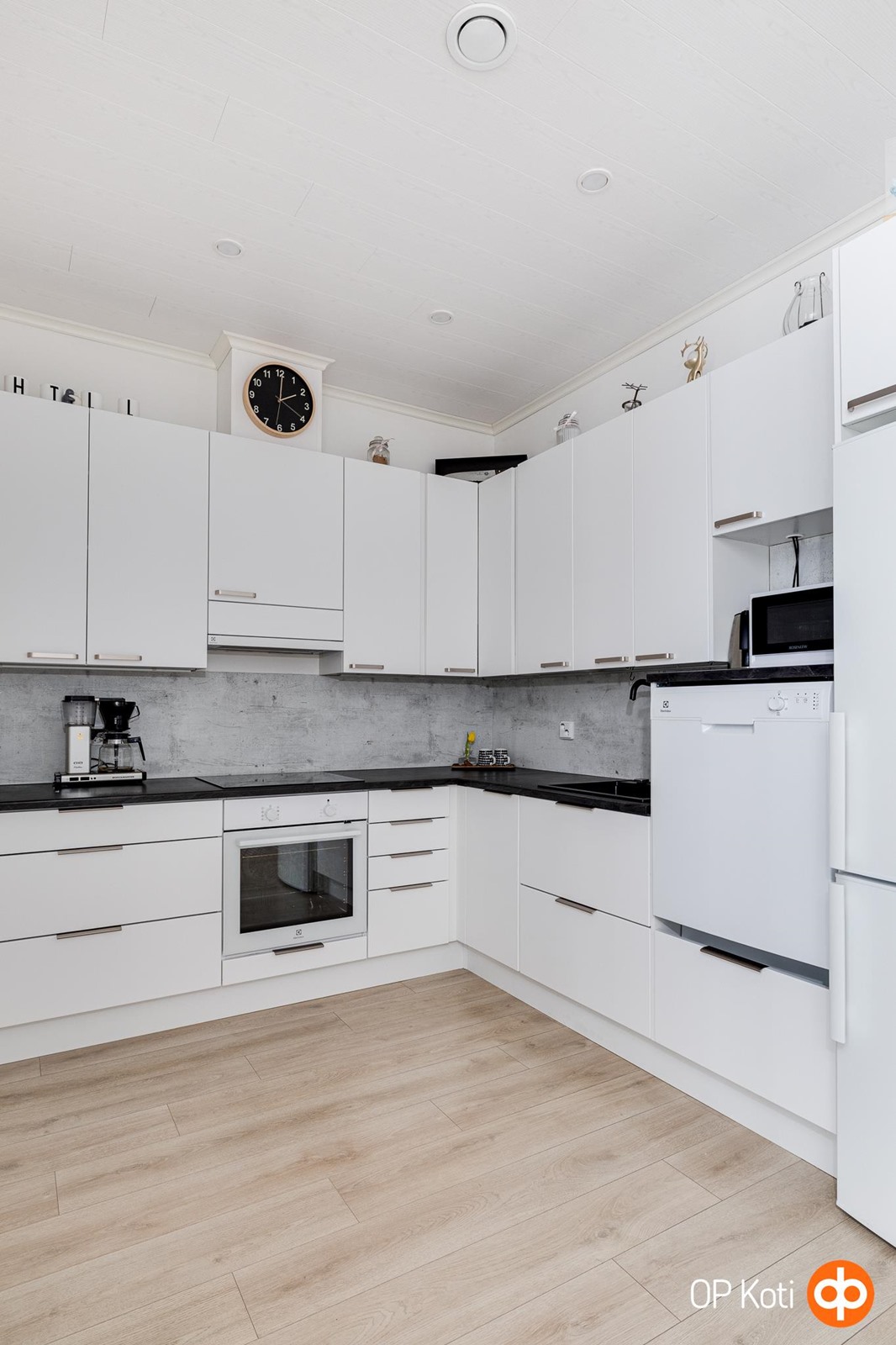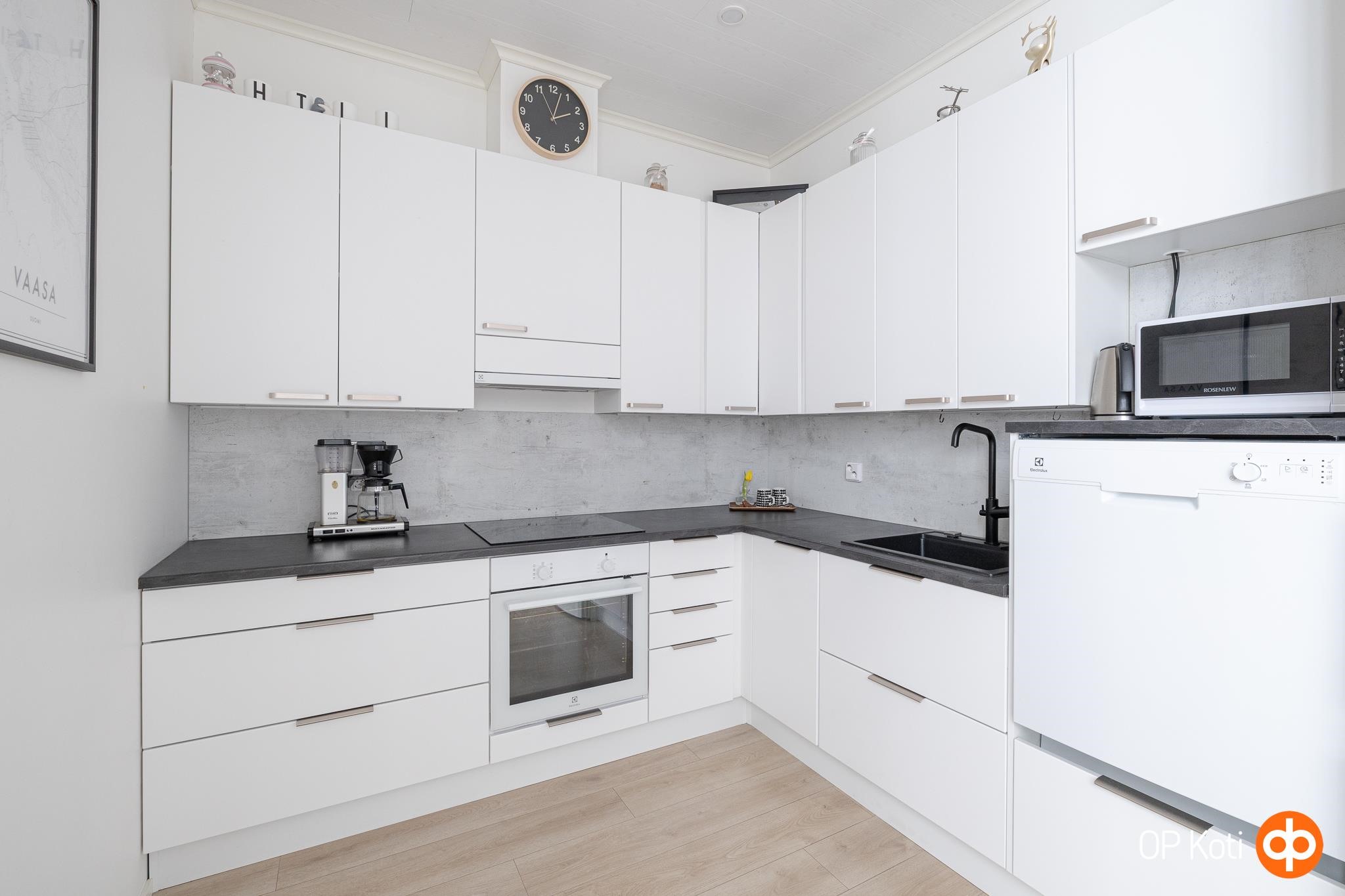 - Jääkaappipakastin Electrolux, erillisuuni Electrolux, induktioliesi Electrolux, liesituuletin, astianpesukone, kaapistot Ideal keittiö, kiinteät valaisimet.