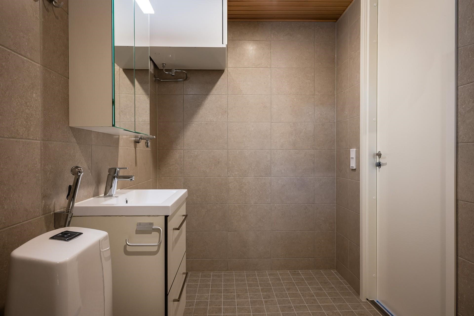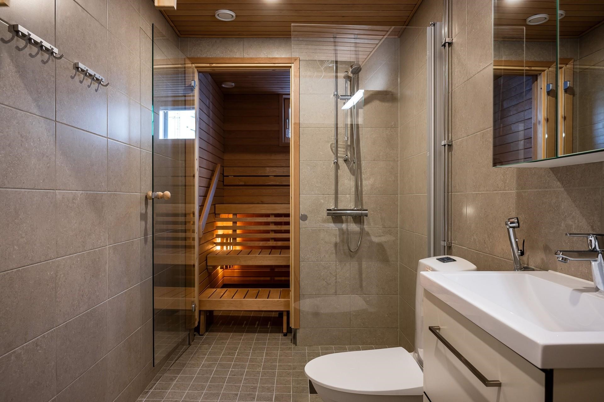 - Sauna, kylpyhuone, erillinen wc, suihku, suihkuseinä, peilikaappi, allaskaappi, pesukoneliitäntä, lattialämmitys.