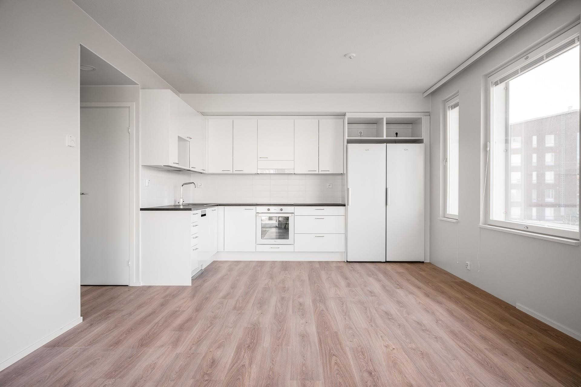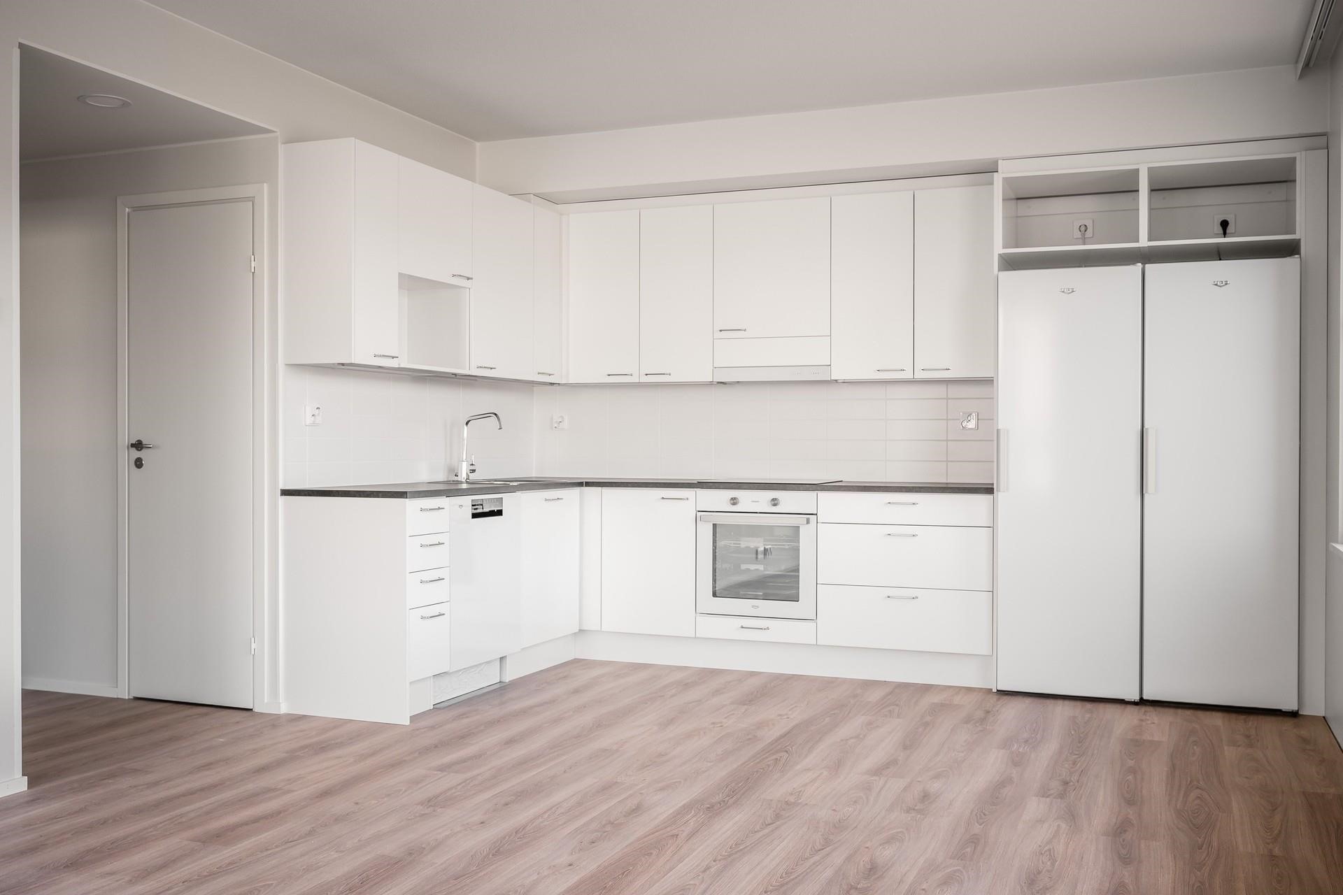 - Jääkaappipakastin, erillisuuni, liesitaso keraaminen, astianpesukone, kaapistot, kiinteät valaisimet.