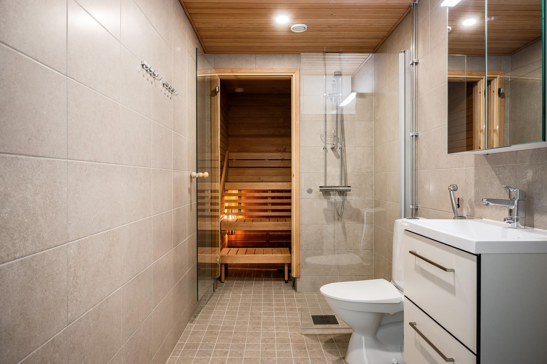 - Sauna, kylpyhuone, suihku, suihkuseinä, peilikaappi, allaskaappi, pesukoneliitäntä, lattialämmitys.