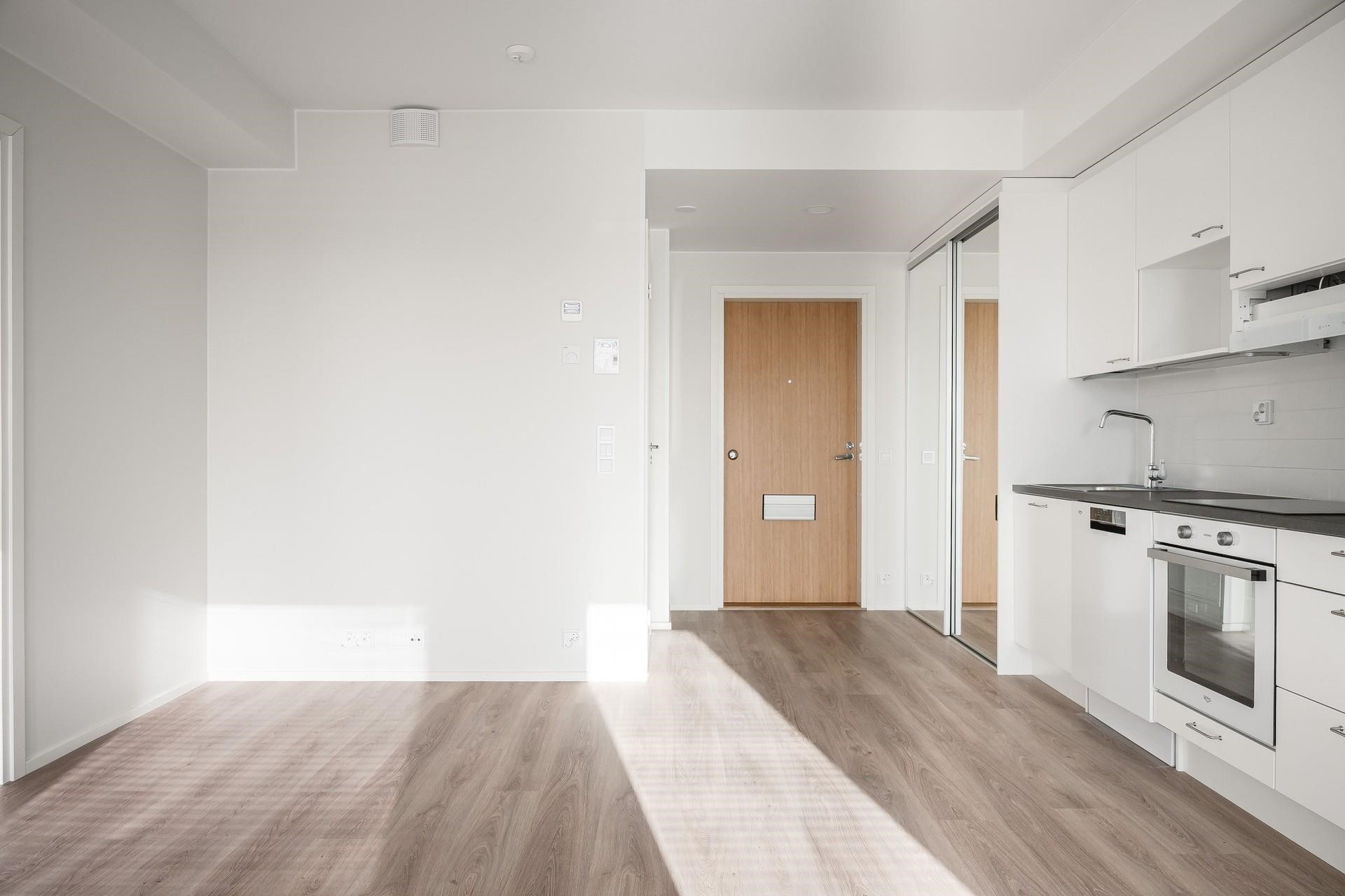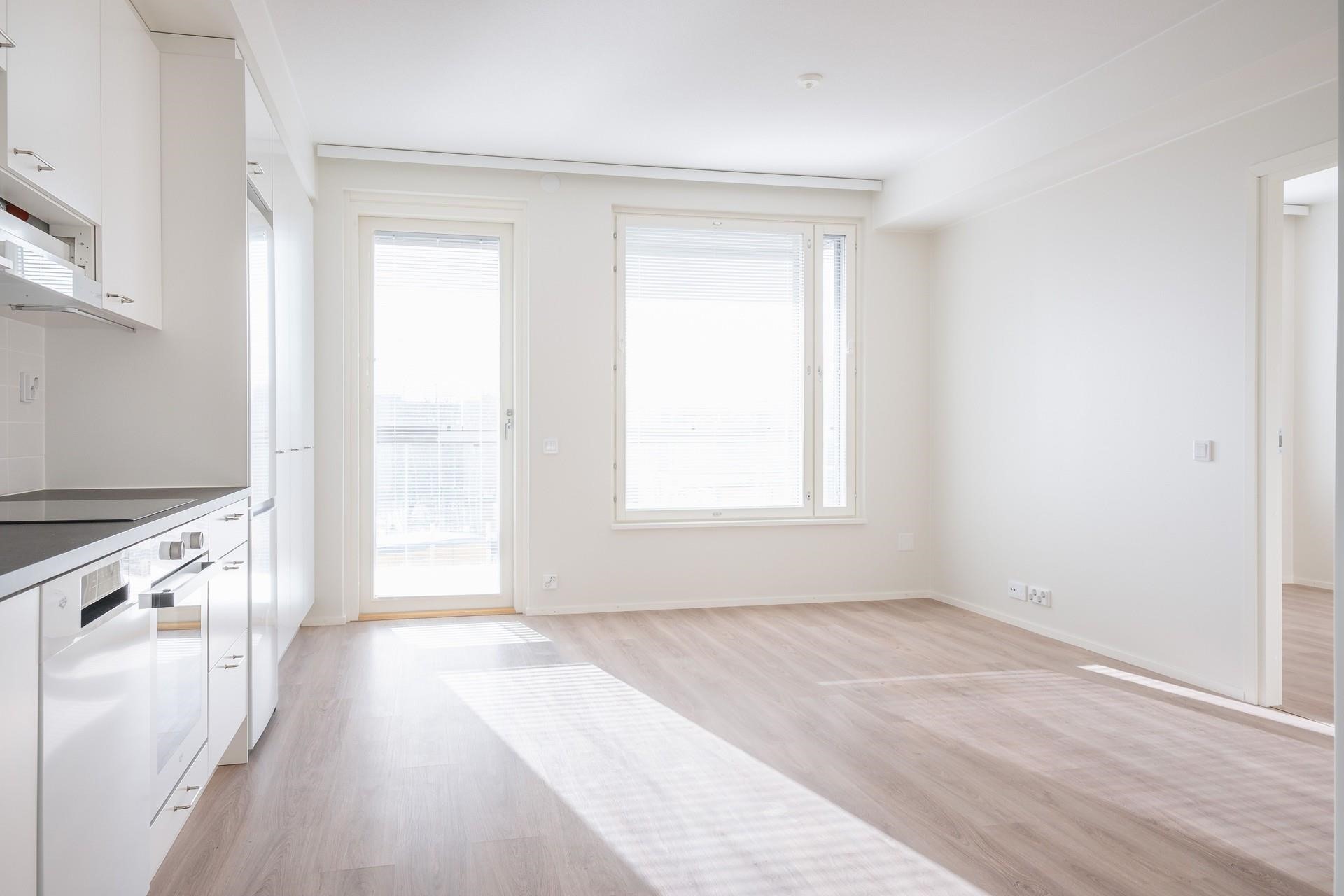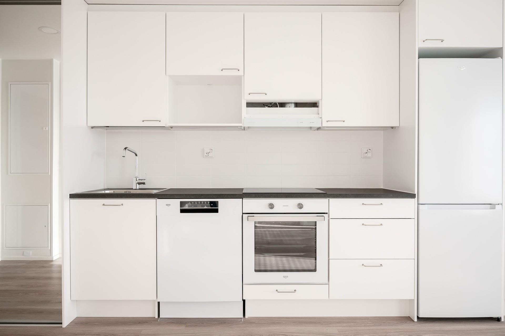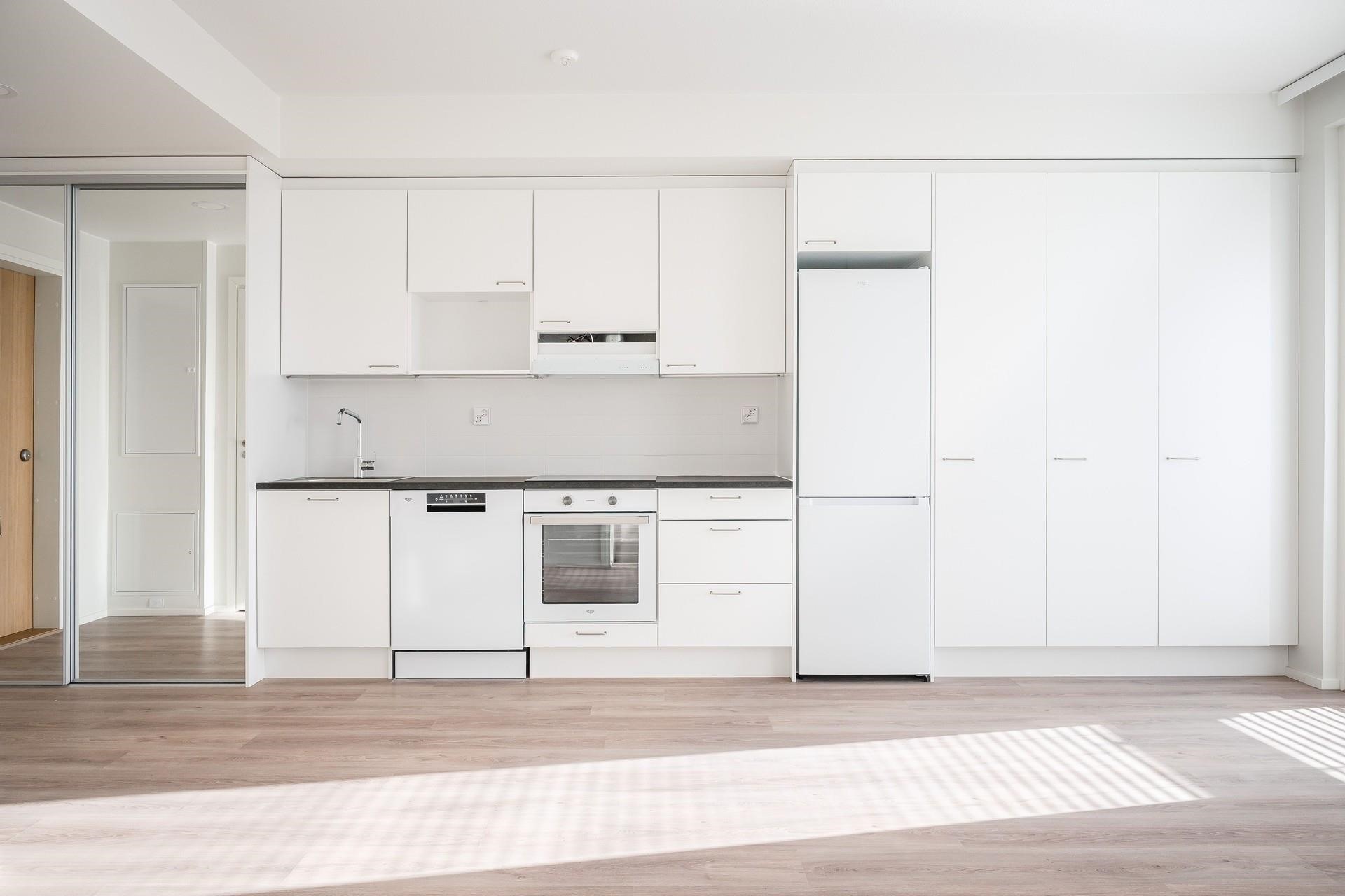 - Jääkaappipakastin, erillisuuni, liesitaso keraaminen, astianpesukone, kaapistot, kiinteät valaisimet.