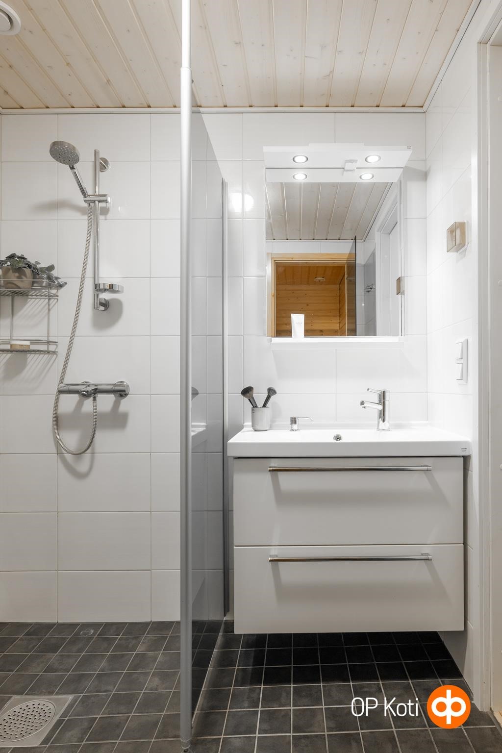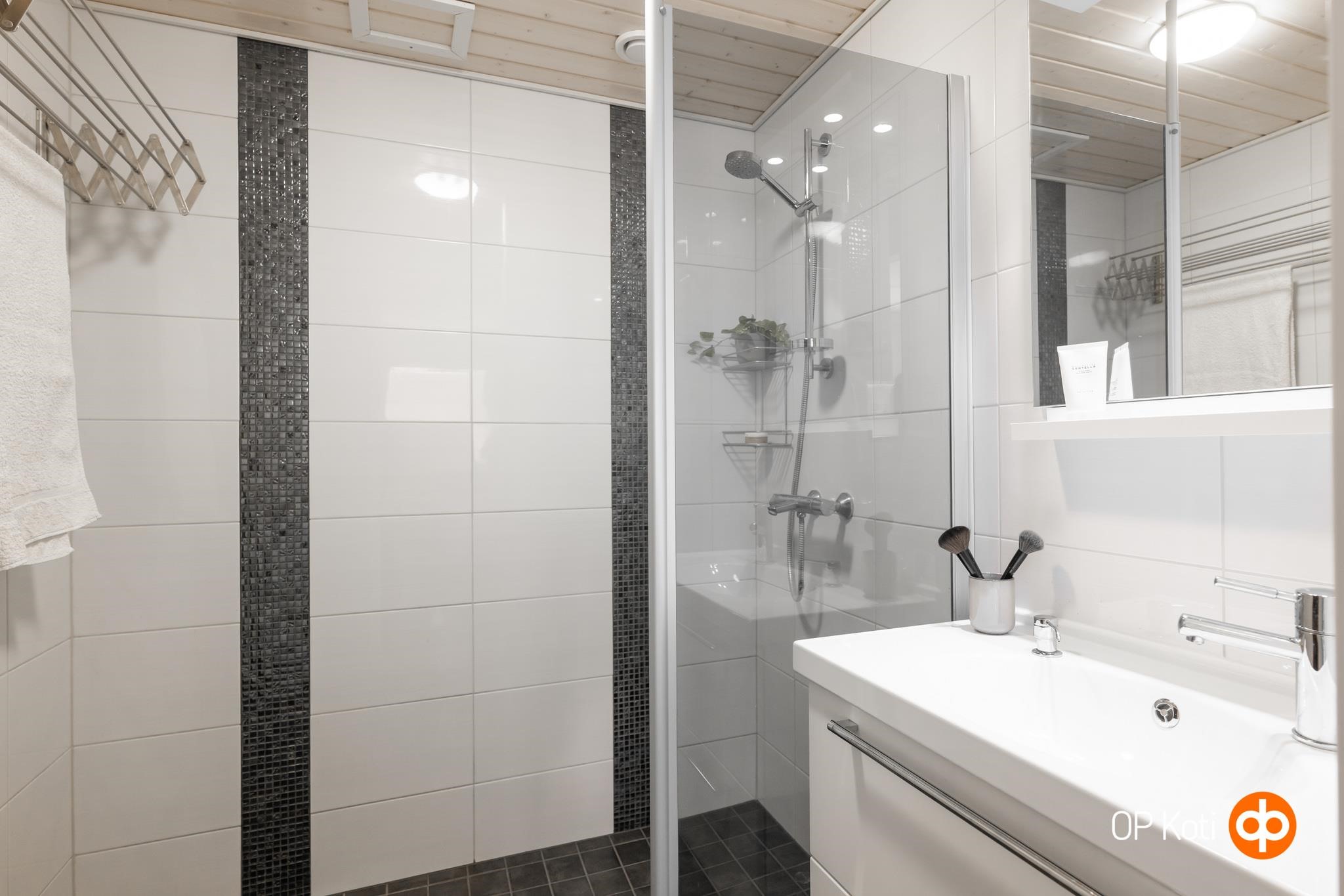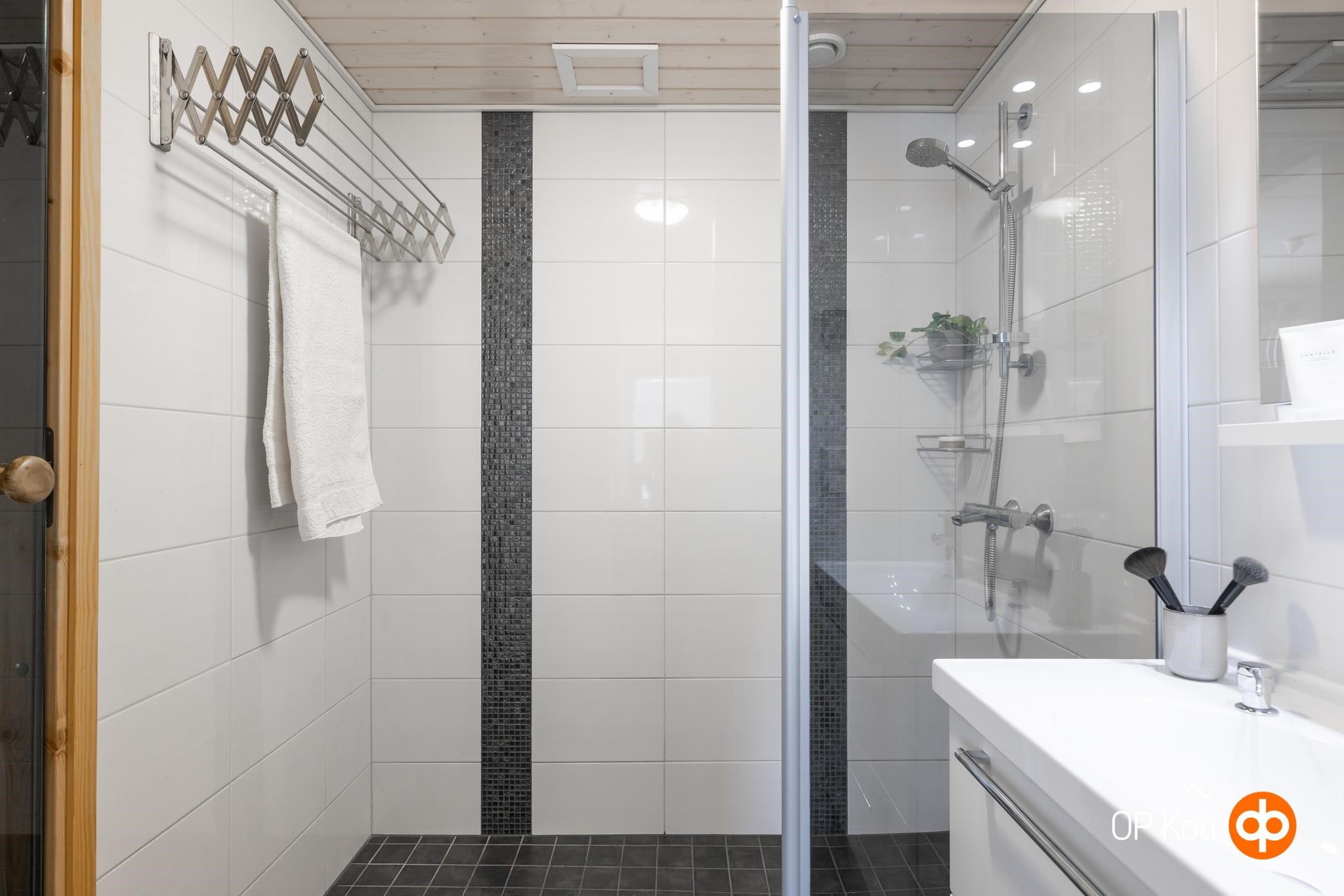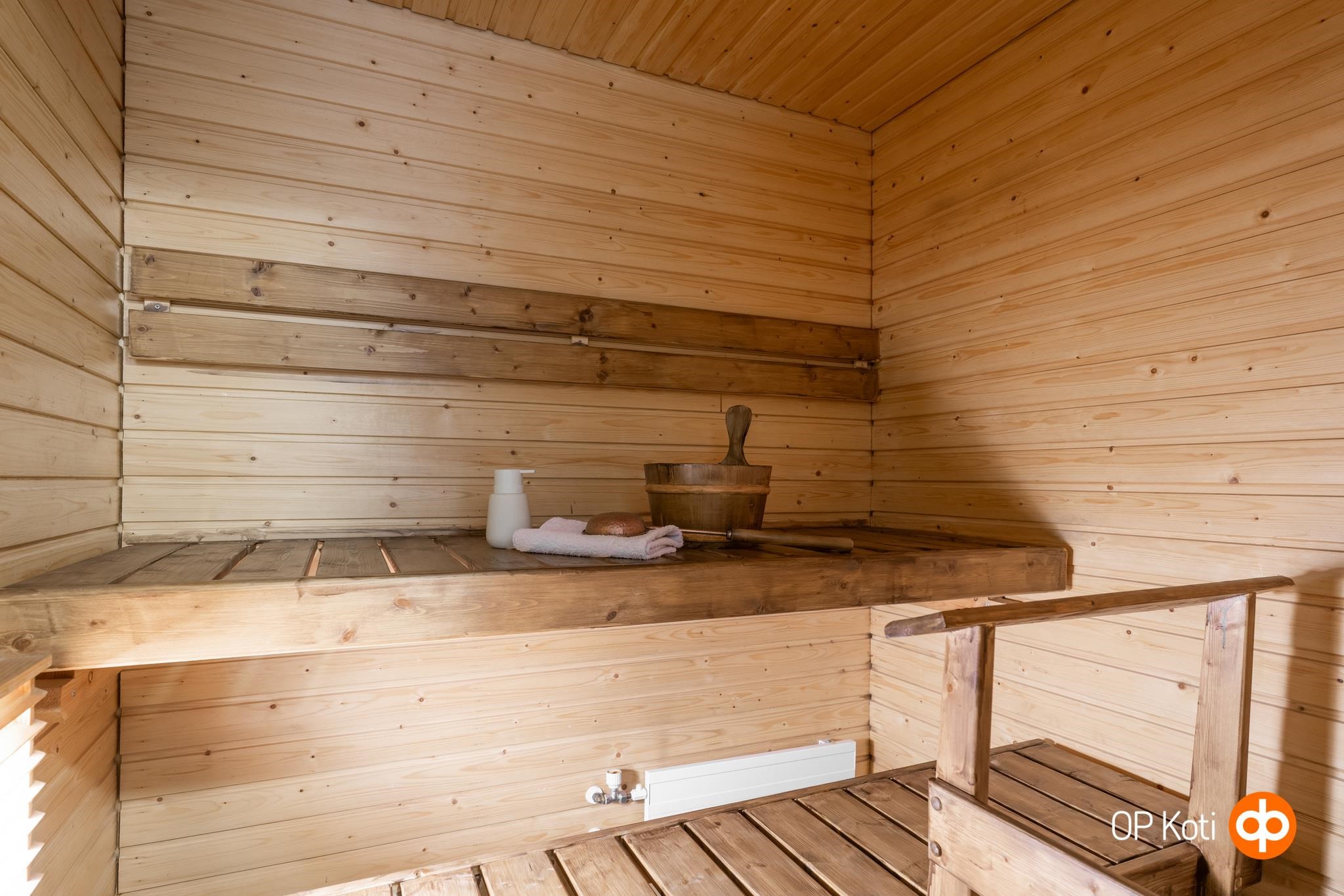 - Sauna, sähkökiuas. Pesuhuoneessa suihku, suihkuseinä, allas, allaskaappi, peili, kiinteät valaisimet ja kuivausteline. Lattialämmitys pesuhuoneessa. Erillinen wc, jossa wc-istuimen lisäksi allas, allaskaappi, peili, pesukoneliitäntä, kuivauskaappi, kaappi ja kiinteät valaisimet.