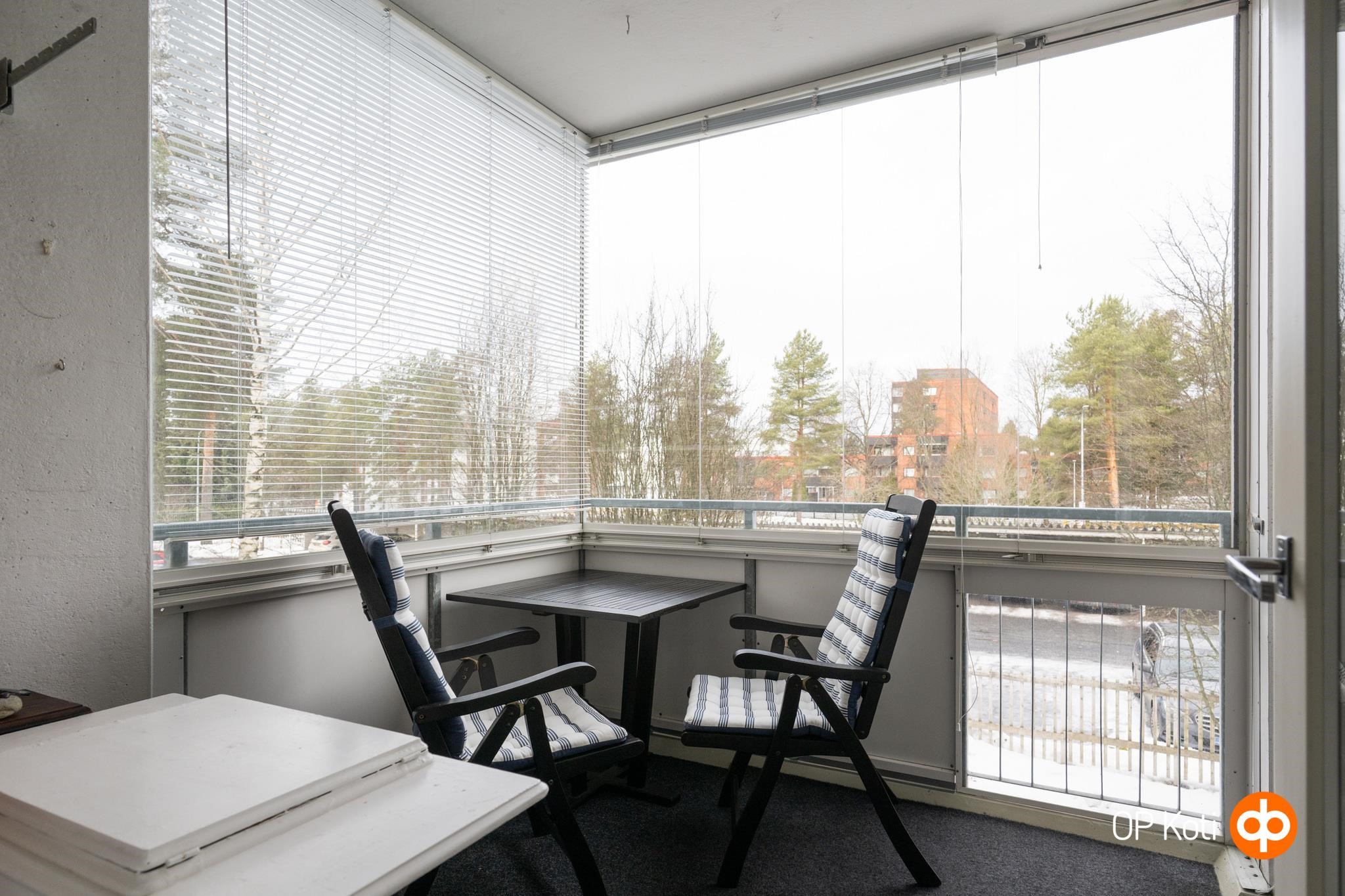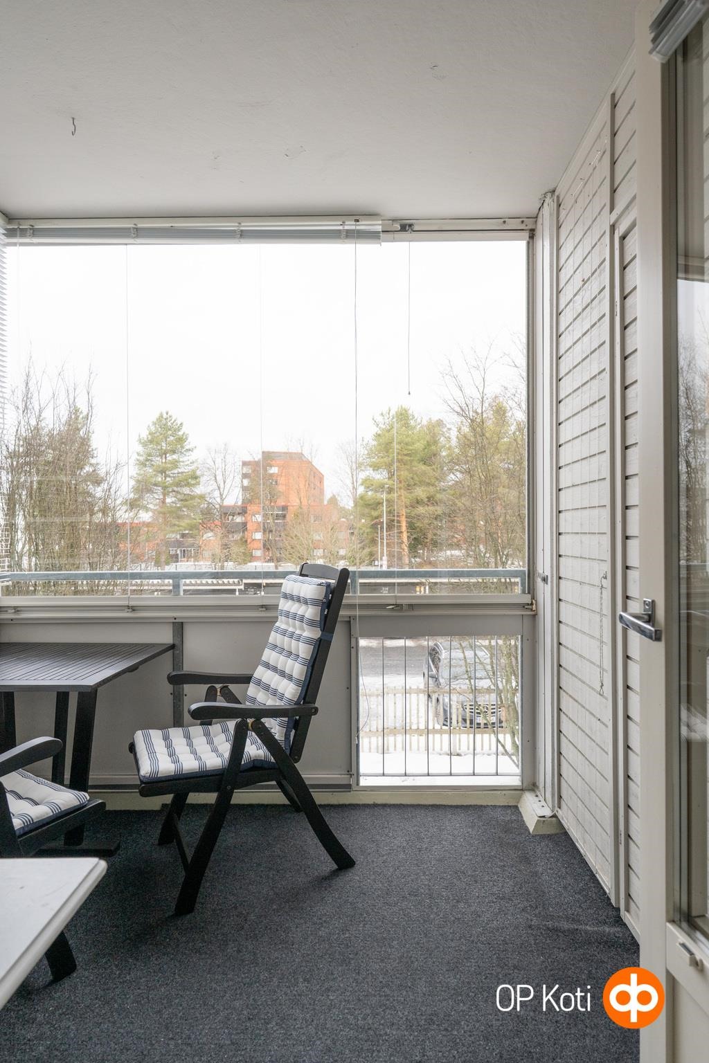 Huoneista ja parvekkeelta avautuu näkymä Nisulankadun suuntaan. Edustalla kasvavat puut pehmentävät maisemaa ja tuovat vuodenaikojen vaihtelun lähelle. Kevään vihreys hiipii silmien eteen päivä päivältä.
