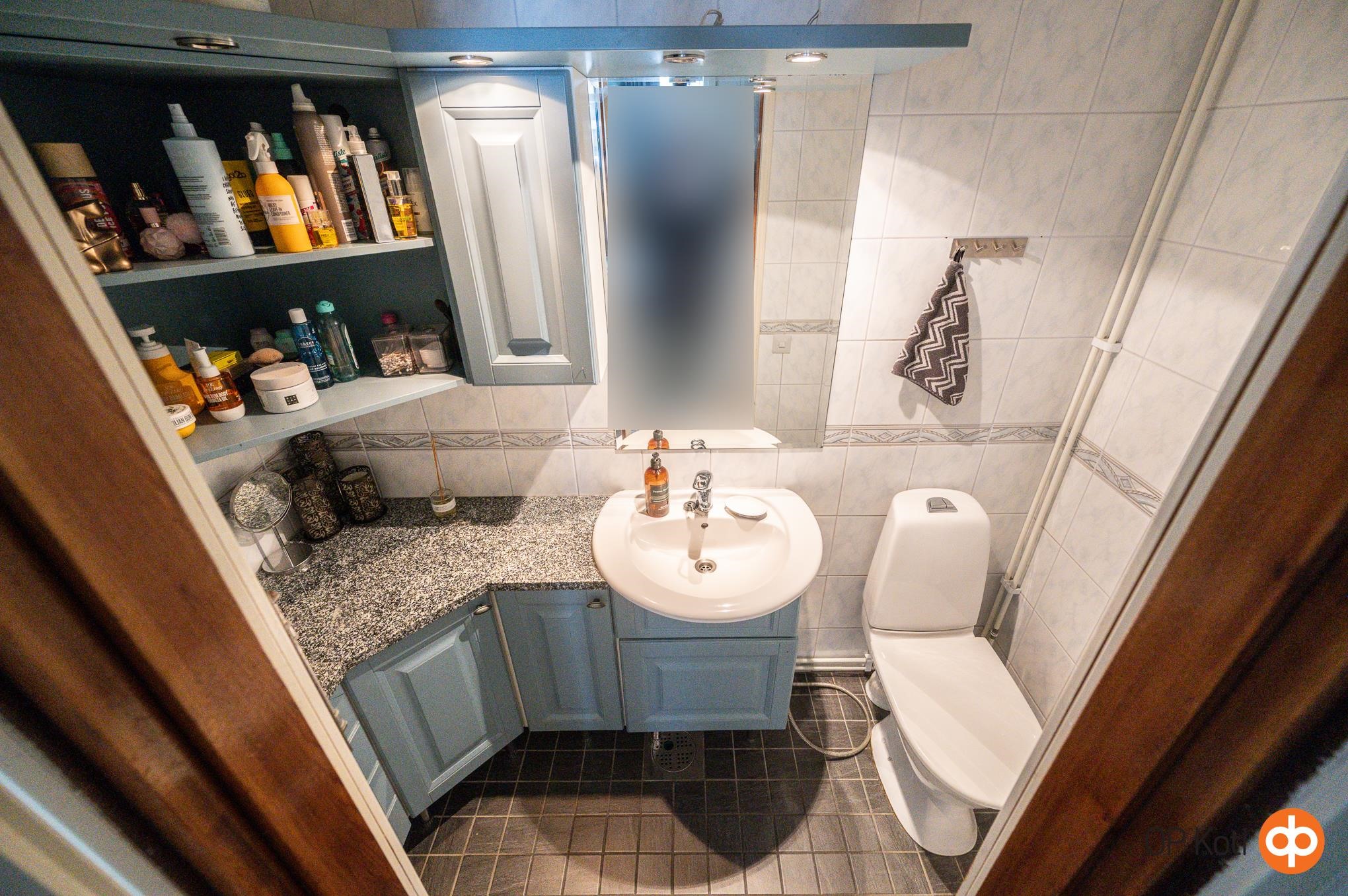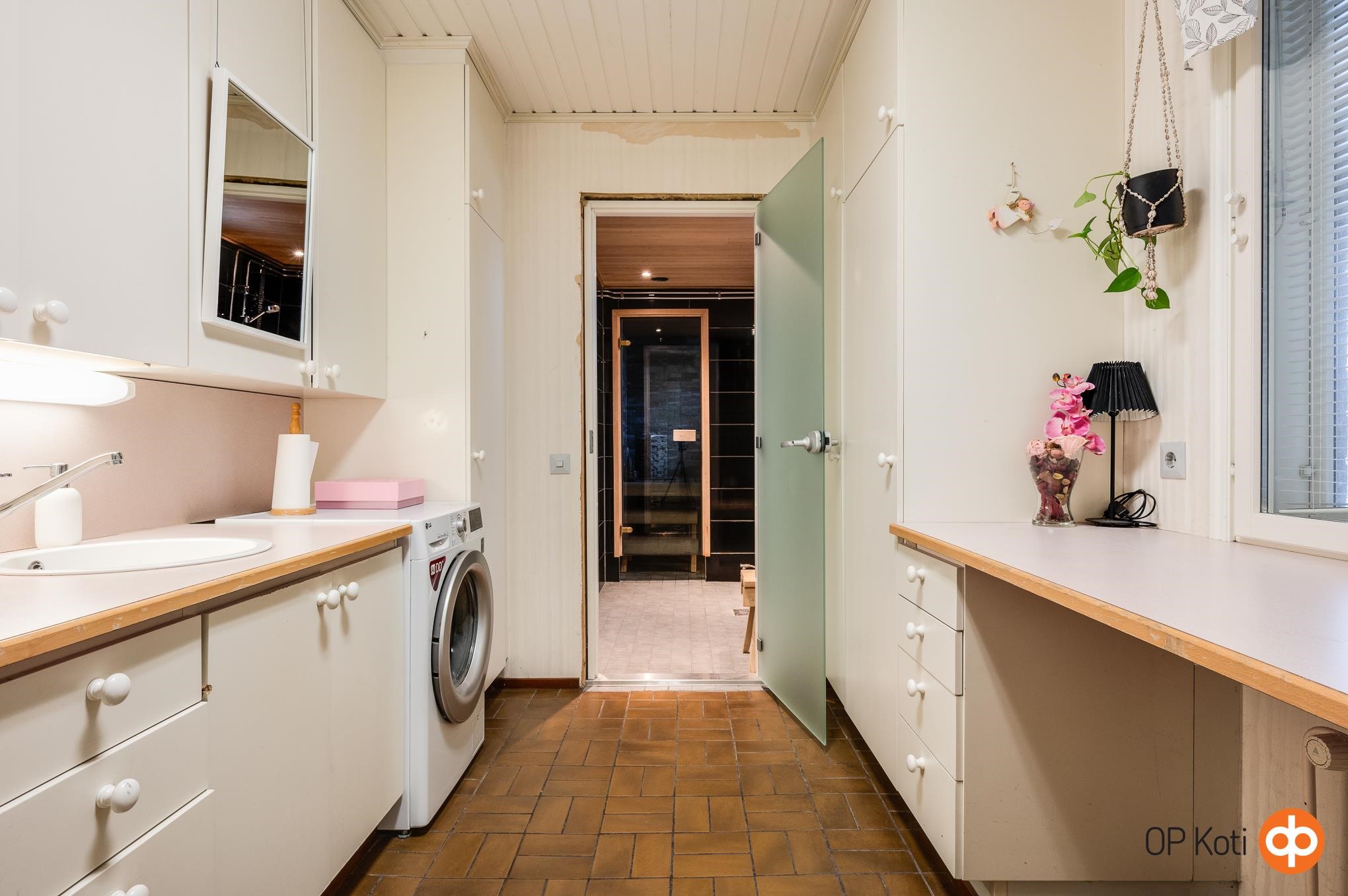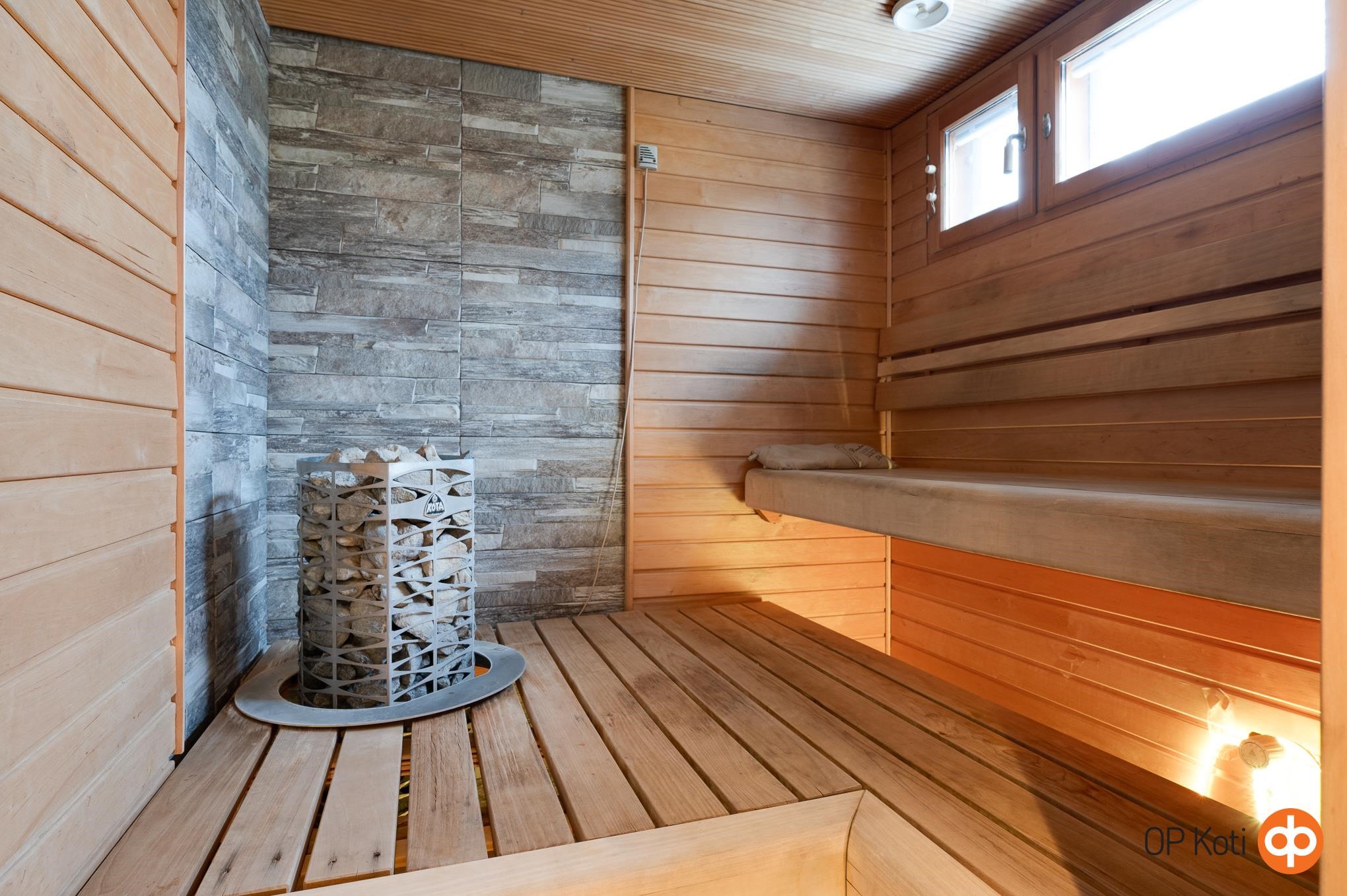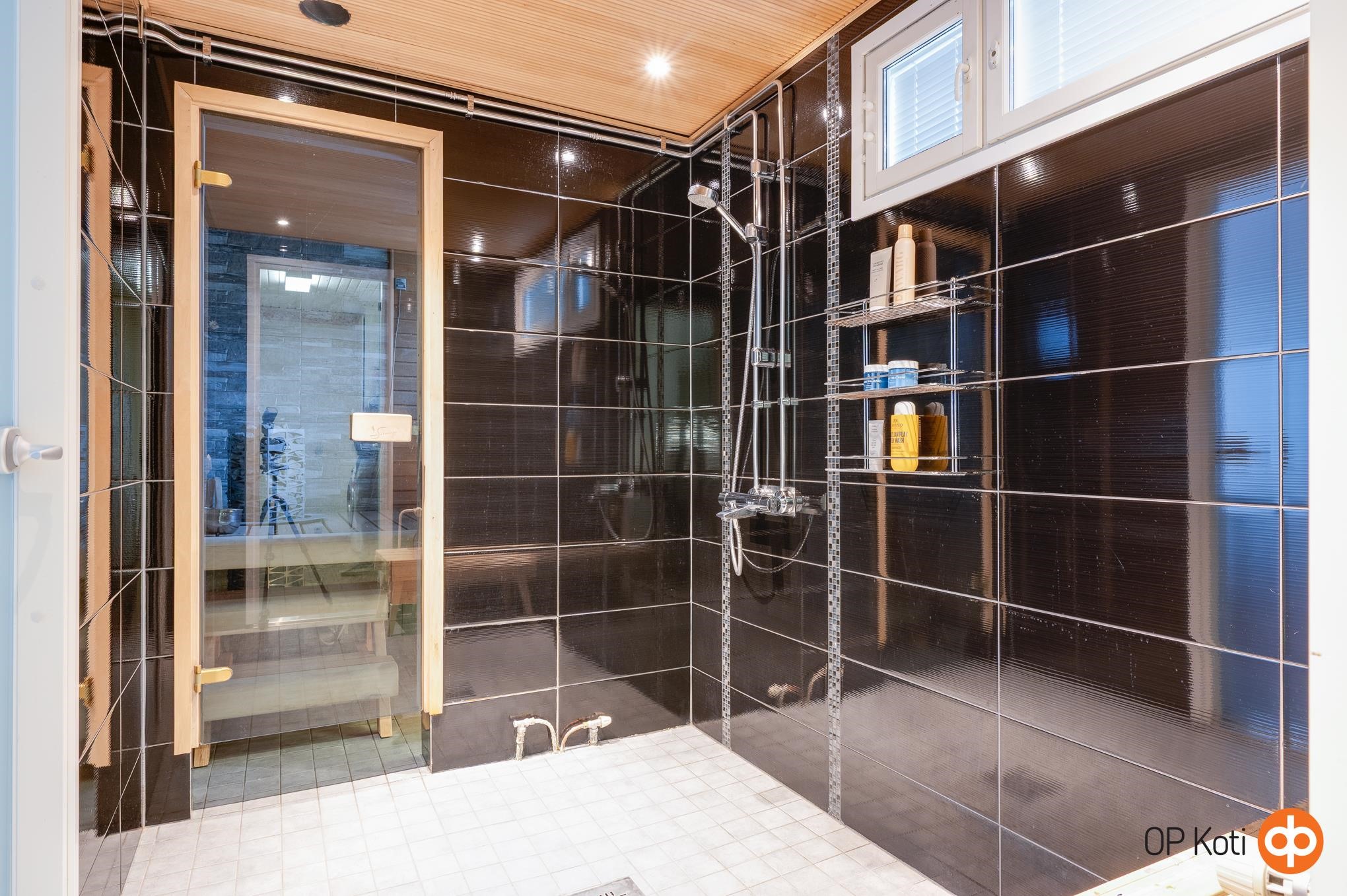- Sauna, sähkökiuas, kylpyhuone, erillinen wc, suihku, peilit, kaapit, allaskaappi, pesukoneliitäntä, lattialämmitys WC:ssä sähköinen lattialämmitys, suihkussa ja kodinhoitohuoneessa vesikiertoinen, kiinteät valaisimet.