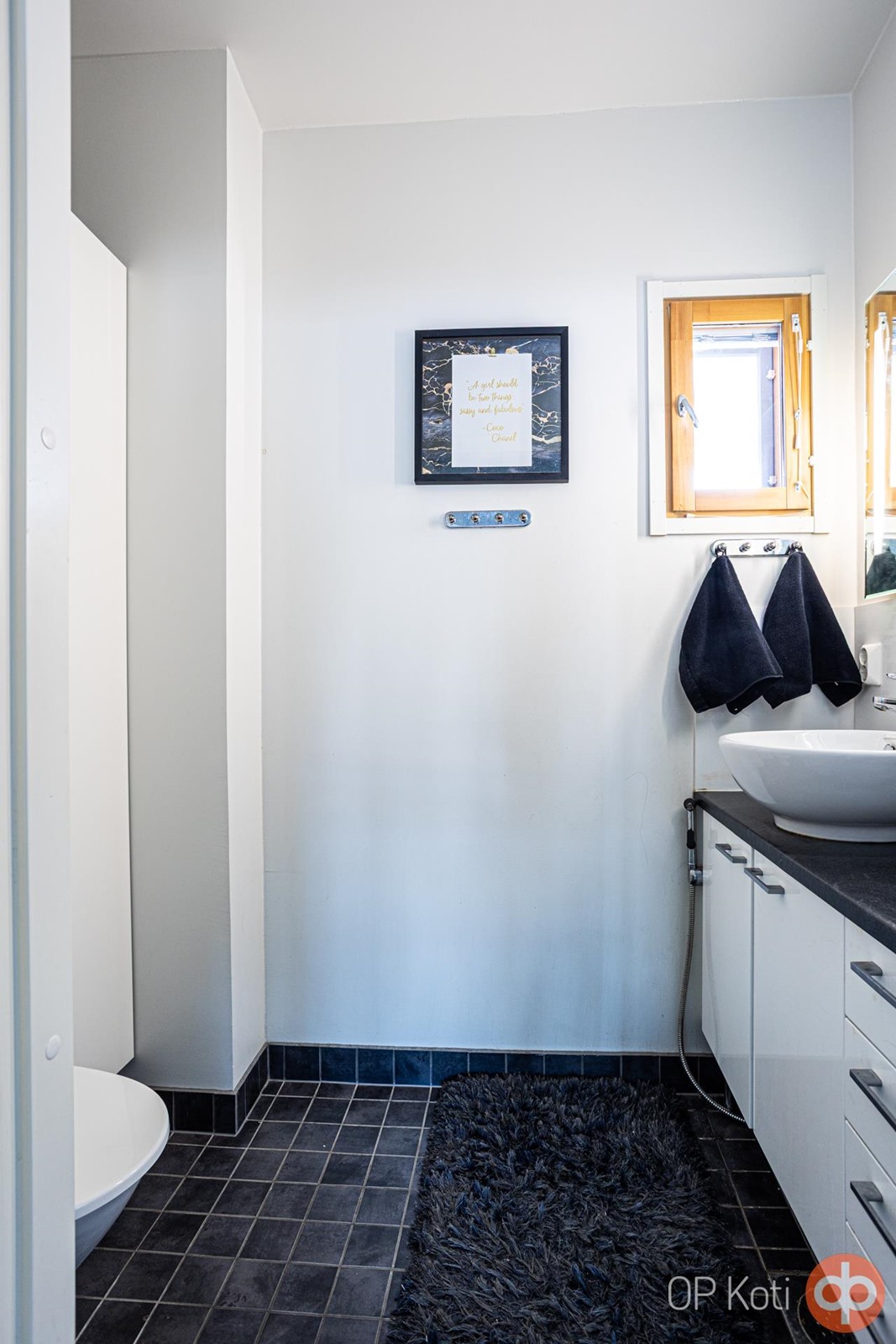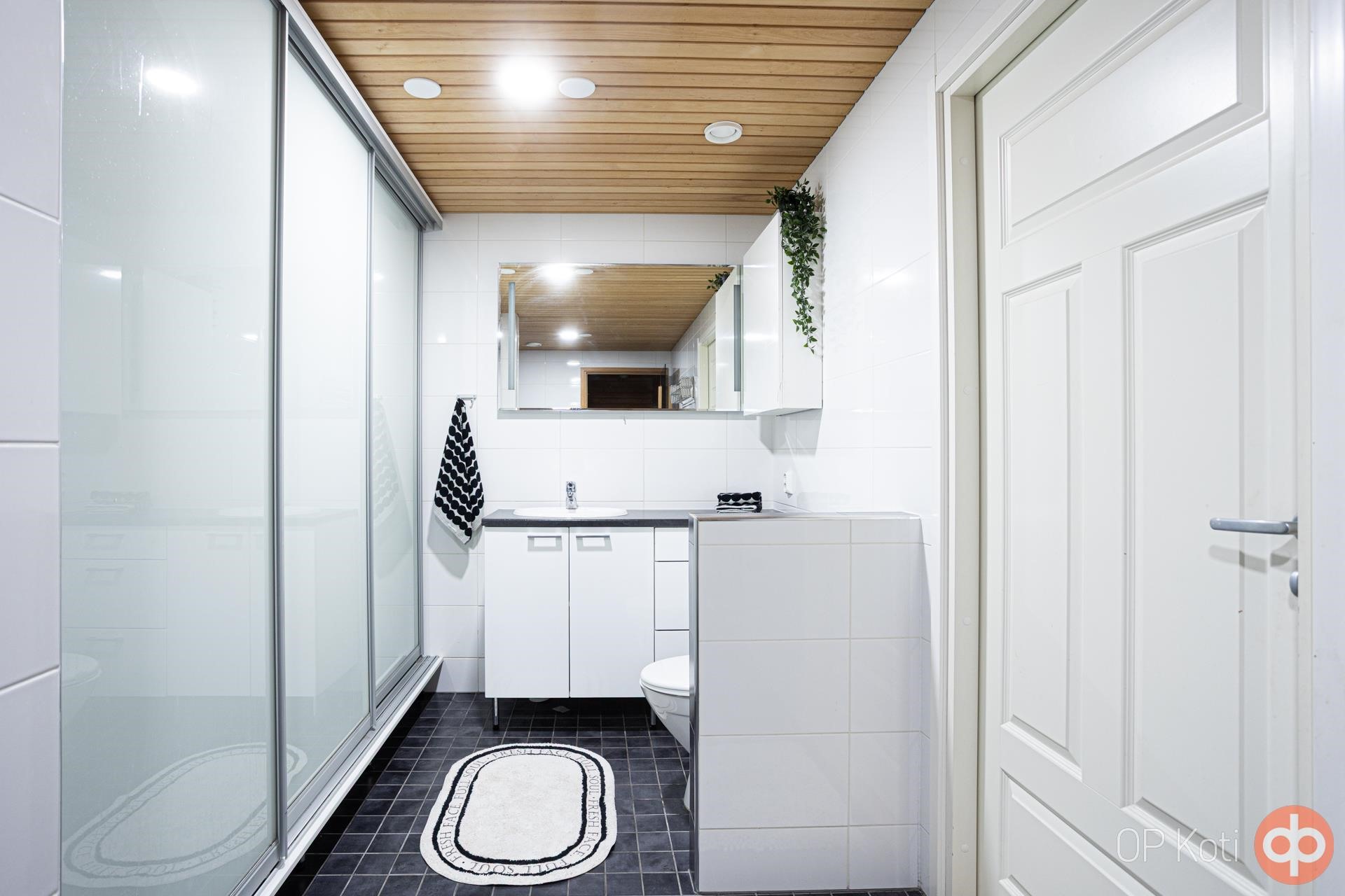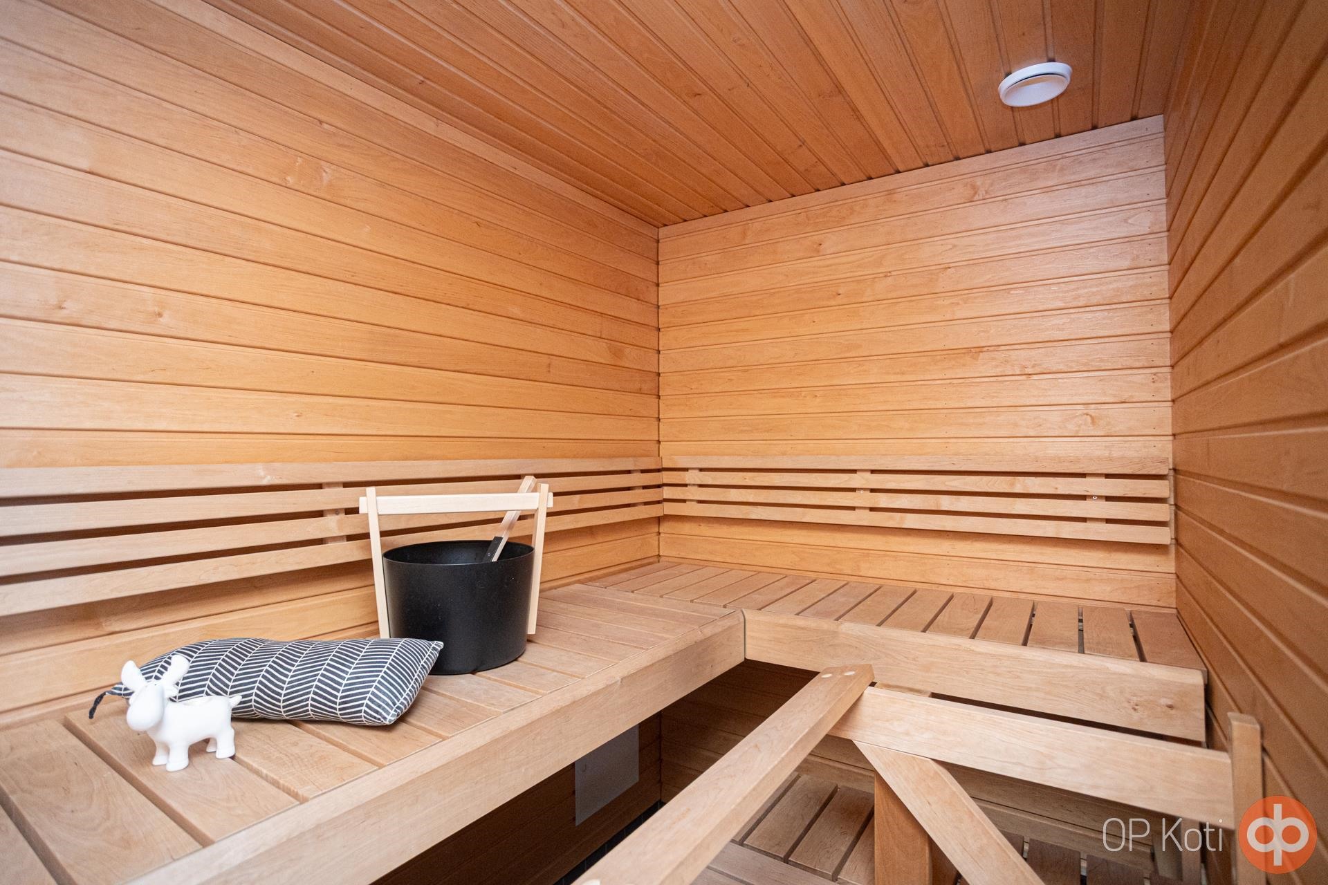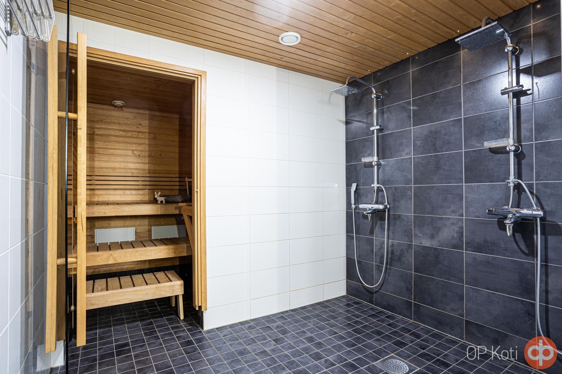 - Sauna, sähkökiuas, kylpyhuone, erillinen wc, suihku, peilit, peilikaappi, kaapit, allaskaappi, pesukoneliitäntä, lattialämmitys, kiinteät valaisimet.