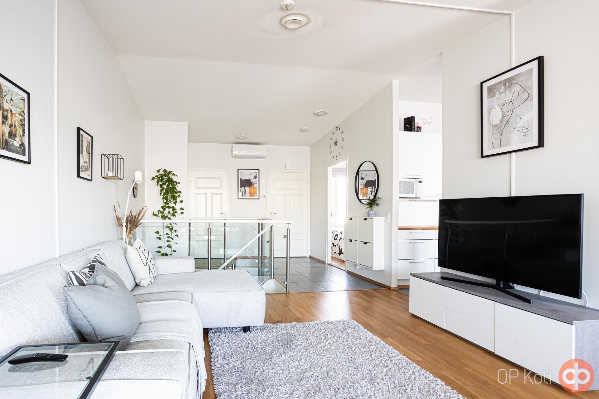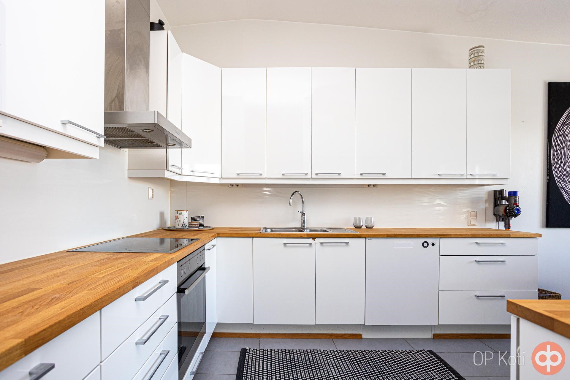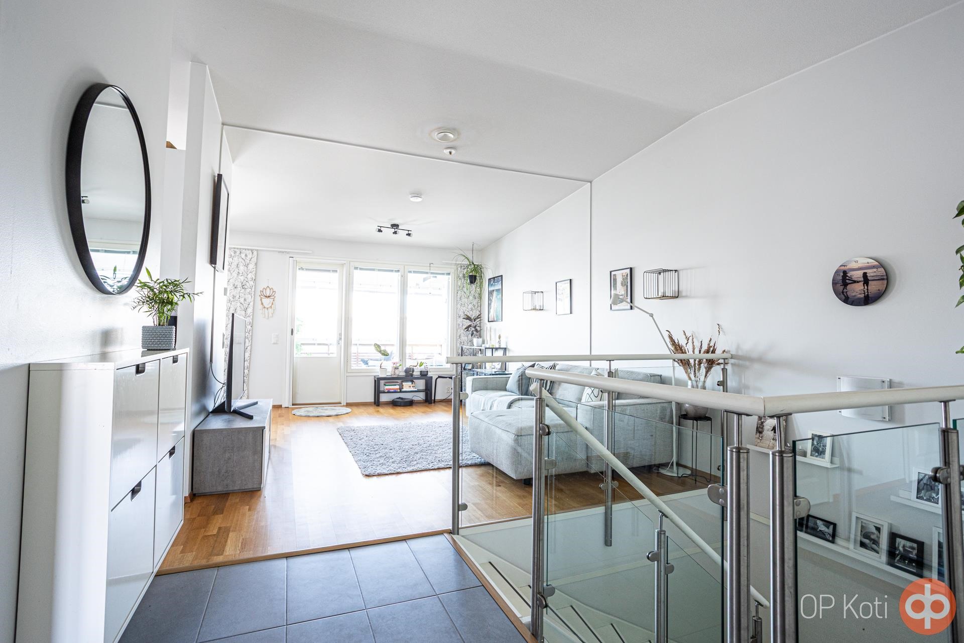 Asunto on kaksitasoinen, mikä tuo mukavasti tilaa ja selkeyttä asumiseen. Tilava kylpyhuone ja oma sauna lisäävät asumismukavuutta. Keittiö on siisti ja toimiva kokonaisuus, jossa on hyvin tilaa ruoanlaittoon ja arjen askareisiin.